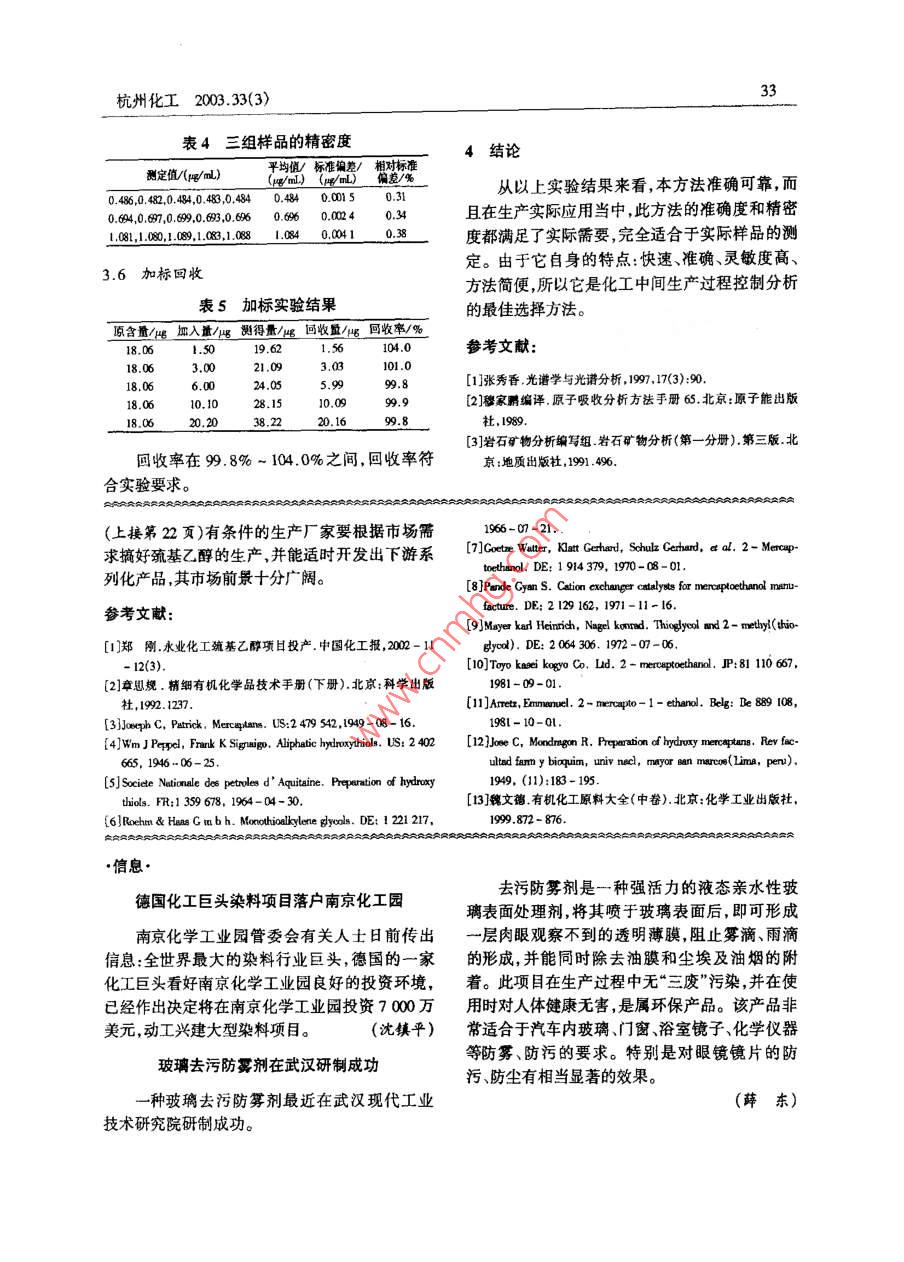 杭州化工2003.33(3)21巰基乙醇的性質(zhì)、生產(chǎn)及應(yīng)用張亨(錦西化工研究院,遼寧葫蘆島125001)摘要:綜述了巰基乙醇的物理、化學(xué)性質(zhì)、環(huán)氧乙烷法等生產(chǎn)方法和用途。關(guān)鍵詞:巰基乙醇;生產(chǎn);應(yīng)用右,遠(yuǎn)遠(yuǎn)不能滿足國(guó)內(nèi)市場(chǎng)的需求,每年尚需從1前言國(guó)外進(jìn)口千余噸。巰基乙醇是一種用作有機(jī)合成中間體的硫2002年11月初,四川永業(yè)化工有限公司醇化合物,可廣泛用于農(nóng)藥、醫(yī)藥、合成橡膠、塑3000a基乙醇項(xiàng)目在遂寧投產(chǎn)將使我國(guó)生料、樹脂、涂料、染料、紡織、油漆等行業(yè)。聚合級(jí)產(chǎn)高聚物腈綸農(nóng)藥等的用戶擺脫進(jìn)口束縛,并高純巰基乙醇可用作氯乙烯、丙烯腈等的調(diào)聚使國(guó)家正在籌建中的3套30萬a腈綸生產(chǎn)線劑、聚合催化劑、聚合交聯(lián)劑以及固化劑。本品有充足的調(diào)聚劑。得到美國(guó)食品藥物管理局的批準(zhǔn),可用作丙烯腈、苯乙烯、甲基丙烯酸甲酯三元樹脂制食品包2性質(zhì)裝用吹塑容器時(shí)的添加劑。巰基乙醇(2)又名2-巰基乙醇、硫醇基乙醇、以前,巰基乙醇的國(guó)內(nèi)生產(chǎn)廠家有浙江省慈硫代乙二醇、2-羥基乙硫醇,為無色或淺黃色透溪農(nóng)藥ㄏ、河北石家莊農(nóng)藥廠、黑龍江大慶石油明易流動(dòng)液體,在堿性條件和鹽酸中易于分解,化工總廠、四川省精細(xì)化工研究設(shè)計(jì)所、黑龍江有特殊臭味,相對(duì)分子質(zhì)量78.13易溶于水、乙哈爾濱石油化學(xué)研究所、天津化學(xué)試劑二廠、上醇和乙醚等有機(jī)溶劑,與苯可以任意比例混溶。海試劑一廠等,生產(chǎn)規(guī)模小,年總產(chǎn)量?jī)H200t左其物理性質(zhì)見表1表1巰基乙醇的物理性質(zhì)沸點(diǎn)/℃凝固點(diǎn)/C98.92kpa2.40ka1.73ka折射率粘度(20℃)密度蒸汽壓蒸汽密度閃點(diǎn)/℃稍有分解-100157~15858551.49963.431114.3133.32.6973.9巰基乙醇含有一SH和一OH,兼有硫醇和醇金屬硫醇鹽的化學(xué)性質(zhì)。能與多種金屬發(fā)生陽(yáng)離子反應(yīng),生成硫醇鹽;與烷基鹵代物和芳基鹵代物反應(yīng)生成 RX. HOCH CHh SR硫醚;與醛和酮在酸催化下,生成氧硫雜環(huán)化合自縮合物;有酸存在受熱時(shí),巰基乙醇可脫水發(fā)生自縮 HOCH: CH, SHHOCH CHI SCH CH SH合反應(yīng)該反應(yīng)可無限制地進(jìn)行,直到白色的固 RCRR體生成。巰基乙醇在氯化鋅作用下發(fā)生脫水反應(yīng)生成二硫化物,該反應(yīng)是巰基乙醇用作生化還原劑的基礎(chǔ)。其化學(xué)性質(zhì)見圖1圖1巰基乙醇的化學(xué)性質(zhì)22杭州化工2003.33(3)3制備及生產(chǎn)方法3-25毒性、安全及防護(hù)3.1氯乙醇法吸人本品蒸汽,開始為運(yùn)動(dòng)性興奮,然后是1862年, Carius首先用氯乙醇與硫氫化鈉反長(zhǎng)時(shí)間無力、抽搐、呼吸減慢、死亡。刺激皮膚,應(yīng)制得巰基乙醇。因氯乙醇由環(huán)氧乙烷制得,該容易透過皮膚吸收,應(yīng)帶防護(hù)手套及防毒面具操法現(xiàn)在基本不用。作。小鼠經(jīng)口LD為345mg/kg,大鼠為300mghoch2ch2cl+ NaHSHOCH22ch2h+naClkg??諝庵凶罡呷菰S質(zhì)量濃度為1mg/m,但無致3.2二硫化物法癌性。巰基乙醇可燃,遇高熱或火種有燃燒爆炸二硫化物如(HOCH2CH2S)2在還原劑鋅粉和的危險(xiǎn),巰基乙醇火焰可用抗溶性泡沫、二氧化硫酸的作用下生成巰基乙醇,該法在工業(yè)上很少碳、干粉撲滅。使用。 (HOCH2CH,S) HSO 7nHOCH2CH2SH6應(yīng)用3.3環(huán)氧乙烷法巰基乙醇是重要的有機(jī)合成中間體,用于合環(huán)氧乙烷法是巰基乙醇的最佳生產(chǎn)方法由成農(nóng)藥、醫(yī)藥、染料等;在橡膠、紡織、塑料、涂料環(huán)氧乙烷與硫化氫在一定溫度、壓力條件下反應(yīng)工業(yè)中亦可用作助劑。6.1農(nóng)藥生成,產(chǎn)物常是巰基乙醇與硫二甘醇混合物。巰基乙醇和乙酰乙酰替苯胺、亞硫酰氯等反 CH2-CH2 o +HSHOCHCHSH應(yīng)得萎銹靈,可防治小麥葉銹病、豆銹病、大麥散黑穗病、棉花立枯病、黃萎病等。巰基乙醇和異 CH2-CH2氰酸酯反應(yīng),生成硫代氨基甲酸酯,為內(nèi)吸性廣+HOCHCHSH-譜殺蟲劑及除草劑。該法 Alexis Chichibabin在134年首次6.2鏈轉(zhuǎn)移劑提出,后來經(jīng)過多次改進(jìn)成為目前工業(yè)上生產(chǎn)巰聚合物分子質(zhì)量取決于聚合溫度。為了獲基乙醇的方法。該法根據(jù)反應(yīng)條件的不同,可得得相對(duì)分子質(zhì)量較低的樹脂須采取較高的聚合到不同比例的巰基乙醇和硫二甘醇。反應(yīng)中使溫度但由于樹脂本身具有熱不穩(wěn)定性的特性,用的催化劑有陰離子、陽(yáng)離子交換樹脂、活性氧故在制取低分子質(zhì)量的樹脂時(shí),一般均采用比其化鋁、氫氧化鈣等堿土及堿金屬氫氧化物等。反單體活性大的鏈轉(zhuǎn)移劑,這樣可在較低溫度生產(chǎn)應(yīng)溫度20~60℃,反應(yīng)壓力3.54~506.5MPa。反低分子質(zhì)量的聚合物其中使用基乙醇鏈轉(zhuǎn)應(yīng)中使H2S過量有利于提高巰基乙醇的產(chǎn)量。移效果最好巰基乙醇主要用于PVC熱穩(wěn)定該法生產(chǎn)巰基乙醇收率可達(dá)到90%以上,同時(shí)副Cc、VC和乙烯化合物的接枝共聚物、芳基樹產(chǎn)硫二甘醇,尾氣硫化氫用堿吸收成硫氫化鈉,脂、光電導(dǎo)體樹脂、乙烯酯聚合物乳液、聚丙烯用于重新產(chǎn)生硫