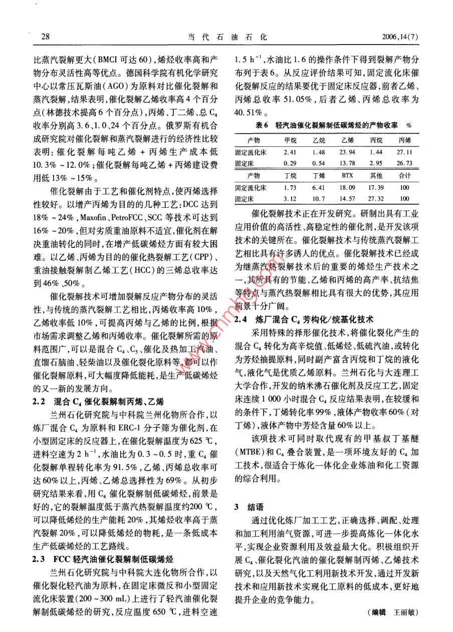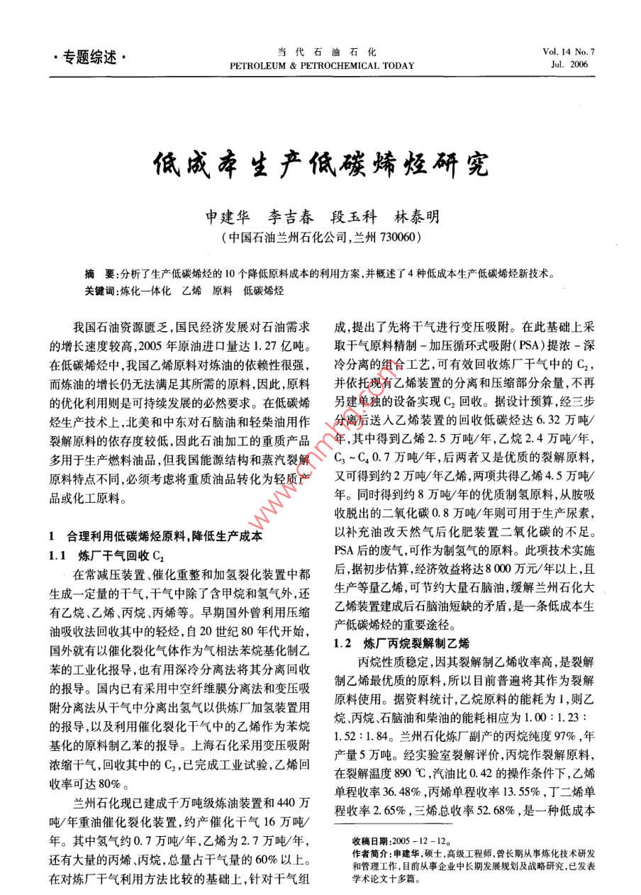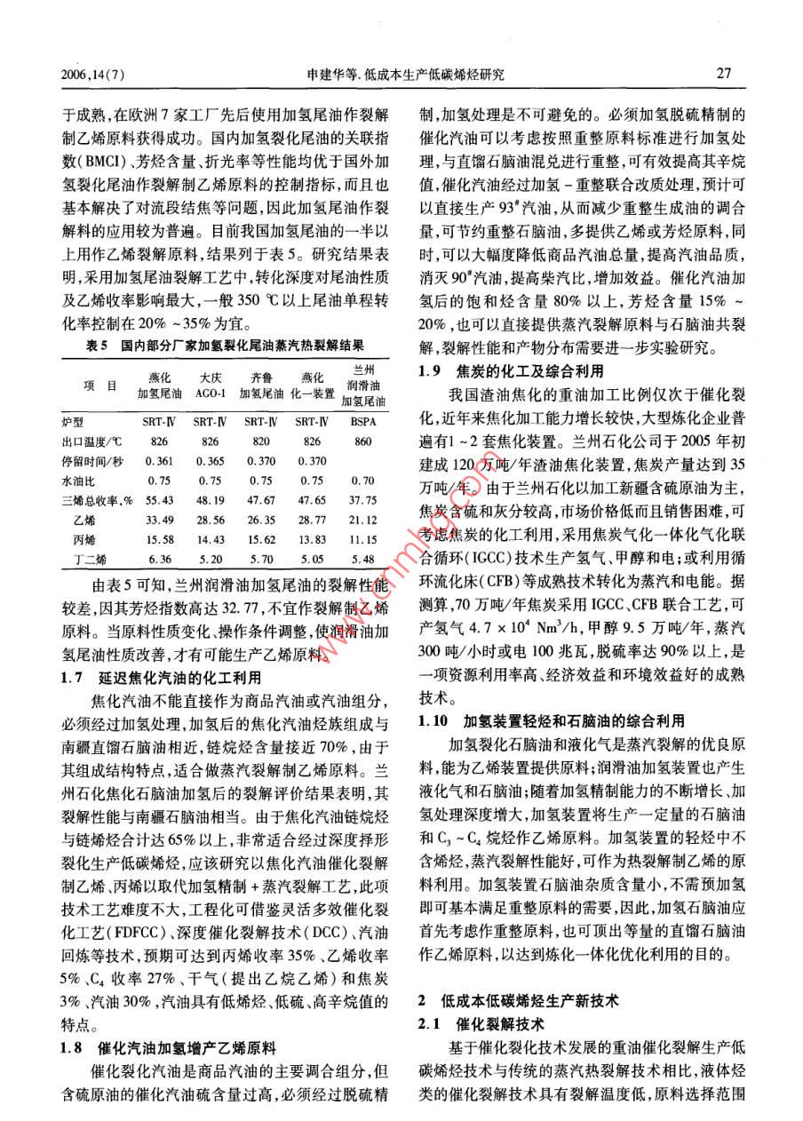 ●專題綜述●當(dāng)代石油石化Vol. 14 No.7PETROLEUM & PETROCHEMICAL TODAYJul. 2006低成本生產(chǎn)低碳烯烴研究申建華李吉春段玉科林泰明(中國石油蘭州石化公司,蘭州730060)摘要:分析了生產(chǎn)低碳烯烴的 10個降低原料成本的利用方案,并概述了4種低成本生產(chǎn)低碳烯烴新技術(shù)。關(guān)鍵詞:煉化一體化乙烯原料低碳烯烴我國石油資源匱乏,國民經(jīng)濟(jì)發(fā)展對石油需求成,提出了先將干氣進(jìn)行變壓吸附。在此基礎(chǔ)上采的增長速度較高,2005年原油進(jìn)口量達(dá)1. 27億噸。取干氣原料精制-加壓循環(huán)式吸附(PSA)提濃-深在低碳烯烴中,我國乙烯原料對煉油的依賴性很強(qiáng),冷分離的組合工藝,可有效回收煉廠干氣中的C2,而煉油的增長仍無法滿足其所需的原料,因此,原料并依托現(xiàn)有乙烯裝置的分離和壓縮部分余量,不再的優(yōu)化利用則是可持續(xù)發(fā)展的必然要求。在低碳烯另建單獨(dú)的設(shè)備實現(xiàn)C2回收。據(jù)設(shè)計預(yù)算,經(jīng)三步烴生產(chǎn)技術(shù)上,北美和中東對石腦油和輕柴油用作分離后送人乙烯裝置的回收低碳烴達(dá)6.32萬噸/裂解原料的依存度較低,因此石油加工的重質(zhì)產(chǎn)品年,其中得到乙烯2.5萬噸/年,乙烷2.4萬噸/年,多用于生產(chǎn)燃料油品,但我國能源結(jié)構(gòu)和蒸汽裂解C3~C.0.7萬噸/年,后兩者又是優(yōu)質(zhì)的裂解原料,原料特點(diǎn)不同,必須考慮將重質(zhì)油品轉(zhuǎn)化為輕質(zhì)產(chǎn)又可得到約2萬噸/年乙烯,兩項共得乙烯4.5萬噸/品或化工原料。年。同時得到約8萬噸/年的優(yōu)質(zhì)制氫原料,從胺吸收脫出的二氧化碳0.8萬噸/年則可用于生產(chǎn)尿素,1合 理利用低碳烯烴原料,降低生產(chǎn)成本以補(bǔ)充油改天然氣后化肥裝置二氧化碳的不足。.PSA后的廢氣,可作為制氫氣的原料。此項技術(shù)實施1.1 煉廠干氣回收C2在常減壓裝置、催化重整和加氫裂化裝置中都后,據(jù)初步估算,經(jīng)濟(jì)效益將達(dá)8000萬元/年以上,且生成一-定量的干氣,干氣中除了含甲烷和氫氣外,還生產(chǎn)等量乙烯,可節(jié)約大量石腦油,緩解蘭州石化大有乙烷、乙烯、丙烷、丙烯等。早期國外曾利用壓縮乙烯裝置建成后石腦油短缺的矛盾,是一條低成本生油吸收法回收其中的輕烴,自20世紀(jì)80年代開始,產(chǎn)低碳烯烴的重要途徑。國外就有以催化裂化氣體作為氣相法苯烷基化制乙1.2 煉廠丙烷裂解制乙烯苯的工業(yè)化報導(dǎo),也有用深冷分離法將其分離回收丙烷性質(zhì)穩(wěn)定,因其裂解制乙烯收率高,是裂解的報導(dǎo)。國內(nèi)已有采用中空纖維膜分離法和變壓吸制乙烯最優(yōu)質(zhì)的原料,所以目前普遍將其作為裂解附分離法從干氣中分離出氫氣以供煉廠加氫裝置用原料使用。據(jù)資料統(tǒng)計,乙烷原料的能耗為1,則乙的報導(dǎo),以及利用催化裂化干氣中的乙烯作為苯烷烷、丙烷石腦油和柴油的能耗相應(yīng)為1.00: 1.23 :基化的原料制乙苯的報導(dǎo)。上海石化采用變壓吸附1.52:1. 84。蘭州石化煉廠副產(chǎn)的丙烷純度97% ,年濃縮千氣,回收其中的C2,已完成工業(yè)試驗,乙烯回產(chǎn)量5萬噸。經(jīng)實驗室裂解評價,丙烷作裂解原料,在裂解溫度890 C ,汽油比0.42的操作條件下,乙烯收率可達(dá)80%。蘭州石化現(xiàn)已建成千萬噸級煉油裝置和440萬單程收率36. 48% ,丙烯單程收率13. 55%,丁二烯單噸/年重油催化裂化裝置,約產(chǎn)催化干氣16萬噸/程收率2.65%,三烯總收率52.68% ,是一種低成本年。其中氫氣約0.7萬噸/年,乙烯為2.7萬噸/年,收稿日期:2005 -12-12。還有大量的丙烯、丙烷,總量占干氣量的60%以上。作者簡介:申建華.碩士,高級工程師,曾長期從事煉化技術(shù)研發(fā)和管理工作,目前從事企業(yè)中長期發(fā)展規(guī)劃及戰(zhàn)略研究,已發(fā)表在對煉廠干氣利用方法比較的基礎(chǔ)上,針對干氣組學(xué)術(shù)論文十多篇。26當(dāng)代石油石化2006,14(7)生產(chǎn)低碳烯烴的優(yōu)質(zhì)裂解原料。1.4 重整拔頭油作蒸汽裂解乙烯原料1.3 C, 烴裂解生產(chǎn)低碳烯烴拔頭油是催化重整裝置原料的拔頂油,餾程為烴類蒸汽熱裂解和催化裂化裝置都副產(chǎn)相當(dāng)數(shù)初餾點(diǎn)至60 C,實際上是一種直餾輕石腦油,占重量的C,餾分,烴類熱裂解裝置的副產(chǎn)C,以烯烴(丁整原料的 15% ~ 20% ,拔頭油年產(chǎn)量約5萬噸,主.二烯、異丁烯、正丁烯)為主,烯烴含量高,烷烴含量要由C,、Cs烷烴組成,與吐哈輕烴的性質(zhì)相類似,拔低。催化裂化Cs烴中烷烴含量高,以丁烷、異丁烷.頭油的密度為0.62g/cem',吐哈油田輕烴的密度為為主,丁二烯含量很低,2-丁烯的含量高于1-丁烯。0.6499g/cm',拔頭油比油田輕烴還輕。表3列出2000年統(tǒng)計資料表明:國內(nèi)C4產(chǎn)量已超過200萬噸/了 拔頭油單獨(dú)裂解,與乙烷和石腦油共裂解的產(chǎn)物年,大部分作為燃料使用,尚需部分進(jìn)口。由于C,中分布。由表3可知:拔頭油單獨(dú)裂解時乙烯收率和各異構(gòu)體的物理性質(zhì)與化學(xué)性質(zhì)均很接近,它們之間三烯總收率均高于與石腦油混合裂解收率,因此拔的沸點(diǎn)很相近,相對揮發(fā)度小,很難從Cq餾分中用蒸頭油不宜與石腦油共裂解,究其原因是裂解深度不.餾方法得到各組分。表1列出了在汽油比0.5,裂解一致造成的。溫度880 C ,停留時間0.1