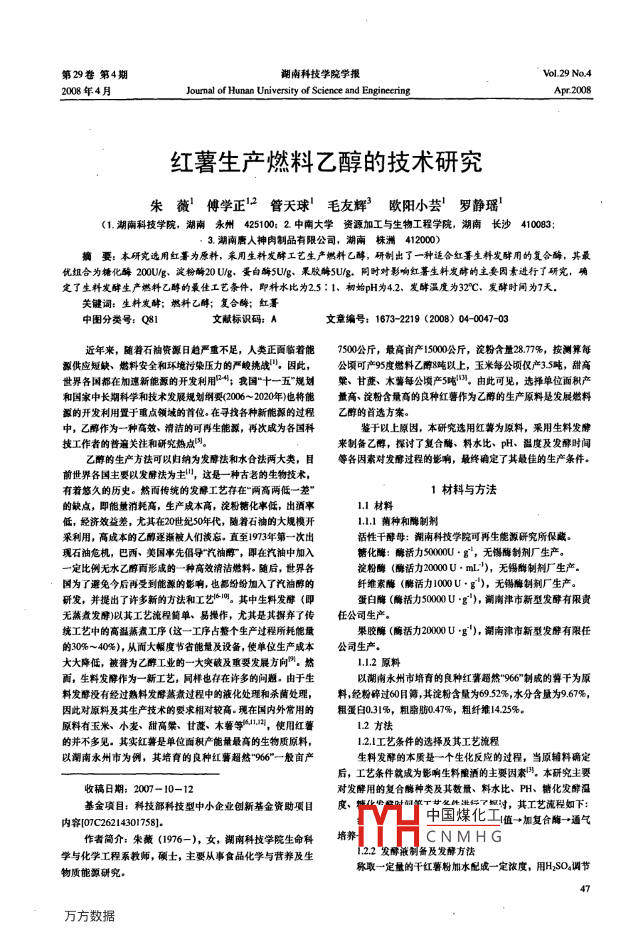 第29卷第4期湖南科技學(xué)院學(xué)報(bào)Vol 29 No, 42008年4月Jourmal of Hunan University of Science and EngineeringApr 2008紅薯生產(chǎn)燃料乙醇的技術(shù)研究朱薇傅學(xué)正2管天球!毛友輝歐陽(yáng)小蕓羅靜瑤(1湖南科技學(xué)院,湖南永州425100:2中南大學(xué)資源加工與生物工程學(xué)院,湖南長(zhǎng)沙4100833.湖南唐人神肉制品有限公司,湖南株洲412000摘要:本研究選用紅薯為原料,采用生料發(fā)酵工藝生產(chǎn)燃料乙酵,研制出了一種適合紅薯生料發(fā)酵用的復(fù)合酶,其最優(yōu)組合為糖化酶200U/g、淀粉酶20U作g、蛋白酶5U作g、果膠酶5Ug.同時(shí)對(duì)彩響紅薯生料發(fā)酵的主要因素進(jìn)行了研究,確定了生料發(fā)酵生產(chǎn)燃料乙醇的最佳工藝條件,即料水比為25:1、初始pH為42、發(fā)酵溫度為32°C、發(fā)酵時(shí)間為7天關(guān)鍵詞:生料發(fā)酵;燃料乙酵;復(fù)合酶;紅著中圖分類(lèi)號(hào):Q81文獻(xiàn)標(biāo)識(shí)碼:A文章編號(hào):1673-2219(2008)040047-03近年來(lái),隨著石油資源日趨嚴(yán)重不足,人類(lèi)正面臨著能7500公斤,最高畝產(chǎn)15000公斤,淀粉含量287%,按測(cè)算每源供應(yīng)短缺、燃料安全和環(huán)境污染壓力的嚴(yán)峻挑戰(zhàn)。因此,公頃可產(chǎn)95度燃料乙醇8噸以上,玉米每公頃僅產(chǎn)35噸,甜高世界各國(guó)都在加速新能源的開(kāi)發(fā)利用4;我國(guó)“十一五”規(guī)劃粱、甘蔗、木薯每公頃產(chǎn)5噸由此可見(jiàn),選擇單位面積產(chǎn)和國(guó)家中長(zhǎng)期科學(xué)和技術(shù)發(fā)展規(guī)劃綱要(2006~2020年)也將能量高、淀粉含量高的良種紅薯作為乙醇的生產(chǎn)原料是發(fā)展燃料源的開(kāi)發(fā)利用置于重點(diǎn)領(lǐng)域的首位。在尋找各種新能源的過(guò)程乙醇的首選方案。中,乙醇作為一種高效、清潔的可再生能源,再次成為各國(guó)科鑒于以上原因,本研究選用紅喜為原料,采用生料發(fā)酵技工作者的普遍關(guān)注和研究熱點(diǎn)來(lái)制備乙醇,探討了復(fù)合酯、料水比、pH、溫度及發(fā)酵時(shí)間乙醇的生產(chǎn)方法可以歸納為發(fā)酵法和水合法兩大類(lèi),目等各因素對(duì)發(fā)酵過(guò)程的影響,最終確定了其最佳的生產(chǎn)條件。前世界各國(guó)主要以發(fā)酵法為主叫,這是一種古老的生物技術(shù),有著悠久的歷史。然而傳統(tǒng)的發(fā)酵工藝存在“兩高兩低一差”1材料與方法的缺點(diǎn),即能量消耗高,生產(chǎn)成本高,淀粉糖化率低,出酒率1.1材料低,經(jīng)濟(jì)效益差,尤其在20世紀(jì)50年代,隨著石油的大規(guī)模開(kāi)11.1菌種和酶制劑采利用,高成本的乙醇還漸被人們淡忘。直至1973年第一次出活性千酵母:潮南科技學(xué)院可再生能源研究所保藏現(xiàn)石油危機(jī),巴西、美國(guó)率先倡導(dǎo)“汽油醇”,即在汽油中加入糖化酶:酶活力50000g,無(wú)錫酶制劑廠(chǎng)生產(chǎn)。定比例無(wú)水乙醇而形成的一種高效清潔燃料。隨后,世界各淀粉酶(酶活力20000mL),無(wú)錫酶制劑廠(chǎng)生產(chǎn)。國(guó)為了避免今后再受到能源的影響,也都紛紛加入了汽油醇的纖維素酶(酶活力1000U·g"),無(wú)錫酶制劑廠(chǎng)生產(chǎn)。研發(fā),并提出了許多新的方法和工藝價(jià)。其中生料發(fā)酵(即蛋白酶(酶活力5000Ug"),湖南津市新型發(fā)酵有限責(zé)蒸煮發(fā)酵)以其工藝流程筒單、易操作,尤其是其摒棄了傳任公司生產(chǎn)。統(tǒng)工藝中的高溫蒸煮工序(這一工序占整個(gè)生產(chǎn)過(guò)程所耗能量果膠酶(酶活力2000g"),湖南津市新型發(fā)酵有限任的30%~40%),從而大幅度節(jié)省能量及設(shè)備,使單位生產(chǎn)成本公司生產(chǎn)。大大降低,被譽(yù)為乙醇工業(yè)的一大突破及重要發(fā)展方向。然1.2原料而,生料發(fā)酵作為一新工藝,同樣也存在許多的問(wèn)題。由于生以湖南永州市培育的良種紅薯超然“966制成的蔣干為原料發(fā)酵沒(méi)有經(jīng)過(guò)熟料發(fā)酵蒸煮過(guò)程中的液化處理和殺菌處理,料經(jīng)粉碎過(guò)60目篩其淀粉含量為6952%,水分含量為967%,因此對(duì)原料及其生產(chǎn)技術(shù)的要求相對(duì)較高?,F(xiàn)在國(guó)內(nèi)外常用的粗蛋臼0.31%,粗脂肪047%,粗纖維1425%。原料有玉米、小麥、甜高粲、甘蔗、木薯等仙1,使用紅薯12方法的并不多見(jiàn)。其實(shí)紅蔣是單位面積產(chǎn)能量最高的生物質(zhì)原料12l工藝條件的選擇及其工藝流程以湖南永州市為例,其培育的良種紅薯超然“966”一般畝產(chǎn)生料發(fā)酵的本質(zhì)是一個(gè)生化反應(yīng)的過(guò)程,當(dāng)原輔料確定后,工藝條件就成為影響生料酸酒的主要因素。本研究主要收稿日期:2007-10-12對(duì)發(fā)酵用的復(fù)合酶種類(lèi)及其數(shù)量、料水比、PH、糖化發(fā)酵溫基金項(xiàng)目:科技部科技型中小企業(yè)創(chuàng)新基金資助項(xiàng)目度、背“件過(guò),其工藝流程如下內(nèi)容[o7C26214301758]。作者簡(jiǎn)介:朱薇(1976-),女,湖南科技學(xué)院生命科培養(yǎng)CNMHG學(xué)與化學(xué)工程系教師,碩士,主要從事食品化學(xué)與營(yíng)養(yǎng)及生1.2.2發(fā)酵液制備及發(fā)酵方法物質(zhì)能源研究稱(chēng)取一定量的干紅薯粉加水配成一定濃度,用HSO4調(diào)節(jié)成不同的pH,加入不同比例的復(fù)合酶及酵母攪拌均勻,然后酶