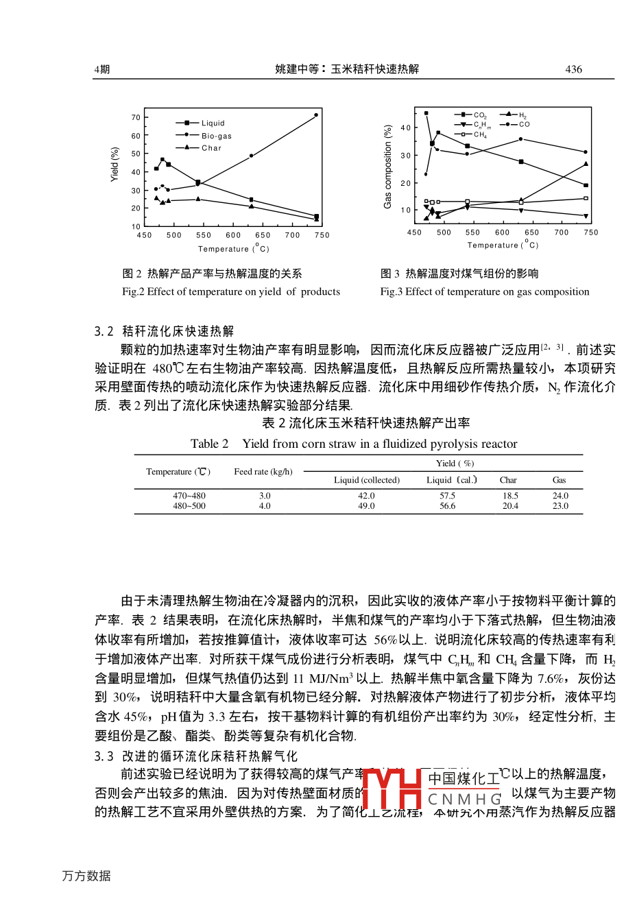 第21卷第4期化工治金2000年10月Engineering Chemistry MetallurgyOct.2000·綠色化學與技術專欄玉米秸稈快速熱解姚建中,陳洪章,張均榮’,李桂蘭’,萬寶春(1.中國科學院化工冶金研究所,北京100080;2.河北省環(huán)境保護研究所,河北石家莊050051)摘要在不同傳熱狀態(tài)下進行了玉米秸稈粉料的熱解氣化實驗』探索了玉米秸稈快速熱解制生物油的工藝條件,結果表明:在480咒℃左右的溫度下,實收45%左右的液體產品.采用改進的固體熱載體循環(huán)流化技術;秸稈粉料也能實現連續(xù)髙溫熱解υ不用富氧和蒸汽作流化劑;在70℃C以上獲得了熱值大于11MJ∧Nm的生物煤氣.關鍵詞:生物質;秸稈;快速熱解;氣化;流化床中圖分類號TQ352.4文獻標識碼A文章編號1001-2052(200004-.0434041前言我國石油、天然氣資源不足,煤炭雖然儲量豐富,但由燃燒引起的大氣污染日趨嚴重SO2排放量增加,使酸雨區(qū)擴大到國士面積的40%,CO2排放量已居世界第二另一方面,我國農村人口占70%以上,隨著農村城市化進程的加快,對優(yōu)質能源的需求日趨增加,商品能源的供需矛盾將更加突岀.從長遠看,生物質能源可逐步取代傳統的化石能源,而成為人類未來的能源和化學原料的重要來源之一.在眾多生物質轉化技術中,快速熱解可較為簡單地將生物質轉化為燃料和化學品,且成本較低,成為國際上生物質利用研究的一個熱點,尤其是生物質快速熱解制生物油,其產品可替代現有運輸用燃料,目前正在進行多種工藝的實驗研究3.我國玉米秸稈年產量達2.5億噸,占農作物秸稈總量的40%,但玉米秸稈快速熱解的研究報道甚少.本文以玉米秸稈為對象,研究了投資較低、操作方便的快速熱解工藝2實驗物料和主要設備2.1實驗用原材料實驗所用玉米秸稈粉用錘片式粉碎機加工而得,為針狀和粉狀的混合物,直徑小于2m,長度小于10mm,粉料真密度1230kg/m3堆密度97kg/m3,其工業(yè)分析和元素分析見表1表1玉米秸稈粉的性質TablProperties of corn straw particlesElemental analysisHeat outpuBiomass constituentHydrogen 3.92376015.841840流化床床料和循環(huán)熱載體采用普通河砂,平均粒徑0.28mm,真密度2665kgm,堆密度1510kgm3,室溫下臨界流化速度Un=008n中國煤化工/sCNMHG收稿日期:1999-09-06,修回日期:1999-11-16作者簡介:姚建中(1943-男,浙江紹興人,大學畢業(yè),研究員,化學工程專!姚建中等:玉米秸稈快速熱解4352.2實驗流程和主要設備本項研究建立了一套綜合實驗系統,主要實驗流程如圖1所示.改變圖1中熱解反應器的結構和物流方向,可以進行三種傳熱方式的熱解實驗.需要加熱或保溫的設備和部件如熱解反應器、半焦燃燒器、分離器及調節(jié)閥等都用電熱控制調節(jié)溫度,冷凝器用二級水冷.2. Separat3. Butterfly valve4. Corn strawI 1. Filter5. Feeder8. Pyrolysis reactor9. Dust remover10. Condenser13. Cooling water7. Combustor2. V- valve16. Pump17. Biomass oil14. Air5. Nitroge圖1生物質熱解實驗流程圖Fig 1 Schematic diagram of biomass pyrolysis proces進行粉料下落式熱解實驗時,安裝的反應管內徑90mm,高2000mmn,-內裝多層可調擋板,從加料器5加λ的秸稈粉用氮氣夾帶邊下落邊熱解,熱解油氣在反應器8下段與半焦分離除塵后進入冷凝器10,分別收集冷凝產物和煤氣,半焦由下部料罐收集.縮短下落管長度,取消內構件,在下落管下端安裝一個內徑300mm的錐形噴動流化床,用氮氣作流化介質就可進行流化床熱解,其熱解流程與下落式基本相同.增加固體循環(huán)控制閥12、半焦燃燒器7、氣固分離器2后,就成為載體循環(huán)熱解氣化裝置.秸稈粉在熱解反應器8頂端與通過蝶閥3下落的高溫循環(huán)熱砂迅速混合,升溫、熱解.在反應器立管8下部油氣與半焦分離經除塵器9后進入冷凝器10,獲得液體產品和煤氣.半焦和循環(huán)砂通過空氣輸送的返料V閥12進入燃燒器7,加熱后的熱砂經分離器2與煙氣分離后重新進入熱解反應器8.載體循環(huán)供熱氣化的原理可參考文獻[4]3實驗結果和討論3.1玉米秸稈粉下落式熱解在粉料受到器壁和構件加熱下落的傳熱條件下,熱解溫度對熱解產品產率的影響如圖2所示.結果表明,在480℃左右液體收率最高,包括冷凝器沉積的全部收集量可達到45%左右,氣體產率較低,約為30%左右,半焦的產率接近25%.但隨著溫度的提高,液體收率明顯下降,而氣體產率明顯上升,在740℃時達到70%以上,而半焦的產率下降為13%左右.對玉米秸稈不同熱解溫度所獲煤氣的組份進行了分析,部分結果如圖3所示.從圖3可看出,隨熱解溫度的提高,煤氣中CO2濃度明顯下降,H2含量明顯增加,而CO,CnH,CH在實驗范圍內沒有顯著變化.根據成份計算的煤氣熱值一般均在16MNm3以上.隨著溫度提高,由于CO2濃度降低、H濃度增加,煤氣熱中國煤化工Nm.下落式熱解實驗結果表明,即使在顆粒由壁面和熱氣體傳熱的CNMH解產品的產率仍起顯著作用姚建中等:玉米秸稈快速熱解436蘇E82045050055060065070075450500550600650700750Temperature( C)圖2熱解產品產率與熱解溫度的關系圖3熱解溫度對煤氣組份的影響Fig2 Effect of temperature on yield of productsFig 3 Effect of temperature on gas composition3.2秸稈流化床快速熱解顆粒的加熱速率對生物油產率有明顯影響,因而流化床反應器被廣泛應用·3.前述實驗證明在480心左右生物油產率較高.因熱解溫度低,且熱解反應所需熱量較小,本項研究采用壁面?zhèn)鳠岬膰妱恿骰沧鳛榭焖贌峤夥磻?流化床中用細砂作傳熱介質,N作流化介質.表2列出了流化床快速熱解實驗部分結果.