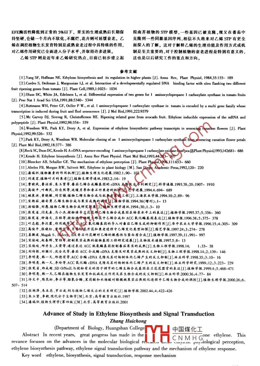 第5卷第2期黃山學院學報Vol.5 ,NO.22003年5月Joumal of Huangshan UniversityJune.2003乙烯的生物合成及信號傳導研究進展*張慧沖..(黃山學院生物系,安徽黃山,245021 )[摘要]:本文綜述了近幾年來有關(guān)乙烯生理作用、生物合成、乙烯信號傳導和乙烯的反應(yīng)機制研究的最新進展。[關(guān)鍵詞]:乙烯生物合成信號傳導途徑反 應(yīng)機制[中圖分類號]:Q94- -3 [文獻標識碼]:A [文章編號]:1672- -447X(2003)02- -0111-03乙烯(Ethylene)是植物體內(nèi)具有激素效應(yīng)的最簡單分子,的合成速度在不同植物間存在著較大的差異,根據(jù)乙烯生成但卻對植物生長發(fā)育的許多過程如種子萌發(fā)幼苗生長、開花量的多少和性質(zhì)可以劃分為微量乙烯和大量乙烯,根據(jù)果實結(jié)實、成熟和衰老等有廣泛而深刻的影響,乙烯參與逆境條件和花卉內(nèi)乙烯生成與否,把植物分為躍變型和非躍變型兩大下植物的脅迫反應(yīng),影響到植物體內(nèi)一系列脅迫反應(yīng)的開始和類。 到目前為止已報道的躍變型花卉有香石竹、滿天星、香豌植物抗性的變化。乙烯參與植物的抗病反應(yīng),尤其是轉(zhuǎn)反義乙豆、補血草、金魚草蝴蝶蘭等以蘭科、石竹科錦葵科等植物,烯形成酶基因植物的抗病性研究倍受重視。近年來對乙烯的生這類植物的開花和衰老與乙烯關(guān)系密切;非躍變型花卉有菊理作用認識生物合成途徑的確定、信號傳導的可能機制和反花、石刁柏干里紅等以百合科、天南星科菊科等植物.此類應(yīng)機制的研究取得了進展,下面主要對這幾個方面作綜述。對乙烯不敏1感19.0.2.21.1乙烯的生理作用(Physiological Perception2乙烯的生物合成(Ethylene Biosynthesis )of Ethylene)乙烯的生物合成途徑已經(jīng)確定69.7.7.,以甲硫氨酸為合乙烯在植物生長發(fā)育中的作用,實驗結(jié)果表明,乙烯在植成前體,經(jīng)s-腺苷甲硫氨酸(SAM)氨基環(huán)丙烷羧酸(ACC)而物體內(nèi)的作用方式它能調(diào)節(jié)它能調(diào)節(jié)RNA和蛋白質(zhì)的合成,.合成乙烯的,整個反應(yīng)過程順序由SAM合成酶、ACC合成酶并能夠調(diào)節(jié)細胞質(zhì)膜的透性11.1。在植物的生長發(fā)育過程中,(ACS)和ACC氧化酶(EFE)催化田。SAM 合成酶基因mRNA乙烯能夠促進果實的成熟、促進離層的形成和器官的脫落、加水平與乙烯的生物合成沒有明顯關(guān)系,SAM只有部分用于合速植物的衰老、促進次生物質(zhì)的排泌、參與植物的脅迫反應(yīng)成ACC產(chǎn)生乙烯,主要還是用于其它生物反應(yīng),如提供甲基(如病原侵染、干旱、傷害和水澇等)、使黃化幼苗頂端鉤展開、參加甲基化反應(yīng),用于多胺生物合成等m。ACC 合成酶和抑制幼苗伸長、促進根的形成,并與植物的性別分化及偏上性ACC氧化酶是乙烯生物合成的關(guān)鍵酶,ACC合成酶催化的反等功能有密切關(guān)1系5.10.0.0.0.0.31.當乙烯和生長素同時作用應(yīng)是乙烯合成的限速步驟,ACC氧化酶則是乙烯形成酶。ACS植物時其效果更為明顯。幼嫩果實中的乙烯含量極微,隨果實和EFE基因已從許多植物中分離并克隆8]兩個酶均由多個的成熟,乙烯合成加速,同時乙烯增加細胞質(zhì)膜的透性,使呼基因編碼,ACS在西紅柿中有9個基因,擬南芥有5個基因吸作用加速,引起果肉內(nèi)有機物的轉(zhuǎn)化,最終達到可食程度(6.3。目前已經(jīng)從許多植物中分離到了ACS基因的eDNA克(241,乙烯催熟果實已在生產(chǎn)上廣泛應(yīng)用。乙烯最早被人注意的隆D),最早分離到EFE基因克隆是1985年從西紅柿中得到的一個作用,當空氣中乙烯濃度相當?shù)蜁r,植物的葉片和果實即eDNA克隆(pToml3),但直到1990年才利用反義基因技術(shù)鑒可脫落。實際上在自然的脫落過程中也有乙烯的參與,乙烯對定出來(14)。在產(chǎn)生反義RNA的轉(zhuǎn)基因植物中,成熟果實和脫落的效果比脫落酸的效果明顯3。用濃度適宜乙烯利處理葉片中的ACC轉(zhuǎn)化為乙烯的過程受到抑制(12.24.21,, 說明植物,達到老葉衰老和脫落的作用,改善植物莖基部通風透光pTom13的表達是西紅柿果實表現(xiàn)EFE活性所要求的,進一條件,以及疏花、疏果的效果2.13.步研究表明,pTom13編碼的蛋白質(zhì)催化乙烯形成反應(yīng)還具一植物內(nèi)源乙烯的合成速度隨植物的生長發(fā)育進程會發(fā)生定的底物立體專-性,受到抗壞血酸物質(zhì)促進和Co2*的抑制明顯的變化..0.1如蘭花屬花卉開花后如果沒有授粉就可以等特點叫。ACS和EFE基因的表達方式是有差別的。盡管在保護不衰老,但一旦授粉便很快凋謝,研究發(fā)現(xiàn),授粉后花瓣誘導乙烯生物合成過程中ACS和EFE的酶活性都不斷地提大量合成乙烯,促進了它的迅速衰老;矮牽?;ㄖ辉谇宄块_高,與乙烯的釋放量的增加趨勢一致,但兩種酶的基因在轉(zhuǎn)錄放,,花瓣僅保鮮數(shù)小時,到上午9~10點開始萎蔫,至中午12~水平上的變化趨勢不同(9 FFF甚田的轉(zhuǎn)錄水平與酶活性及1點完全凋謝,其花瓣衰老與乙烯釋放量呈正相關(guān)。若將開放乙烯產(chǎn)量中國煤化工錄水平并不總反映.的花瓣用乙烯處理,能刺激花瓣的衰老131。并且植物內(nèi)源乙烯在酶活性CNMHG合成達到高峰以后,[收稿日期]:2002-09-10* * [作者簡介]:張慧沖(1962 -).男.黃山學院講師,從事《植物學》理論、 實驗的救學和研究.111乙烯的產(chǎn)量會迅速下降,這可能是ACS和EFE活性下降的烯信號傳導的初級途徑(PrimaryPathw