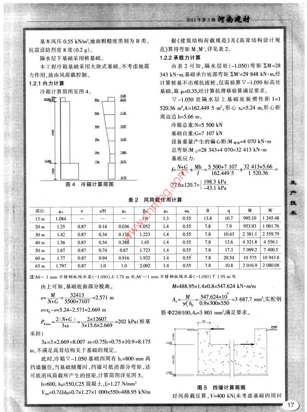 河南建材2013年第3期高算結(jié)構(gòu)之空分冷箱基礎(chǔ)結(jié)構(gòu)設(shè)計(jì)原理于憲軍中冶華天南京工程技術(shù)有限公司(210019)摘要:通過(guò)對(duì)空分冷箱基礎(chǔ)在自重、設(shè)備重、風(fēng)荷載、地震作用等豎向和水平力作用下的對(duì)比研究,分析了基礎(chǔ)埋置深度和結(jié)構(gòu)受力之間的關(guān)系。冷箱基礎(chǔ)計(jì)算應(yīng)包括地基承載力計(jì)算和變形計(jì)算,隔冷層熱工計(jì)算等。關(guān)鍵詞:冷箱;高聳結(jié)構(gòu);風(fēng)荷載;大塊式基礎(chǔ);埋深近年來(lái),隨著鋼鐵、化工等行業(yè)的發(fā)展,對(duì)氧時(shí)應(yīng)不考慮)。氣、氮?dú)獾瓤辗之a(chǎn)品的需求日益增長(zhǎng),制氧站的規(guī)冷箱分為三節(jié),各部分外形尺寸詳見(jiàn)表1。模也向大型化、超大型化發(fā)展。據(jù)悉國(guó)內(nèi)大型制氧表1外形尺寸站已達(dá)75000m/h,分餾塔(冷箱)體量越來(lái)越大,部位長(zhǎng)度A(m)寬度Bm)高度H(m)作為高聳結(jié)構(gòu),對(duì)基礎(chǔ)的設(shè)計(jì)要求越來(lái)越高。冷箱底部基礎(chǔ)在鋼鐵行業(yè)通常采用大塊式基礎(chǔ)。但作為大體中部7.27.8積混凝土,基礎(chǔ)混凝土用量很大,而且混凝土的水化頂部3.93生熱及傾覆等問(wèn)題較為突出,所以如何才能做到安全冷箱基礎(chǔ)外形尺寸詳見(jiàn)圖2。適用、經(jīng)濟(jì)合理,是亟待解決的問(wèn)題。以往多根據(jù)經(jīng)技驗(yàn)取用基礎(chǔ)埋置深度等數(shù)值不但造成極大的浪費(fèi),米而且會(huì)帶來(lái)一些不安全因素,故迫切需要研究解決基礎(chǔ)埋置深度與風(fēng)荷載的對(duì)應(yīng)關(guān)系,合理取值,優(yōu)化設(shè)計(jì)。通過(guò)工程實(shí)例對(duì)基礎(chǔ)混凝土擋墻的抗彎抗剪與隔水層以上基礎(chǔ)埋置深度進(jìn)行了分析,得出了建設(shè)性結(jié)論,為冷箱等高聳結(jié)構(gòu)基礎(chǔ)的設(shè)計(jì)提供具有參考價(jià)值的建議。1工程實(shí)例1.1初始條件本工程為某鋼廠20000m沿h制氧工程冷箱高圖2冷箱基礎(chǔ)度約60m,建成后效果見(jiàn)圖1?;A(chǔ)剖面詳見(jiàn)圖3。m界不傷法真5圖1冷箱建成后效果冷箱總重:5500kN珠光砂重量:2600kN圖3冷箱基礎(chǔ)剖面圖工作時(shí)液體重量:1700N(當(dāng)對(duì)結(jié)構(gòu)計(jì)算有利12計(jì)算理論1623年第3期河南建材基本風(fēng)壓05kN/m,地面粗糙度類別為B類,據(jù)《建筑結(jié)構(gòu)荷載規(guī)范》及《高聳結(jié)構(gòu)設(shè)計(jì)規(guī)抗震設(shè)防烈度8度(0.2g)。范》算得彎矩M、M,詳見(jiàn)表2。隔水層下基礎(chǔ)采用樁基礎(chǔ)。122承載力計(jì)算本工程冷箱基礎(chǔ)采用大塊式基礎(chǔ),不考慮地震由表2可知,隔水層處(-1.050)彎矩∑M力作用,故由風(fēng)荷載控制。343kN·m,基礎(chǔ)承臺(tái)底部彎矩ΣM=29848kN1.2.1內(nèi)力計(jì)算計(jì)算樁基不出現(xiàn)抗拔樁,僅需驗(yàn)算V-1.050標(biāo)高處冷箱計(jì)算簡(jiǎn)圖見(jiàn)圖4。基礎(chǔ),取μ=0.35,經(jīng)計(jì)算抗滑移驗(yàn)算滿足要求。ⅴ-1.050處隔水層上基礎(chǔ)底板慣性距I=152036m,A=1624495m2,形心x0=5,24m,形心距離遠(yuǎn)邊h=5.66m。冷箱總重:N=5500kN基礎(chǔ)自重G=7107kN設(shè)備重量產(chǎn)生的偏心距M附加=4070kN·m總彎矩:Ma=28343+4070=32413kN·m基底應(yīng)力:N+G土Mh=5500+710732413×566=A162.4495圖4冷箱計(jì)算簡(jiǎn)圖776120.7=/1983kPa43. 1 kPa表2風(fēng)荷載作用計(jì)算技Bz∞BM術(shù)13m1.0841.013.810.7995.101245420m1250.870.140.036140.559539310617630m1420870340176123140557.81043238112553940m1560.87054038814510557813.64321.84556.1l.670.740.670.557.81737099.27400.51.770.870.9409161.9320.5520.541057510943863m1.7970.872.0020.557.810.8201692080.08注:M—1mm不銹鋼板隔水層(-1.050)上1.75m處;M-1mm不銹鋼板隔水層(-1.050)下1.95m處由上可知,基礎(chǔ)底面部分脫離。M=48895×1.4×0.8=547.624kN·m/m32413=2571mN+G5500+7107A、=M2=547624×10=367m2實(shí)配鋼e=x0-e=524-2571=2609m筋Φ22@100,A=3801mm2,滿足要求。P=2N+G)=2×12607=202kPa(樁基承擔(dān))3a=3×2.669=8.007m<0.75b=0.75×10.9=8.175,不滿足高聳結(jié)構(gòu)關(guān)于基礎(chǔ)的規(guī)定。此時(shí)冷箱V-1.050基礎(chǔ)四周有h1=800mm高擋墻箍住,當(dāng)基礎(chǔ)傾覆時(shí),擋墻可抵消部分彎矩,還可抵消風(fēng)荷載所產(chǎn)生的扭矩,計(jì)算簡(jiǎn)圖詳見(jiàn)圖5。h=600,ho=550,C25混凝土,f=127N/mm2Vm=0.7fbh=0.7×1.27×1000×550=48895kN/m圖5擋墻計(jì)算簡(jiǎn)圖經(jīng)風(fēng)荷載反算,V=400kN(未考慮基礎(chǔ)四周回填土被動(dòng)土壓力的有利影響,則MM-V×156×上基礎(chǔ)整體作用校核地基承載力擋墻受力時(shí),要對(duì)0.8=32413-400×15.6×0.8=2742kN·m。其進(jìn)行抗彎抗剪驗(yàn)算再次驗(yàn)算滿足高聳結(jié)構(gòu)關(guān)于基礎(chǔ)的規(guī)定。3)不銹鋼板上基礎(chǔ)面積可按AxB的方形基礎(chǔ)基礎(chǔ)傾覆經(jīng)驗(yàn)算滿足要求。計(jì)算,使得具有足夠的安全儲(chǔ)備。2計(jì)算結(jié)果分析4)文章給出了冷箱基礎(chǔ)的全過(guò)程破壞形態(tài),分從本工程計(jì)算結(jié)果可以看出,類似工程在破壞析了傾覆滑移及抗彎抗剪等幾個(gè)工況,所做計(jì)算可形態(tài)上不外乎三種1)基礎(chǔ)埋置深度不足,可能造成供工程設(shè)計(jì)參考。隔水層上基礎(chǔ)傾覆破壞。2)擋墻配筋不足,剪扭破綜合上述分析,可以得出結(jié)論加大不銹鋼板上壞造成隔水層上基礎(chǔ)滑