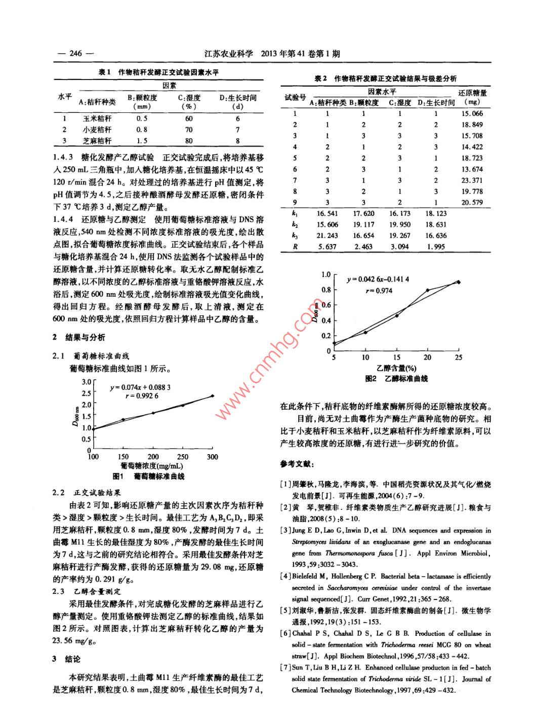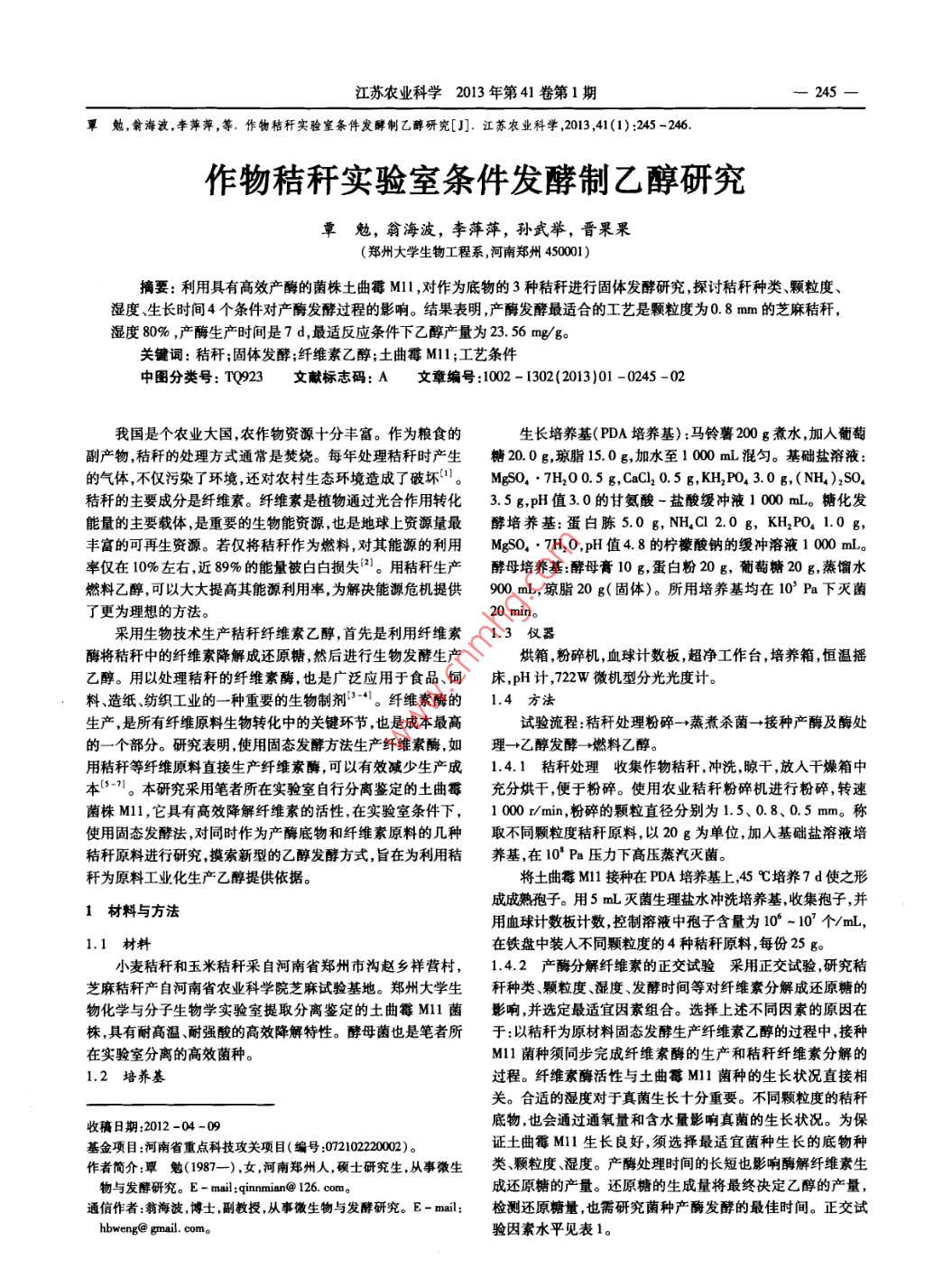 江蘇農(nóng)業(yè)科學(xué)2013年第41卷第1期245勉,翁海波,李萍萍,等.作物秸稈實(shí)驗(yàn)室條件發(fā)酵制乙醇研究[J].江蘇農(nóng)業(yè)科學(xué),2013,41(1):245-246作物秸稈實(shí)驗(yàn)室條件發(fā)酵制乙醇研究覃勉,翁海波,李萍萍,孫武舉,晉果果(鄭州大學(xué)生物工程系河南鄭州450001)摘要:利用具有高效產(chǎn)酶的菌株土曲霉M對(duì)作為底物的3種秸稈進(jìn)行固體發(fā)酵研究探討秸稈種類顆粒度、濕度、生長(zhǎng)時(shí)間4個(gè)條件對(duì)產(chǎn)酶發(fā)酵過(guò)程的影響。結(jié)果表明,產(chǎn)酶發(fā)酵最適合的工藝是顆粒度為0.8mm的芝麻秸稈,濕度80%,產(chǎn)酶生產(chǎn)時(shí)間是7d,最適反應(yīng)條件下乙醇產(chǎn)量為23.56mg/g關(guān)鍵詞:秸稈;固體發(fā)酵;纖維素乙醇;土曲霉Ml1;工藝條件中圖分類號(hào):TQ923文獻(xiàn)標(biāo)志碼:A文章編號(hào):1002-1302(2013)01-0245-02我國(guó)是個(gè)農(nóng)業(yè)大國(guó),農(nóng)作物資源十分豐富。作為糧食的生長(zhǎng)培養(yǎng)基(PDA培養(yǎng)基):馬鈴薯200g煮水,加入葡萄副產(chǎn)物,秸稈的處理方式通常是焚燒。每年處理秸稈時(shí)產(chǎn)生糖20.0g瓊脂15.0g,加水至1000mL混勻。基礎(chǔ)鹽溶液的氣體,不僅污染了環(huán)境還對(duì)農(nóng)村生態(tài)環(huán)境造成了破壞。MO4·7H2O0.5g,CaCl20.5g,KH2PO43.0g,(NH)2SO秸稈的主要成分是纖維素。纖維素是植物通過(guò)光合作用轉(zhuǎn)化3.5gpH值3.0的甘氨酸-鹽酸緩沖液1000mL。糖化發(fā)能量的主要載體,是重要的生物能資源,也是地球上資源量最酵培養(yǎng)基:蛋白胨5.0g,NH4C12.0g,KH2PO41.0g,豐富的可再生資源。若僅將秸稈作為燃料,對(duì)其能源的利用MgSO4·7H2O,pH值4.8的檸檬酸鈉的緩沖溶液1000mL。率僅在10%左右近89%的能量被白白損失2。用秸稈生產(chǎn)酵母培養(yǎng)基:酵母膏10g,蛋白粉20g,葡萄糖20g,蒸餾水燃料乙醇可以大大提高其能源利用率,為解決能源危機(jī)提供90mL,瓊脂20g(固體)。所用培養(yǎng)基均在10Pa下滅菌了更為理想的方法。20 mi采用生物技術(shù)生產(chǎn)秸稈纖維素乙醇,首先是利用纖維素1.3儀器酶將秸稈中的纖維素降解成還原糖,然后進(jìn)行生物發(fā)酵生產(chǎn)烘箱,粉碎機(jī),血球計(jì)數(shù)板,超凈工作臺(tái),培養(yǎng)箱,恒溫?fù)u乙醇。用以處理秸稈的纖維素酶,也是廣泛應(yīng)用于食品、飼床,pH計(jì),722W微機(jī)型分光光度計(jì)料、造紙紡織工業(yè)的一種重要的生物制劑。纖維素酶的1.4方法生產(chǎn),是所有纖維原料生物轉(zhuǎn)化中的關(guān)鍵環(huán)節(jié),也是成本最高試驗(yàn)流程:秸稈處理粉碎→蒸煮殺菌→接種產(chǎn)酶及酶處的一個(gè)部分。研究表明,使用固態(tài)發(fā)酵方法生產(chǎn)纖維素酶,如理→乙醇發(fā)酵→燃料乙醇用秸稈等纖維原料直接生產(chǎn)纖維素酶,可以有效減少生產(chǎn)成1.4.1秸稈處理收集作物秸稈,沖洗,晾干,放入干燥箱中本。本研究采用筆者所在實(shí)驗(yàn)室自行分離鑒定的土曲霉充分烘干,便于粉碎。使用農(nóng)業(yè)秸稈粉碎機(jī)進(jìn)行粉碎轉(zhuǎn)速菌株M11,它具有高效降解纖維素的活性,在實(shí)驗(yàn)室條件下,1000m/min,粉碎的顆粒直徑分別為1.5、0.8、0.5mm。稱使用固態(tài)發(fā)酵法,對(duì)同時(shí)作為產(chǎn)酶底物和纖維素原料的幾種取不同顆粒度秸稈原料,以20g為單位,加入基礎(chǔ)鹽溶液培秸稈原料進(jìn)行研究摸索新型的乙醇發(fā)酵方式旨在為利用秸養(yǎng)基,在10Pa壓力下高壓蒸汽滅菌。稈為原料工業(yè)化生產(chǎn)乙醇提供依據(jù)。將土曲霉Ml接種在PDA培養(yǎng)基上,45℃培養(yǎng)7d使之形1材料與方法成成熟孢子。用5m滅菌生理鹽水沖洗培養(yǎng)基收集孢子,并用血球計(jì)數(shù)板計(jì)數(shù)控制溶液中孢子含量為10-107個(gè)/m,1.1材料在鐵盤中裝入不同顆粒度的4種秸稈原料,每份25g。小麥秸稈和玉米秸稈采自河南省鄭州市溝趙鄉(xiāng)祥營(yíng)村,1.4.2產(chǎn)酶分解纖維素的正交試驗(yàn)采用正交試驗(yàn)研究秸芝麻秸稈產(chǎn)自河南省農(nóng)業(yè)科學(xué)院芝麻試驗(yàn)基地。鄭州大學(xué)生稈種類顆粒度、濕度、發(fā)酵時(shí)間等對(duì)纖維素分解成還原糖的物化學(xué)與分子生物學(xué)實(shí)驗(yàn)室提取分離鑒定的土曲霉M1l菌影響,并選定最適宜因素組合。選擇上述不同因素的原因在株,具有耐高溫耐強(qiáng)酸的高效降解特性。酵母菌也是筆者所于:以秸稈為原材料固態(tài)發(fā)酵生產(chǎn)纖維素乙醇的過(guò)程中接種在實(shí)驗(yàn)室分離的高效菌種。M11菌種須同步完成纖維素酶的生產(chǎn)和秸稈纖維素分解的1.2培養(yǎng)基過(guò)程。纖維素酶活性與土曲霉MIl菌種的生長(zhǎng)狀況直接相關(guān)。合適的濕度對(duì)于真菌生長(zhǎng)十分重要。不同顆粒度的秸稈收稿日期:2012-04-09底物,也會(huì)通過(guò)通氧量和含水量影響真菌的生長(zhǎng)狀況。為?;痦?xiàng)目:河南省重點(diǎn)科技攻關(guān)項(xiàng)目(編號(hào):07210222000)。證土曲霉M1生長(zhǎng)良好,須選擇最適宜菌種生長(zhǎng)的底物種作者簡(jiǎn)介:覃勉(1987-),女,河南鄭州人,碩士研究生,從事微生類、顆粒度、濕度。產(chǎn)酶處理時(shí)間的長(zhǎng)短也影響酶解纖維素生物與發(fā)酵研究。E-mail:qinnmian@126.com成還原糖的產(chǎn)量。還原糖的生成量