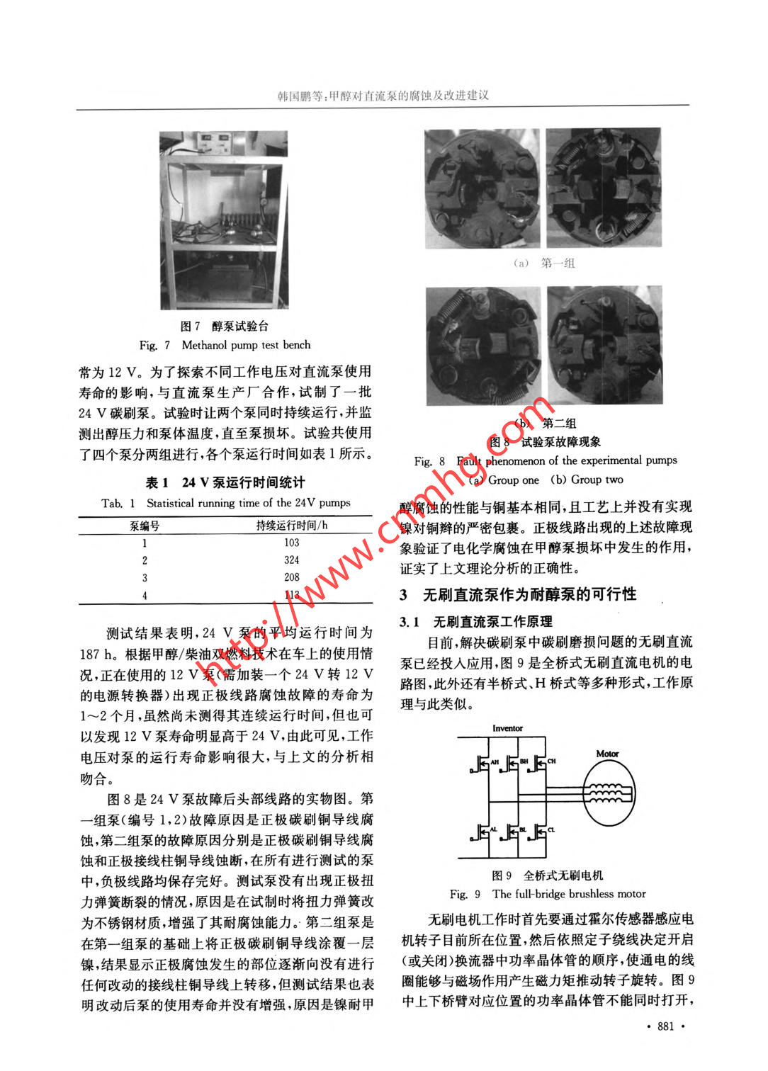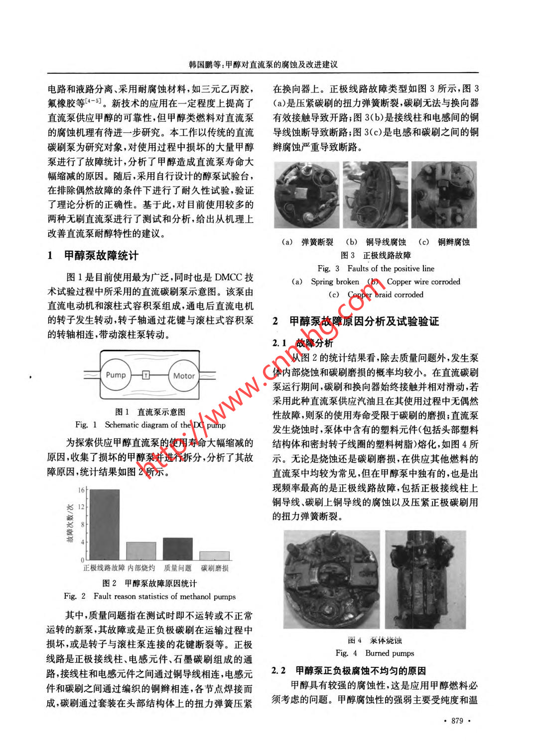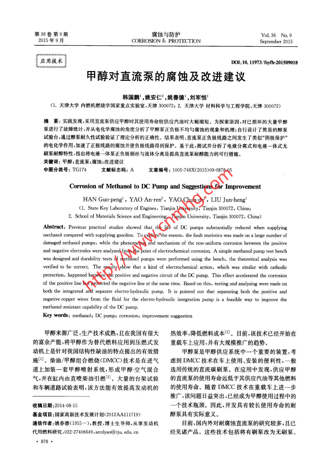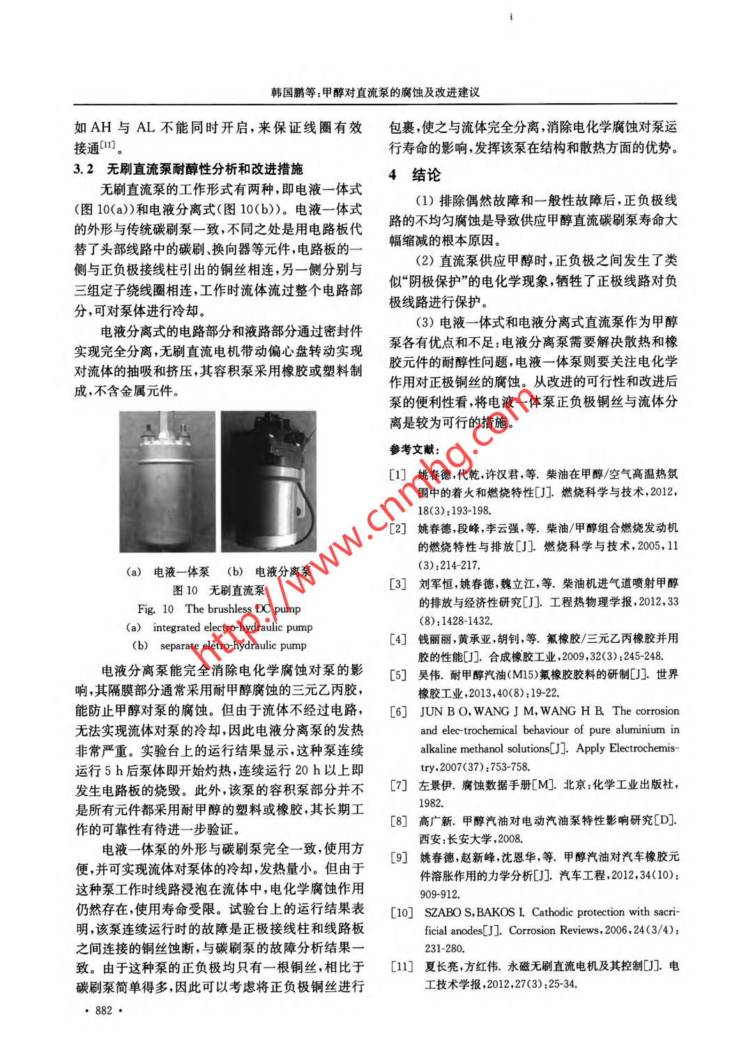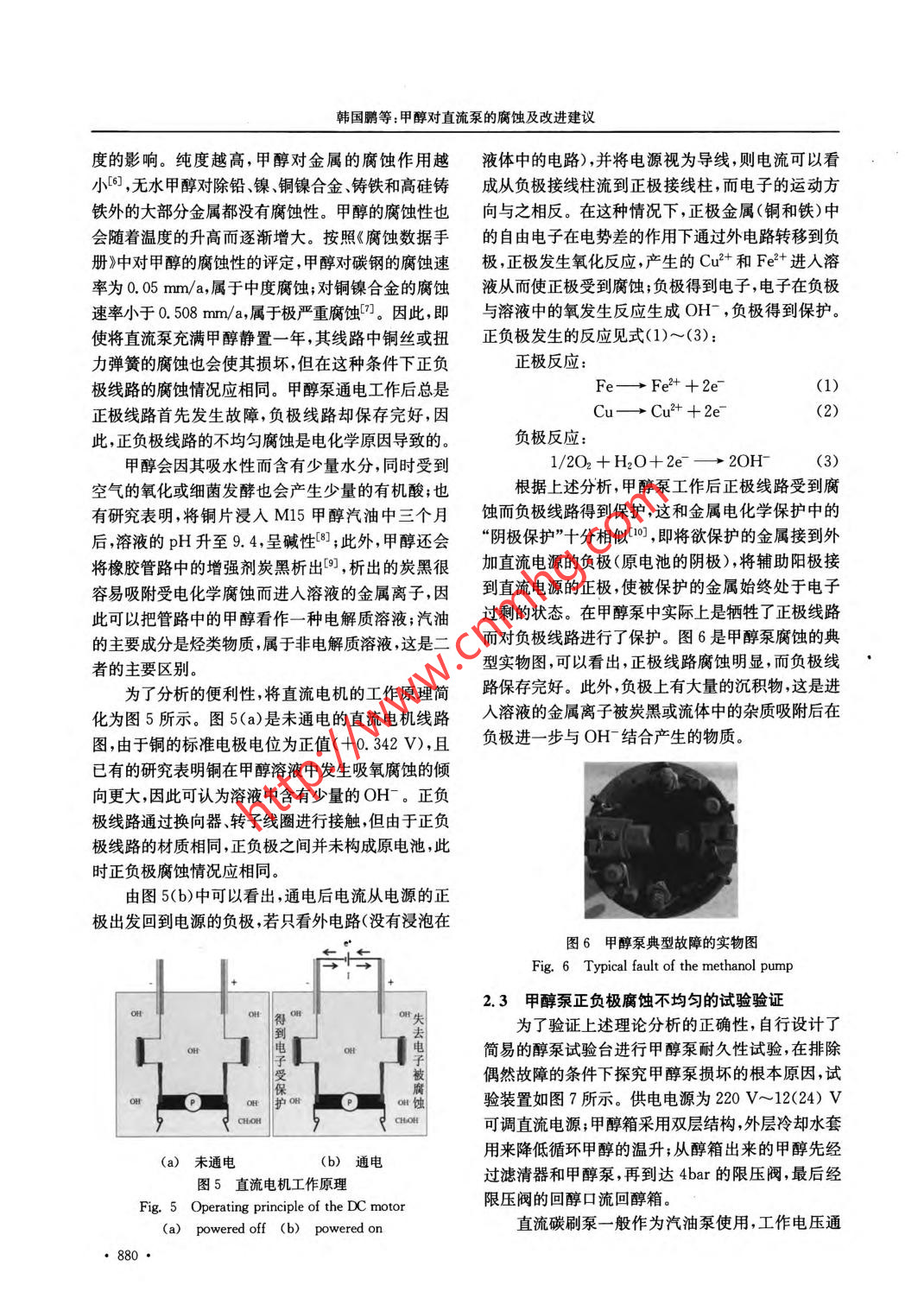 第36卷第9期腐蝕與防護(hù)Vol. 36 No. 92015 年9月CORROSION & PROTECTIONSeptember 2015 .應(yīng)用技術(shù)DOI:10. 1973/+5yfh-201509018甲醇對(duì)直流泵的腐蝕及改進(jìn)建議韓國(guó)鹛' ,姚安仁2 ,姚春德' ,劉軍恒'(1.天津大學(xué)內(nèi)燃機(jī)燃燒學(xué)國(guó)家重點(diǎn)實(shí)驗(yàn)室,天津300072; 2.天津大學(xué)材料科學(xué)與工程學(xué)院,天津300072)摘要: 實(shí)踐發(fā)現(xiàn),采用直流泵供應(yīng)甲醇時(shí)其使用壽命較供應(yīng)汽油時(shí)大幅縮短。為探索原因,對(duì)已損壞的大量甲醇泵進(jìn)行了故障統(tǒng)計(jì),并從電化學(xué)腐蝕的角度分析了甲醇泵正負(fù)極不均勻腐蝕的現(xiàn)象和機(jī)理;自行設(shè)計(jì)了簡(jiǎn)易的醇泵試驗(yàn)臺(tái),通過(guò)醇泵耐久性試驗(yàn)驗(yàn)證了理論分析的正確性。結(jié)果表明:直流泵正負(fù)極線路之間發(fā)生了類似“陰極保護(hù)”的電化學(xué)作用,加速了正極線路的腐蝕并使負(fù)極線路得到保護(hù)?;诖?,測(cè)試并分析了電液分離式和電液-體式無(wú)刷泵耐醇特性,指出將電液-體泵正負(fù)極銅絲與流體分離是提高直流泵耐醇能力的可行措施。關(guān)鍵詞:甲醇;直流泵;腐蝕;改進(jìn)建議中圖分類號(hào): TG174文獻(xiàn)標(biāo)志碼: A文章編號(hào): 1005-748X(2015)09-0878-05Corrosion of Methanol to DC Pump and Suggestions for ImprovementHAN Guo-peng' , YAO An-ren2,YAO Chun-de',LIU Jun-heng'(1. State Key Laboratory of Engines, Tianjin University, Tianjin 300072, China;2. School of Materials Science and Engineering, Tianjin University, Tianjin 300072, China)Abstract: Previous practical studies showed that the life of DC pumps subtanially reduced when supplyingmethanol compared with supplying gasoline. To explore the reason, the fault statistics was made on a large number ofdamaged nethanol pumps, while the phenomenon and mechanism of the non-uniform corrosion between the positiveand negative electrodes were analyzed from the point of electrochemical corrosion. A simple methanol pump test benchwas designed and durability tests of methanol pumps were performed using the bench, the theoretical analysis wasverified to be correct. The results show that a kind of electrochemical action, which was similar with cathodicprotection, happened between the positive and negative circuit of the DC pump. This effect accelerated the corrosionof the positive line but protected the negative line at the same time. Based on this, testing and analyzing were made onboth the integrated and separate electro hydraulic pump. It is pointed out that separating both the positive andnegative copper wires from the fluid for the electro .hydraulic integration pump is a feasible way to improve thmethanol- resistant capability of the DC pump.Key words: methanol; DC pump; corrosion; improvement suggestion甲醇來(lái)源廣泛,生產(chǎn)技術(shù)成熟,且在我國(guó)有很大熱效率,降低燃料成本[田。目前,該技術(shù)已經(jīng)開(kāi)始在的富余產(chǎn)能,將甲醇作為替代燃料應(yīng)用到壓燃式發(fā)重載車.上應(yīng)用,并有大規(guī)模推廣的趨勢(shì)。動(dòng)機(jī)上是針對(duì)我國(guó)結(jié)構(gòu)性缺油的特點(diǎn)提出的有效措甲醇泵是甲醇供應(yīng)系統(tǒng)中一個(gè)重要的裝置,考施["。柴油/甲醇組合燃燒(DMCC)技術(shù)是在進(jìn)氣慮到DMCC技術(shù)在車上使用、安裝的便利性,一般道上加裝-套甲醇噴射系統(tǒng),形成甲醇空氣混合.選用傳統(tǒng)的直流碳刷泵。在應(yīng)用中發(fā)現(xiàn),供應(yīng)甲醇?xì)?并在缸內(nèi)由直噴柴油引燃[2]。大量的臺(tái)架試驗(yàn)的直流泵的使用壽命遠(yuǎn)低于其供應(yīng)汽油等其他燃料和車輛道路試驗(yàn)表明,該方法能有效提高發(fā)動(dòng)機(jī)的的使用壽命。隨著DMCC技術(shù)在重載車上進(jìn)- -步推廣,該問(wèn)題8益突出,已經(jīng)成為甲醇使用過(guò)程中的收稿日期:2014-08-15-個(gè)技術(shù)瓶頸。因此,開(kāi)發(fā)具有較長(zhǎng)使用壽命的耐基金項(xiàng)目:國(guó)家高新技術(shù)發(fā)展計(jì)劃(2012A111719)醇泵具有實(shí)際意義。通信作者:姚春德(1955 - ),教授,博士生導(dǎo)師,從事發(fā)動(dòng)機(jī)目前,國(guó)內(nèi)外對(duì)耐腐蝕直流泵的研究較多,且已代用燃料研究,022-27406649 , arcdyao@ tju. edu. cn經(jīng)見(jiàn)諸產(chǎn)品。這些技術(shù)包括將有刷泵改為無(wú)刷泵、韓國(guó)鵬等:甲醇對(duì)直流泵的腐蝕及改進(jìn)建議電路和液路分離、采用耐腐蝕材料,如三元乙丙膠,在換向器上。正極線路故障類型如圖3所示,圖3氟橡膠等[4-5]。新技術(shù)的應(yīng)用在一-定程度上提高了(a)是壓緊碳刷的扭力彈簧斷裂,碳刷無(wú)法與換向器直流泵供應(yīng)甲醇的可靠性,但甲醇類燃料對(duì)直流泵有效接觸導(dǎo)致開(kāi)路;圖3(b)是接線柱和電感間的銅的腐蝕機(jī)理有待進(jìn)-步研究。本工作以傳統(tǒng)的直流導(dǎo)線蝕斷導(dǎo)致斷路;圖3(c)是電感和碳刷之間的銅碳刷泵為研究對(duì)象,對(duì)使用過(guò)程中損壞的大量甲醇辮腐蝕嚴(yán)重導(dǎo)致斷路。泵進(jìn)行了故障統(tǒng)計(jì),分析了甲醇造成直流泵壽命大幅縮減的原因。隨后,采用自行設(shè)計(jì)的醇泵試驗(yàn)臺(tái),在排除偶然故障的條件下進(jìn)行了耐久性試驗(yàn),驗(yàn)證了理論分析的正確性?;诖?對(duì)目前使用較多的兩種無(wú)刷直流泵進(jìn)行了測(cè)試和分析,給出從機(jī)理上改善直流泵耐醇特性的建議