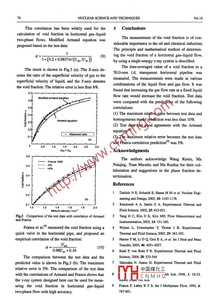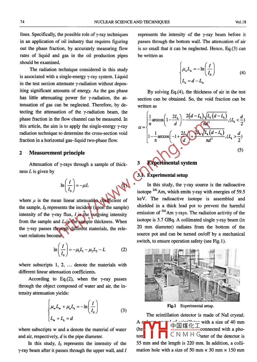 Available online at www. sciencedrect.comNUCLEAR。0.0 ScienceDirectSCIENCEANDTECHNIQUESNuclear Science and Techniques, Vol.18, No.2 (207) 73- 76Gamma-ray attenuation technique for measuring void fraction inhorizontal gas-liquid two-phase flowLI Zhibiao* WU Yingxiang LI Donghui(Instiute of Mechanics, the Chinese Academry of Sciences, Beijing100080, China)Abstract The measurement of void fraction is of importance to the oil industry and chemical industry. In this article,the principle and mathematical method of determining the void fraction of horizontal gas- liquid flow by using a sin-gle- energy γr-ray system is described. The Y-ray source is the radioactive isotope of 24IAm with r-ay energy of 59.5keV. The time-averaged value of the void fraction in a 50.0-mm id. transparent horizontal pipeline is measured undervarious combinations of the liquid flow and gas flow. It is found that increasing the gas flow rate at a fixed liquid flowrate would increase the void fraction. Test data are compared with the predictions of the correlations and a goodagreement is found. The result shows that the designed Y-ray system can be used for measuring the void fraction in ahorizontal gas- liquid two-phase flow with high accuracy.Keywords r-rays, Single-energy, Void fraction, Two-phase flowCLC number TP3911 Introductionracy. Daidzic et al.u have measured void fraction us-ing the magnetic resonance imaging (MRI) system.The imaging and measurement of multiphaseThe shortcoming of this approach is that the liquidflows have received much attention in recent years,should not be conductible. Kendoush and Sarkis'2]largely driven by the need in the oil industry to meas-have measured the void fraction using X-ray absorp-ure the mass flow rates of oil, water, and gas in thetion. Yang et al.3] have measured the void fractionproduction pipelines. The ability to see the inside of anusing the impedance method. Wojtan et al.4I haveobject and make quantitative measurements of the en-measured the dynamic void fraction in stratified typesclosed materials and structures has a wide range ofof flow. Harms et al.5 have proposed a void fractionapplications. However, the measurement over a widemodel for annular flow in a horizontal pipe.range of flow regimes and the ability to measure massRadiation technique is being considered as a bet-flow rates of each component with high accuracy re-ter option to get the details of a multiphase flow struc-quire a detailed knowledge of the hydrodynamics ofture, as information about phase distribution can bemultiphase flows, especially the phase fraction on theobtained destructively. Stahl et al.6l have discussed thecross-section of a pipeline for each component, as theaccuracy of void fraction measurements by sin-fast changing phase fractions directly control the mul-gle-beam gamma densitometry. Takenaka et al.7] havetiphase flow behavior and flow rates, and also the ba-measured the void fraction by neutron radiography.sic information to reconstruct the flow pattern images.The motivation for the study presented in this articleTherefore, in recent years many researchers have de-was to examine how γ-rays could be used in a particu-voted their attention to determining phase fractionslar fiel中國煤化工is, the imaging andand to improving phase fraction measurement accu-measuJ1ase flows in pipe-YHCNMHGSupported by National Natural Science Foundaion of China (No.10572143)*E-mail: zhibiaoli@ 163.comReceived date: 2007-01-0474NUCLEAR SCIENCE AND TECHNIQUESVol.18lines. Specifically, the possible role of Y-ray techniquesrepresents the intensity of the Y-ray beam before itin an application of oil industry that requires figuringpasses through the bottom wall. The attenuation of airout the phase fraction, by accurately measuring flowis so small that it can be neglected. Hence, Eq.(3) canrates of liquid and gas in the oil production pipesbe written asshould be examined.The radiation technique considered in this studyu.L=-ln(份)(4)is associated with a single-energy Y-ray system. Liquid[L=d-L,in the test section attenuate y-radiation without depos-iting significant amounts of energy. As the gas phaseBy solving Eq.(4), the thickness of air in the testhas lttle attenuating power for γ radiation, the at-section can be obtained. So, the void fraction can betenuation of gas can be neglected. Therefore, by de-written astecting the attenuation of the γY-radiation beam, the2(d-4)V4(d-4)phase fraction in the flow channel can be measured. Innarccos(1-4)-πd2以<號this article, the aim is to apply the single-energy γ-raya=radiation technique to determine the cross-section void.2124√4(d-4)fraction in a horizontal gas- _liquid two-phase flow.二arcos(-+d(5)2 Measurement principleAttenuation of ry-rays through a sample of thick-3 Experimental systemness L is given by3.1 Experimental setup=-μL(1)In this study, the Y-ray source is the radioactiveisotope 24Am, which emits y-ray with energies of 59.5where μ is the mean linear attenuation coefficient ofkeV. The radioactive isotope is assembled andthe sample, Io represents the incident (upon the sample)shielded in a thick lead pot to prevent the harmfulintensity of the Y-ray flux, I is the outgoing intensityemission of 241Am Y-rays. The radiation activity of thefrom the sample and L is the sample thickness. Whenisotope is 3.7 GBq. A collimated single y-ray beam (inthe Y-ray passes through different materials, the rele-20 mm diameter) radiates from the bottom of thesource pot and can be turned on/off by a mechanicalvant relations becomeswitch, to ensure operation safety (see Fig.1).In=-4-4L-L(2)where subscripts 1, 2, ... denote the materials withdifferent linear attenuation coefficients.According to Eq.(2), when the Y-ray passesthrough the object composed of water and air, the in-tensity attenuation yields:μL +μL =-In|Fig.1 Experimental setup.The scinillation detector is made of NaI crystal.lL +L=dA中國煤化工with a size of 40 mmwhere subscripts W and a deno