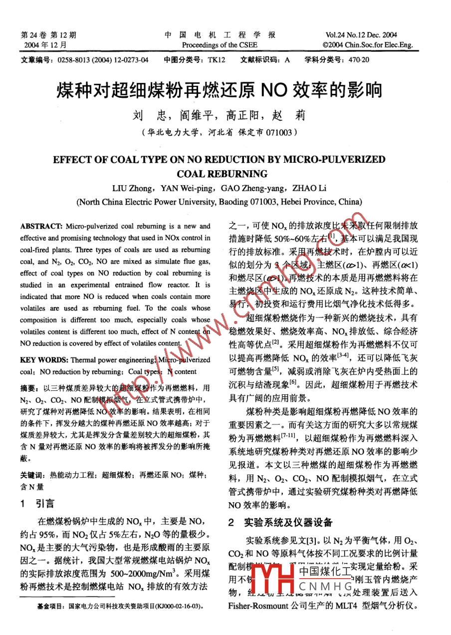 第24卷第12期中國電機工程學報Vol.24 No.12 Dec.20042004年12 月Proceedings of the CSEE⑥2004 Chin.Soc.for Elec.Eng.文章編號: 0258-8013 (2004) 12-0273-04中圖分類號: TK12文獻標識碼: A學科分類號: 470-20煤種對超細煤粉再燃還原NO效率的影響劉忠,閻維平,高正陽,趙莉(華北電力大學,河北省保定市071003 )EFFECT OF COAL TYPE ON NO REDUCTION BY MICRO-PULVERIZEDCOAL REBURNINGLIU Zhong, YAN Wei-ping, GAO Zheng-yang, ZHAO Li(North China Elctric Power University, Baoding 071003, Hebei Province, China)ABSTRACT: Micro-pulverized coal reburming is a new and之一,可使NO,的排放濃度比未采取任何限制排放effective and promising technology that used in NOx control in措施時降低50%~60%左右”,基本可以滿足我國現(xiàn)coal-fired plants. Three types of coals are used as rebuming行的排放標準。采用再燃技術時,在爐膛內(nèi)可以近coal, and N2, O2, CO2, NO are mixed as simulate flue gas似的劃分為3個區(qū)域:主燃區(qū)(∞1)、 再燃區(qū)(a<1)effect of coal types on NO reduction by coal rebuming is和燃盡區(qū)(0>1)。再燃技術的本質是用再燃燃料將在studied in an experimental entrained flow reactor. It is主燃燒區(qū)中生成的NO還原成N2。這種技術簡單、indicated that more NO is reduced when coals contain morevolatiles are used as rebumning fuel. To the coals whose易行,初投資和運行費用比煙氣凈化技術低得多。composition is different too much, especially coals whose超細煤粉燃燒作為- -種新興的燃燒技術,具有volatiles content is different too much, efect of N content on穩(wěn)燃效果好、燃燒效率高、NOx排放低、綜合經(jīng)濟NO reduction is covered by effect of volatiles content.性高等優(yōu)點(2。采用超細煤粉作為再燃燃料不僅可KEY WORDS: Thermal power engineering; Micro pulverized以提高再燃降低NOx 的效率[34,還可以降低飛灰coal; NO reduction by rebuming; Coal types; N content可燃物含量5),減弱或消除飛灰在爐內(nèi)受熱面.上的摘要:以三種煤質差異較大的超細煤粉作為再燃燃料,用沉積與結渣現(xiàn)象6。因此,超細煤粉用于再燃技術N2、02、CO2、 NO配制模擬煙氣,在立式管式攜帶爐中,具有廣闊的應用前景。研究了煤種對再燃降低NO效率的影響。結果表明,在相同煤粉種類是影響超細煤粉再燃降低NO效率的的條件下,揮發(fā)分越大的煤種再燃還原NO效率越高;對于重要因素之一。而有關這方面的研究大多以常規(guī)煤煤質差異較大,尤其是揮發(fā)分含量差別較大的超細煤粉,其粉為再燃燃料7-),以超細煤粉作為再燃燃料深入含N量對再燃還原NO效率的影響將被揮發(fā)分的影響所掩系統(tǒng)地研究煤粉種類對再燃還原NO效率的影響少蔽。見報道。本文以三種燃煤的超細煤粉作為再燃燃關鍵詞:熱能動力工程;超細煤粉;再燃還原NO;煤種:料,用N2、02、CO2、NO配制模擬煙氣,在立式含N量管式攜帶爐中,通過實驗研究煤粉種類對再燃降低1引言NO效率的影響。在燃煤粉鍋爐中生成的NO,中,主要是NO,2實驗系統(tǒng)及儀器設備約占95%,而NO2僅占5%左右,N2O等的量極少。實驗系統(tǒng)參見文[3]。以N2為平衡氣體,用02、NOx是主要的大氣污染物,也是形成酸雨的主要原CO2和NO等原料氣體按不同工況要求的比例計量因之一。據(jù)統(tǒng)計,我國大型常規(guī)燃煤電站鍋爐NOx配制中國煤化工實現(xiàn)定量給粉。 采的實際排放濃度范圍為500~2000mg/Nm'.采用煤粉再燃技術是控制燃煤電站NO,排放的有效方法用不銹TH剛玉管內(nèi)燃燒產(chǎn)物,經(jīng)C.NM HC處理裝置后送入基金項目:國家電力公司科技攻關資助項0(00002- 16-03)●Fisher-Rosmount公司生產(chǎn)的MLT4型煙氣分析儀。274中國電機工程學報第24卷.取樣槍的位置根據(jù)停留時間變化。煙氣分析儀在使VarioelI型元素分析儀等設備測試了這三種超細用前采用標準氣體標定,所用測試儀器可以滿足實煤粉的煤質分析數(shù)據(jù)。煤質分析結果見表1。驗的精度要求。爐入口: CO2濃度為15%左右,NO為100ppm左右,02濃度分別為4%左右,以N2為平衡氣。給.3實驗工況粉量分別為1.457 g/min 和1.093 g/min, 對應的再實驗用3種原料煤粉取自電廠煤粉倉。將原煤燃燃料比分別為25%和20%。實驗溫度為1300C粉在實驗室的振篩機上進行篩分,篩取45μm篩下和1200C,對應的實驗氣體控制流量為1.83m/hn煤粉裝瓶備用。采用德國元素分析系統(tǒng)公司生產(chǎn)的和1.95m2/n。表1煤質分析結果Tab.1 The results of the coal-quality analysis元素分析1%工業(yè)分析1% _煤種_CaHsOnd_SasdAdWaVaa60.793.78716.280.6630.55113.04.9527.8大同煙煤56.773.5000.6801.99425.00.6423.3邢臺貧煤59.213.0548.001.0130.85326.81.0613.84實驗結果及分析煤粉再燃還原NOx過程包括揮發(fā)分的同相還4.1超細煤粉種類的影響原反應和煤焦的異相還原反應。當停留時間較短實驗選用混煤(神華煙煤與準格爾褐煤,比例約時,以揮發(fā)分還原NO的同相反應為主。在再燃區(qū)1: 1)、 大同煙煤和邢臺貧煤等三個煤質差別較大的內(nèi),煤粉顆粒首先發(fā)生熱解,釋放出揮發(fā)分。揮發(fā)煤種。分中的CH和HCN、NH;通過以下同相還原反應還圖1為45μm篩下三種超細煤粉在溫度1300C原N0Of12):和1200C,再燃燃料比25%和20%,氧濃度為4% .CH +NO +HCN+... .(1)條件下的再燃還原NO的實驗結果。從圖1可以看HCN+O,0H +N+...出,在相同的條件下,混煤再燃還原NO的效果最NH +NO→N2+...好,其次是大同煙煤,邢臺貧煤效果最差。這是由此外,還存在以下反應,與式(1)競爭性的消耗CH:于煤種本身的特性所致。CH +0- +CO+H+...100◆◆