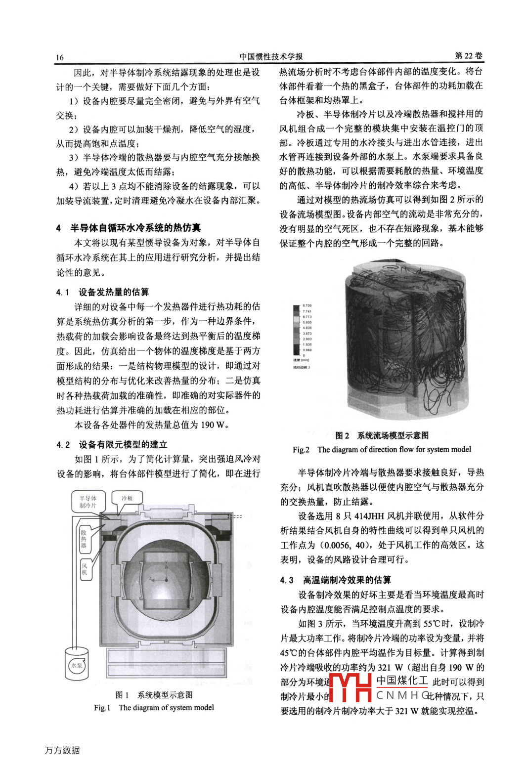 第22卷第1期中國慣性技術學報Vol 22 No. 12014年2月Journal of Chinese Inertial TechnologyFcb,2014章編號:10056734(2014)01-001404doi:10.13695/cnk12-1222/032014.01.004半導體自循環(huán)水冷系統(tǒng)在慣導設備上的應用楊盛林,馬林,張宇飛,吳春蕾,徐凱(天津航海儀器研究所,天津300131)摘要:隨著用戶對慣導設備溫度環(huán)境適應范圍的要求越來越高,對慣導設備溫控技術水平也提出了更高要求。通過分析明確半導體自循環(huán)水冷系統(tǒng)是提升慣導設備溫度環(huán)境適應能力的強有力手段之一結合半導體制冷技術、水循環(huán)冷卻技術以及有限元溫度場仿真技術,給出了慣導設備半導體自循環(huán)水冷系統(tǒng)的結構方案形式和溫度控制方案措施。結合實際慣導設備進行分析計算,驗證了半導體自循環(huán)水冷系統(tǒng)在5℃的高環(huán)境溫度下能對慣導設備內(nèi)部核心部位的溫度起到10℃以上的降溫作用關鍵詞:半導體制冷:水冷:慣導:溫度場中圖分類號:U6661文獻標志碼:AApplication of semiconductor self-circulation water coolingsystem in inertial navigation equipmentYANG Sheng-lin, MA Lin, ZHANG Yu-fei, WU Chun-lei, XU Kai(Tianjin Navigation Instrument Research Institute, Tianjin 300131, China)Abstract: By the analysis of environmental adaptation extension of today's inertial navigation equipment, itis clear that the semiconductor self-circulation water cooling system is one of the most powerful means toimprove the ability of inertial navigation equipment's adapting to environment. Combined withsemiconductor technology and finite element simulation technology of temperature field, the structurescheme and temperature control program measures of inertial navigation equipment semiconductorself-circulation water cooling system are given. Combining with the analysis and calculation of the actualsystem, it is verified that the semiconductor self-circulation water cooling system can cool the equipmentinside core by >10C in high ambient temperature of 55CKey words: semiconductor refrigeration; water cooling; inertial navigation; temperature field慣導設備的輸出精度在很大程度上受制于溫度的狀態(tài),這種狀態(tài)對慣性元件和電子器件的壽命和可靠影響。溫度影響因素包括:一是設備內(nèi)部自身在溫度性帶來了極其有害的影響。慣性元件的工作溫度都有場穩(wěn)定后的溫度分布要求均勻,無大的溫度梯度;個最大值,當應用環(huán)境的最高溫度值繼續(xù)升高,使是設備所處大環(huán)境溫度的巨大變化對設備內(nèi)部溫度梯慣性元件周圍的溫度大于要求工作溫度上限時,器件度的影響,尤其是對溫度梯度變化率的影響。超溫而使設備處于不可控狀態(tài)。傳統(tǒng)風冷設備都會對應用環(huán)境的溫度提出很高的慣導設備要求的溫度環(huán)境日益嚴酷,為了保證設要求,即要求提供一個變化帶寬很窄的環(huán)境溫度并且備的輸出精度,均勻的溫度場分布以及在全溫范圍內(nèi)將控制溫度點設在一個高點,以便達到控溫的目的。良好的溫度梯度變化率是設備熱設計的關鍵所在。那風冷溫控的弊端就是控制溫度點的設定只能以最高的么,要在高環(huán)境溫度下還能為設備提供一個良好的溫環(huán)境溫度來定,這會導致設備啟動時要求有一段不可度環(huán)境,半導體自循環(huán)水冷系統(tǒng)的使用和推廣在當今忽視的加溫時間;而且慣性元件工作時一直處于高溫慣導設備的研制中就顯得尤為重要。收稿日期:2013-08-31;修回日期:2013-11-18中國煤化工基金項目:國防預研項目(51309030101)CNMHG作者簡介:楊盛林(1978-),男,高級工程師,研究方向為導航、制導與控制。ma: holyghost/u7(a3com第1期楊盛林等:半導體自循環(huán)水冷系統(tǒng)在慣導設備上的應用本文從有限元仿真分析入手,結合半導體技術、熱的大小由通過的電流決定。放熱和吸熱的差值為半水循環(huán)冷卻技術,對特定的慣性平臺進行仿真分析設導體制冷片的輸入功率。半導體制冷片冷端最大吸熱計;提出水冷系統(tǒng)設計過程中的關鍵點進而提出對慣量即為其最大制冷功率,它是設計時需要重點考慮的導設備進行半導體自循環(huán)水冷系統(tǒng)設計的要求,力求個參量對慣導系統(tǒng)的熱設計與研制起到指導性的作用。在系統(tǒng)熱設計時,首先確認設備內(nèi)部各處的熱載荷Q,所處環(huán)境的最高溫度T。以及內(nèi)腔需要控制的溫1半導體自循環(huán)水冷系統(tǒng)應用推廣的優(yōu)勢度Tc;然后初步估計半導體制冷片熱端的溫度Tb。如前所述,風冷系統(tǒng)無法使具有內(nèi)熱源的設備的根據(jù)Tc和T值,結合半導體特性曲線,即可查出所選內(nèi)部溫度與環(huán)境溫度相等或更低,如果不實行分段溫擇的特定半導體制冷片的工作電流c和制冷功率Qc???考慮溫度梯度的存在,設備內(nèi)部的控制溫度必定要高于最高的環(huán)境溫度值。當今軍民用設備最高環(huán)境3.2風路的設計風路的設計是整個設備熱設計的關鍵,它是設備溫度值提到55℃或者更高已是其最基本的要求。相對以往常用的船用慣導設備,55℃的環(huán)境溫度保守估計內(nèi)部的換熱通道。風路設計要求風道形狀簡單,盡量不要有突變截面,最為關鍵的是風路要短。以便減小已能輕易使設備內(nèi)腔溫度達到65℃或更高,慣性元件突變壓力損失和沿程壓力損失,獲得最大通風量。的溫度更高,設備無法使用。對于對溫度和溫度梯度較為敏感的光學陀螺來除水泵外,半導體自循環(huán)水冷