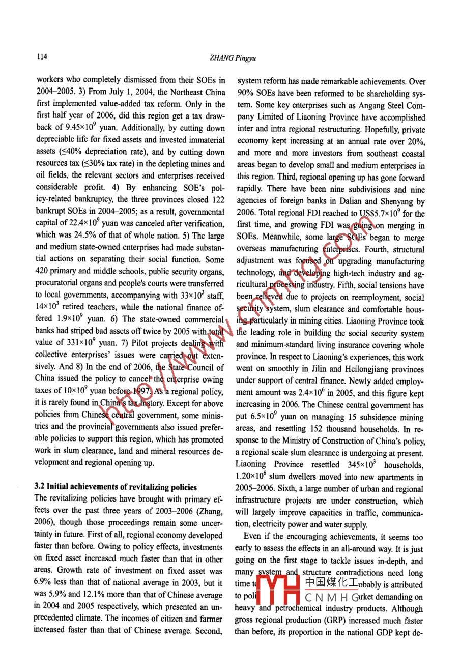 Chin. Geogra. Sci. 2008 18(2) 109-118DOI: 10.1007/s11769-008-0109-2www.springerlink.comRevitalizing Old Industrial Base of Northeast China:Process, Policy and ChallengeZHANG Pingyu(Northeast Institute of Geography and Agroecology, Chinese Academy of Sciences, Changchun 130012, China)Abstract: Northeast China is the largest old industrial base of China that endured persistent infuence of the past plannedeconomy system. This region has lost its leading place since the reform and opening up, and became a backward region bycontrast with the coastal areas. This paper elaborates the evolutionary process of the old industrial base of Northeast China,analyses the main reasons for the decline, gives a preliminary evaluation on the revtalizing polices in recent years, andpoints out major long term challenges for future revitalization. It concludes that for Northeast China, a relative decliningarea: 1) it is indispensable to get the long-term policy support from the central govenment; 2) system reform and structureadjustment are the crucial strategies, particulaly the reform of the large and medium state-owned enterprises; and devel-oping new industries is as important as upgrading traditional advantaged industries; 3) the local goverments should playan indirect role, avoiding from any unncessary intervention on economic actity; and 4) social security and investmentclimate must be improved simultaneously. In addition, the author sresses that the lack of knowledge on the nature of oldindustrial base had led to filures of the past ititives, and revializing the old industial base should be treated as a holistic regional project incuding economy growth, society progress and eavironment improvement.Keywords: old industrial base; regional revialization; regional policy; Northeast China1 Introductionthe 1980s. In the mid-1990s, some scholars noted thedeclining in the old industrial base of Northeast ChinaUrban and regional decline is a worldwide phenomenon, (Li and Li, 1996), and began to concerm revitalzing is-and revitalizing the declined old industrial base remains sues (Li, 1996; Lin et al, 2000; Liu, 2001). Until 2003,as a tough issue in regional and urban development revitalizing old industrial bases became a national policy,studies. With rapid technology advancing and global people treated old industrial base issues more seriously,economic and political restructuring after World War I,,and realized the very lack of knowledge on the nature ofmost developed countries acomplished industry trans-this issue. Hence, more and more domestic literaturesformation in the period of the 1970s -1980s, and stepped aimed at making some sense of foreign theory and em-on the post industialization stage, yet there were some pirical story about revitalizing old industrial base (Lideclining cities or regions left to be revitalized. It is easy and Zhang, 2004; Li and Wu, 2005; Li and Shi, 2006).to find some Westerm ltratures elaborating regional Major research projects focused on policy and measurerevitalization and urban regeneration, and some stories for the revitalization, particularly on the system reformlike Emscher Park in Ruhr, and Dockland in London etc. of the state-owned enterprises (SOEs) and industrialseem familiar to current Chinese scholars and oficials adjustment (Jin et al, 2006; Wang and Wei, 205). The(Roberts and Sykes, 2000; Couch et al, 2003; Hamnette, international research even more concerned finance and2003). However, it is hard to find any holistic study on market issues (Bourguignon, 2003). But, a broadly ac-China's old industrial base, though the story of eco- knowledged theoretical framework for revitalizing oldnomic achievement in the coastal area has long domi- industrial base does not appear.nated main stream of China's social and economy since中國煤化工may experience aYHCNMHGReceived date: 2007-03-12; accepted date: 2007-12-03Foundation item: Under the auspices of National Natural Science Foundation of China (No. 40635030, 40471038), Knowledge Innova-tion Program of Chinese Academy of Sciences No. kzcxz-YW-321-04)Corresponding author: ZHANG Pingyu. E-mail: zhangpy@neigae.ac.cn110ZHANG Pingyucycle of birth, growth and decline. There is some com-golia Autonomous Regions, with an area of 1.25x 10'km';parability between different social contexts, and Chinawhereas NOIB in general is referred to Northeast Chinacertainly could learn both experiences and lessons fromthat includes Liaoning, Jilin and Heilongjiang provincesthe abroad cases. But, a fundamental difference between only. In 2005, gross regional production in NortheastChinese and Westem old industrial bases is that China's China was 1.80x 10'2 yuan (RMB), and total populationold industrial bases have all grown up under the blockedwas about 120x 10°. Owing to the very abundant naturalplanned economy for a long time, and system reformresources, unique development history and geopoliticalshould maintain the core part of revitalizing policy.relations with the pre-Soviet Union, Northeast China wasTherefore, we should treat the old industrial base as a built to be the first indutialized region in the 1950s-regional phenomenon based on its special history back- 1960s, with the result that it won its historic position asground, unique social and economic context and localthe largest industrial base of China at that time. Earliercondition. This paper attempts to comprehensively dis-regional industrialization had produced advanced socialcuss the old industrial base of Northeast China, usuallydevelopment. The urbanization level in Northeast China,called Northeast Old Industrial Base NOIB), in order to involving 90 cities,s is 50%, which is about 10% highergive a good understanding of China's old industrial basethan national average level. This region also takes frontissues, which by all means adds new materials on therank in education and technology level; there are hun-old industrial base studies.dreds of colleges and university and key inst