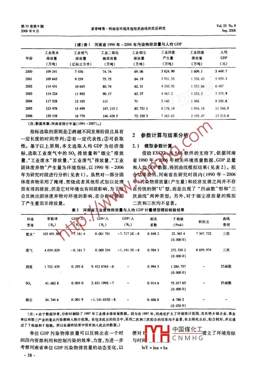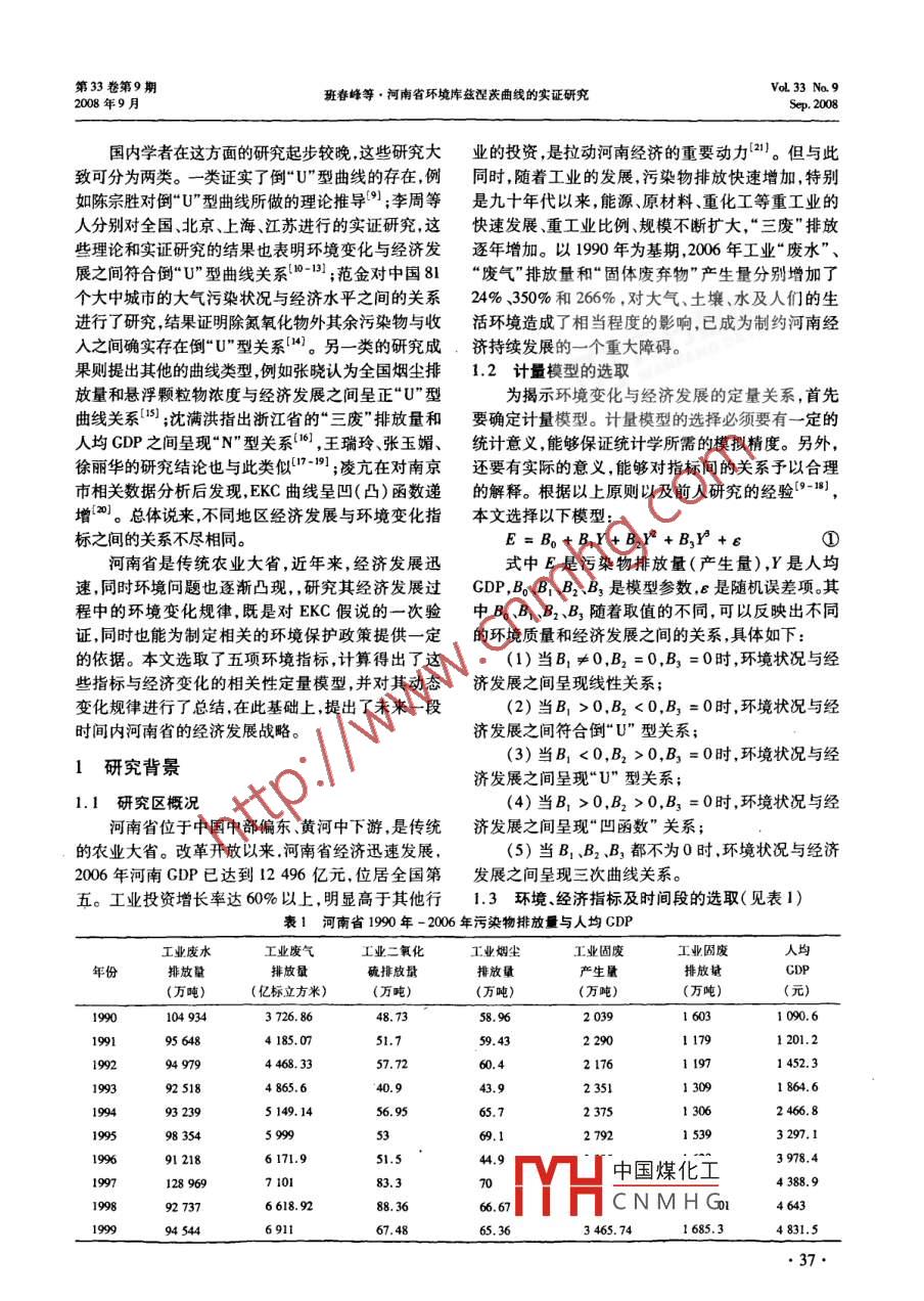 第33卷第9期環(huán)境科學(xué)與管理VoL33 Na.92008年9月ENVIRONMENTAL SCIENCE AND MANAGEMENTSep. 2008文章編號:1673 - 1212(2008 )09 -0036 -06河南省環(huán)境庫茲涅茨曲線的實證研究班春峰' ,徐夢潔' ,趙紫玉' ,劉勤’(1.南京農(nóng)業(yè)大學(xué)公共管理學(xué)院,江蘇南京210095;2.中科院南京土壤研究所,江蘇南京20008)摘要:文章在總結(jié) 國內(nèi)外學(xué)者對EKC曲線研究的基礎(chǔ)上,采用河南省1990年-2006年的經(jīng)濟和環(huán)境數(shù)據(jù),建立了單位GDP污染物排放量模型和人均CDP污染物排放量模型,分析了典型環(huán)境指標(biāo)與經(jīng)濟發(fā)展之間的關(guān)系。結(jié)果表明,河南省環(huán)境狀況和經(jīng)濟發(fā)展之間并不存在傳統(tǒng)的庫茲涅茨倒“U"型曲線,而是呈現(xiàn)“凹函數(shù)”和三次曲線兩種形式。由于河南省正處于工業(yè)化發(fā)展中期,為避免今后對環(huán)境造成不可逆轉(zhuǎn)的危害,必須改變外延擴張的發(fā)展模式,加大環(huán)保投資和加強執(zhí)法力度。關(guān)鍵詞:環(huán)境庫茲涅茨曲線;河南省;實證研究中圍分類號:X2文獻標(biāo)識碼:AAn Empirical Study on the Relationship Between Environmental Changeand Economic Development in Henan ProvinceBan Chunfeng' , Xu Mengite' , Zhao Ziyu' , Liu Qin?(1. College of Publie Management, Nanjing Agricultural University, Nanjing 210095 , China;2. Institute of Soil Science ,, Chinese Academy of Sciences, Nanjing 210008, China)Abstract: Based on the summarization of the documentations on environmental Kuznets curve( EKC)in and abroad, an empiri-cal study of Henan province during the period 1990 - 2006 was done. To analyze the relationship between environmental change andeconomic development, the plluant discharge model per unit GDP and the pollulant discharge model per capita GDP were set up.The results showed that the concave curve and the cubic curve instead of the conventional inverted U - shaped EKC could be used todescribe the relalionship between environmental change and econonie development in Henan province. During the process of indus-trialization , the econonic expansion mode by simply increasing the inpul factor should be improved, the environmental investment beincreased and the implementation of environmental laws be enforced in order to avoid the deterioration of environment.Key words: EKC; Henan province; empinical study環(huán)境問題一直備受人們關(guān)注。伴隨經(jīng)濟發(fā)展,本涵義是一個國家的環(huán)境質(zhì)量在經(jīng)濟發(fā)展初期會隨環(huán)境質(zhì)量的變化趨勢也是近年來學(xué)者研討的熱點。著國民收人的提高而逐漸惡化;在該國經(jīng)濟發(fā)展到20世紀(jì)90年代初美國經(jīng)濟學(xué)家Grossman和Krue-一定程度的時候,環(huán)境質(zhì)量的惡化會逐漸呈現(xiàn)平緩ger提出了環(huán)境庫茲涅茨曲線(EKC,Enviromental狀態(tài);進而,環(huán)境質(zhì)量則會隨著國民收入的增加出現(xiàn)Kuznets Curve)的概念"。他們對66個國家和地區(qū)好轉(zhuǎn)。因此從整體看,環(huán)境隨著經(jīng)濟的發(fā)展呈現(xiàn)倒1979年- 1990年間的14種空氣污染物和1977年“U" 型。-1988年間的水污染物質(zhì)變化情況進行研究,發(fā)現(xiàn)在Crossman和Krueger提出EKC概念之后,不大多數(shù)污染物的變動趨勢與人均國民收入的變動趨少國外學(xué)者對環(huán)境與經(jīng)濟的關(guān)系做了進-步的分析勢呈倒“U”型關(guān)系(2)。這一揭示環(huán)境與經(jīng)濟發(fā)展關(guān)和驗證。比較有影響力的有Panayotou, Hilton和系的倒“U"型曲線被稱為環(huán)境庫茲涅茨曲線,其基Levinson, List和Gallet, Stem和Common, Markus,Cropper和Grifths等人的研究[3-8] ,他們的研究結(jié)收稿日期:2008-02 -27產(chǎn)在,也有一些研基金項目:國家重點基礎(chǔ)研究發(fā)展計劃(973計劃)(2005CB121107)究得出中國煤化工Gifhs的研究作者簡介:班春峰(1983 -),男,河南省平頂山市人,南京農(nóng)業(yè)大學(xué)公共管理學(xué)院在讀碩士研究生,研究方向:土地資源可持續(xù)中,非HCNMHG濟的發(fā)展出現(xiàn)倒利用?!癠"型曲線走勢。.36.第33卷第9期VoL33 Na. 9班春峰等●河南省環(huán)境庫茲型茨曲線的實證研究2008年9月Sep. 2008國內(nèi)學(xué)者在這方面的研究起步較晚,這些研究大業(yè)的投資,是拉動河南經(jīng)濟的重要動力刊。但與此致可分為兩類。-類證實了倒“U"型曲線的存在,例同時,隨著工業(yè)的發(fā)展,污染物排放快速增加,特別如陳宗勝對倒“U"型曲線所做的理論推導(dǎo)[9) ;李周等是九十年代以來,能源、原材料、重化工等重工業(yè)的人分別對全國、北京、上海、江蘇進行的實證研究,這快速發(fā)展、重工業(yè)比例、規(guī)模不斷擴大,“三廢”排放些理論和實證研究的結(jié)果也表明環(huán)境變化與經(jīng)濟發(fā)逐年增加。以1990年為基期,2006年工業(yè)“廢水"、展之間符合倒“U”型曲線關(guān)系(10-1] ;范金對中國81“廢氣”排放量和“固體廢棄物”產(chǎn)生量分別增加了個大中城市的大氣污染狀況與經(jīng)濟水平之間的關(guān)系24% 350%和266% ,對大氣、土壤、水及人們的生進行了研究,結(jié)果證明除氮氧化物外其余污染物與收活環(huán)境造成了相當(dāng)程度的影響,已成為制約河南經(jīng)人之間確實存在倒“U"型關(guān)系[4)。另-類的研究成,濟持續(xù)發(fā)展的一 一個重大障礙。果則提出其他的曲線類型,例如張曉認(rèn)為全國煙塵排1.2 計量模型的選取放量和