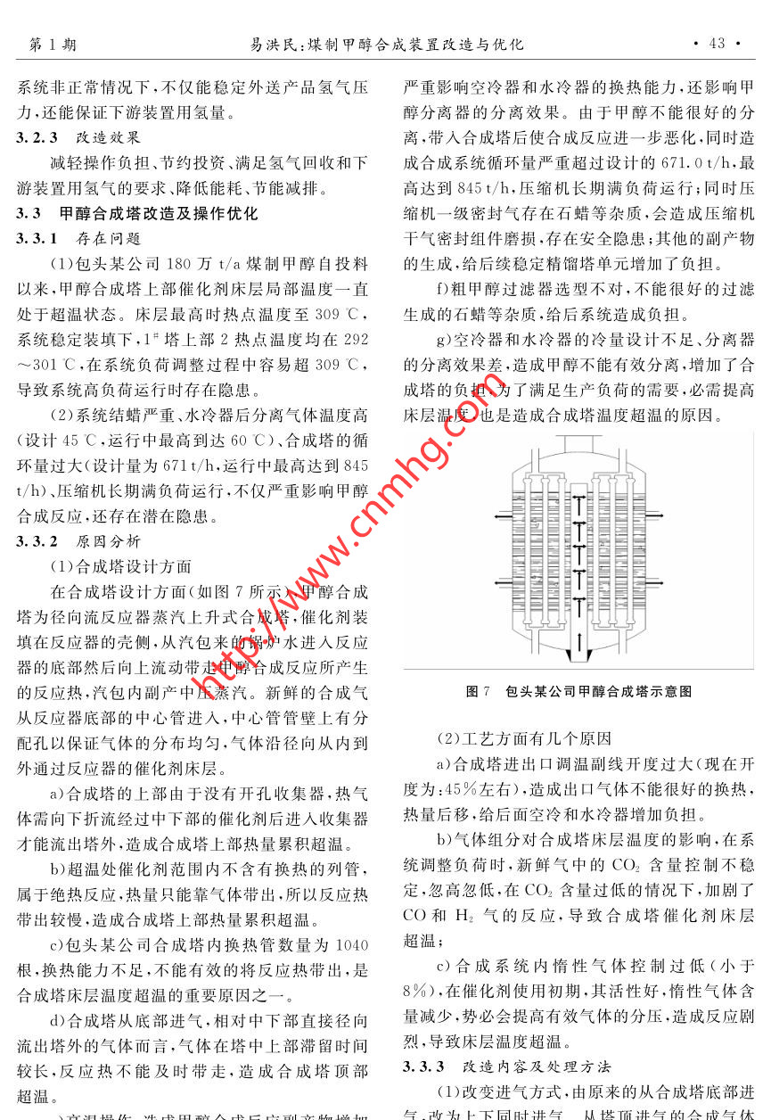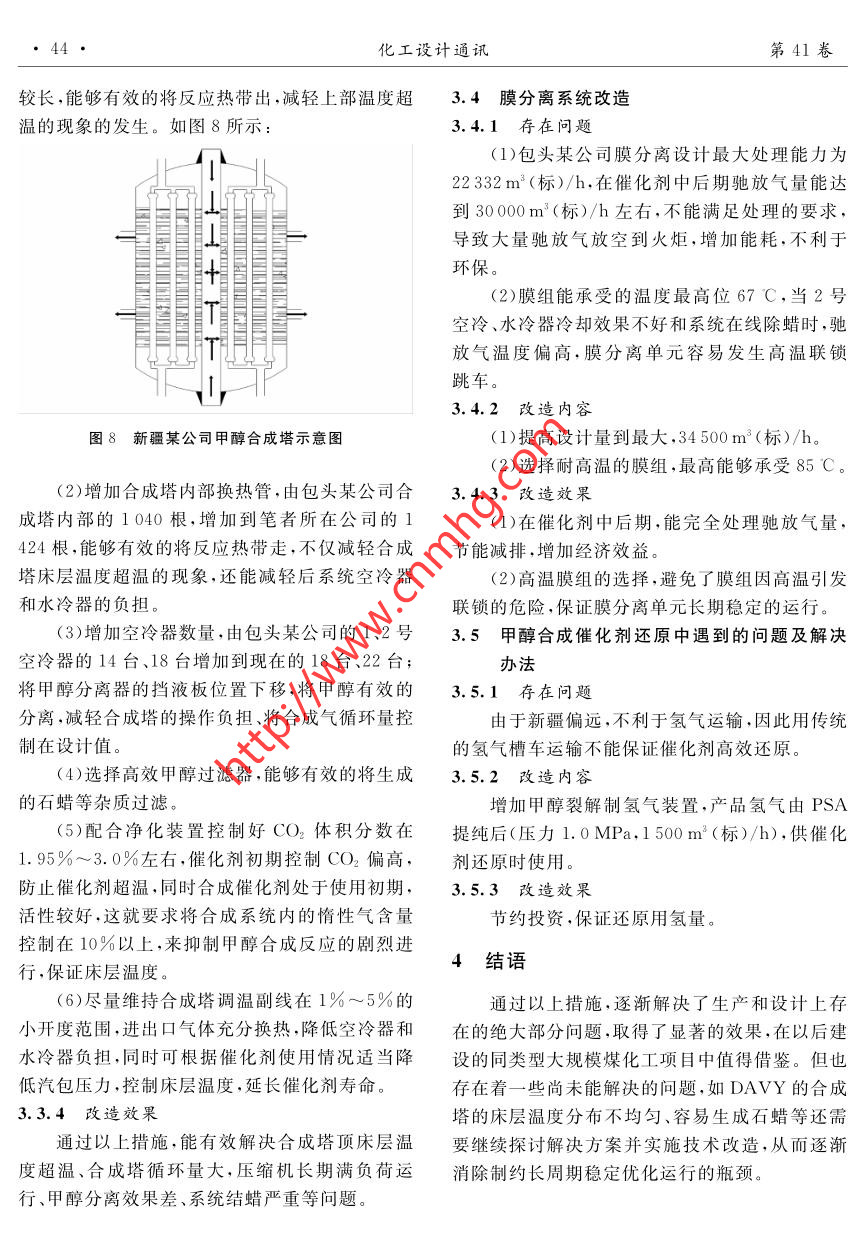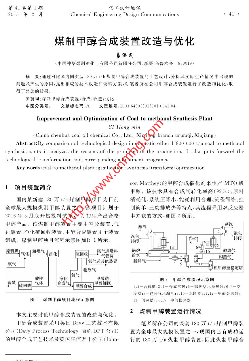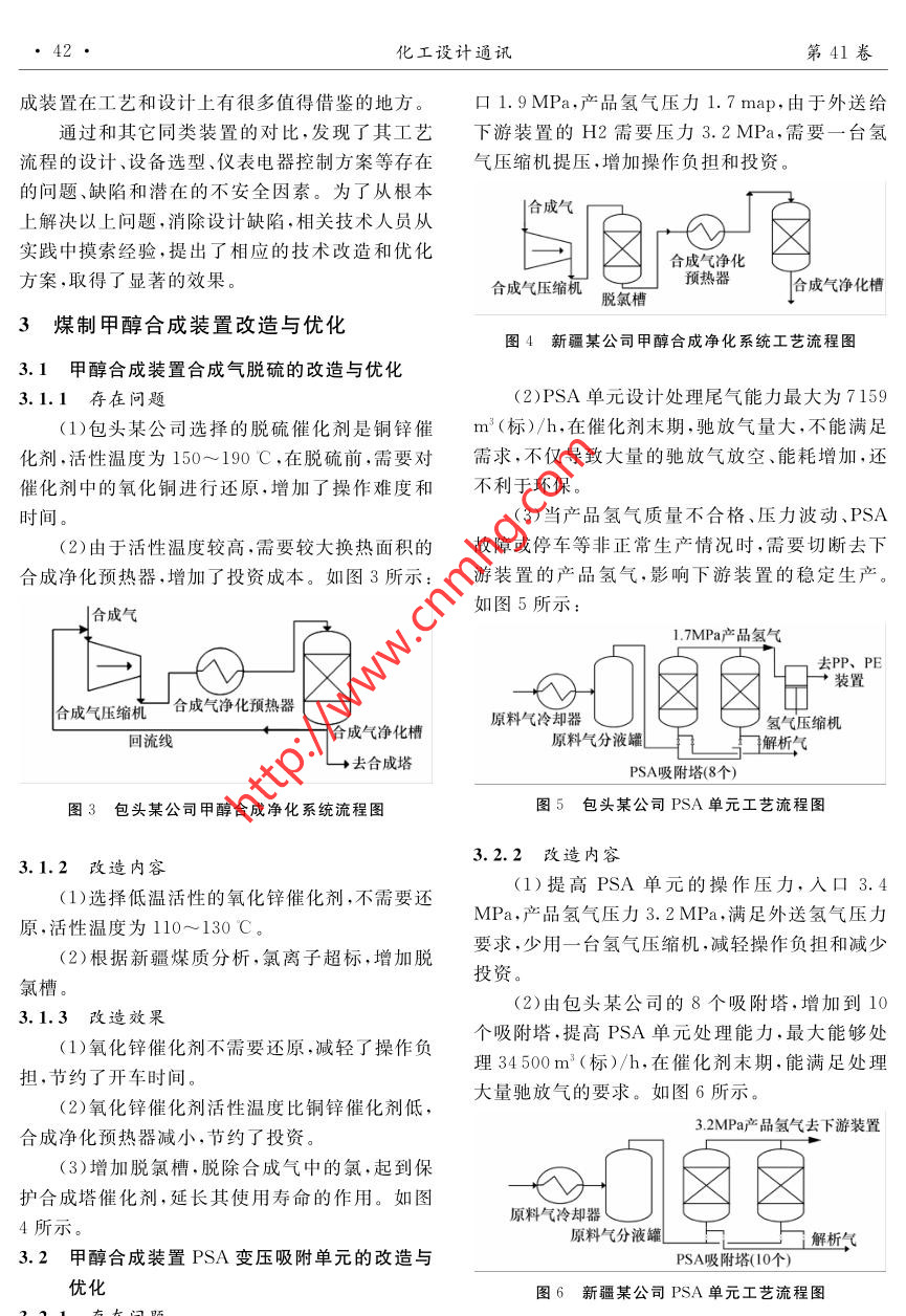 第41卷第1期化工設(shè)計(jì)通訊2015年2月Chemical Engineering Design Communications煤制甲醇合成裝置改造與優(yōu)化易洪民(中國(guó)神華煤制油化工有限公司新疆分公司,新疆烏魯木齊830019)摘要:通過(guò)對(duì)比國(guó)內(nèi)同類(lèi)型180萬(wàn)t/h煤制甲醇合成裝置的工藝設(shè)計(jì),分析其實(shí)際生產(chǎn)情況中出現(xiàn)的問(wèn)題及產(chǎn)生的原因,提出相應(yīng)的技術(shù)改造和調(diào)整方案,對(duì)筆者所在公司甲醇合成裝置進(jìn)行了改造和優(yōu)化,取得了顯著的效果。關(guān)鍵詞;煤制甲醇合成裝置;合成;改造;優(yōu)化中圖分類(lèi)號(hào):文獻(xiàn)標(biāo)志碼:A文章編號(hào):1003- -6490(2015)01-0041-04Improvement and Optimization of Coal to methanol Synthesis PlantYI Hong-min .(China shenhua coal oil chemical Co. , Ltd. Xinjiang branch urumqi, Xinjiang)Abstract: By comparison of technological design in domestic other 1 800 000 t/a coal to methanolsynthesis pants,it analyzes the reasons of the problems in the production. It also puts forward thetechnological transformation and corresponding adjustment programs. .Key words :coal to- methanol plant ; gasification; synthesis ;transform ; optimizationson Matthey)的甲醇合成催化劑來(lái)生產(chǎn)MTO級(jí)1項(xiàng)目裝置簡(jiǎn) 介甲醇。該技術(shù)具有合成氣轉(zhuǎn)化率高(99%)、原料國(guó)內(nèi)某新建180萬(wàn)t/a煤制甲醇項(xiàng)目為目前消耗低、系統(tǒng)壓降小、能耗利用合理、流程簡(jiǎn)練、控全球最大規(guī)模煤制甲醇裝置之一,該項(xiàng)目計(jì)劃于制 簡(jiǎn)單、三廢排放少等特點(diǎn),其流程采用雙反應(yīng)器2016年5月底開(kāi)始投料試車(chē),7月初生產(chǎn)出合格串并聯(lián)的方式,如圖2所示。甲醇產(chǎn)品。該煤制甲醇裝置主要由空分裝置、氣蒸汽化裝置、凈化硫回收裝置、甲醇合成裝置4個(gè)裝置泡包汽包排行組成。煤制甲醇項(xiàng)目流程示意圖如圖1所示。排污154中”14原料煤比化粗媒氣。凈化氫回收尾氣進(jìn)燃料鍋水二+8- 10馳放氣氣管網(wǎng)給水閃蒸氣_氧氣氫氣送其他裝置新鮮氣-空地電I 粗甲醇至穩(wěn)定塔酸性凈化氫氣甲醇送圖2甲醇合成流程示意圖硫磺硫回收一合成(|甲醇合成I1甲醇罐區(qū)、1、2-合成塔;3、4-合成汽包;5-鍋爐給水預(yù)熱器;6.7-空冷器;8-循環(huán)氣壓縮機(jī);9.10-水冷器;11.12-甲醇分離器;圖1煤制甲醇項(xiàng)目流程示意圖13-閃蒸槽;14、15-中間換熱器本文主要討論甲醇合成裝置的改造與優(yōu)化:2煤制甲醇裝置運(yùn)行情況甲醇合成裝置采用英國(guó)Davy工藝技術(shù)有限筆者所在公司的該套180萬(wàn)t/a 煤制甲醇裝公司(Davy Process Technology,簡(jiǎn)稱(chēng)DPT公司)置為全球最大規(guī)模裝置之- . ,現(xiàn)國(guó)內(nèi)已有成功運(yùn)的甲醇合成工藝技術(shù)及英國(guó)莊信萬(wàn)豐公司(John-行的180萬(wàn)t/a煤制甲醇裝置,因此煤制甲醇合收稿日期:2014-11-07作者簡(jiǎn)介:易洪民(1986-),男,漢族,重慶市人,助理工程師,主要從事煤制甲醇生產(chǎn)技術(shù)工作?!?2●化工設(shè)計(jì)通訊第41卷成裝置在工藝和設(shè)計(jì).上有很多值得借鑒的地方???.9MPa,產(chǎn)品氫氣壓力1. 7 map,由于外送給通過(guò)和其它同類(lèi)裝置的對(duì)比,發(fā)現(xiàn)了其工藝下游裝置的H2需要壓力3.2 MPa,需要一臺(tái)氫.流程的設(shè)計(jì)、設(shè)備選型、儀表電器控制方案等存在氣壓縮機(jī)提壓,增加操作負(fù)擔(dān)和投資。的問(wèn)題、缺陷和潛在的不安全因素。為了從根本|合成氣上解決以上問(wèn)題,消除設(shè)計(jì)缺陷,相關(guān)技術(shù)人員從實(shí)踐中摸索經(jīng)驗(yàn),提出了相應(yīng)的技術(shù)改造和優(yōu)化合成氣凈化方案,取得了顯著的效果。合成氣壓縮機(jī)脫氯槽預(yù)熱器合成氣凈化槽3煤制甲醇合成裝置改造與優(yōu)化圖4新疆某公司甲醇合 成凈化系統(tǒng)工藝流程圖3.1 甲醇合成裝置合成氣脫硫的改造與優(yōu)化3.1.1存在問(wèn)題(2)PSA單元設(shè)計(jì)處理尾氣能力最大為7159(1)包頭某公司選擇的脫硫催化劑是銅鋅催m' (標(biāo))/h,在催化劑末期,馳放氣量大,不能滿足化劑,活性溫度為150~190C.在脫硫前,需要對(duì)需求,不僅導(dǎo)致大量的馳放氣放空、能耗增加,還催化劑中的氧化銅進(jìn)行還原,增加了操作難度和不利于環(huán)保。時(shí)間。(3)當(dāng)產(chǎn)品氫氣質(zhì)量不合格、壓力波動(dòng)、PSA(2)由于活性溫度較高,需要較大換熱面積的故障或停車(chē)等非正常生產(chǎn)情況時(shí),需要切斷去下合成凈化預(yù)熱器,增加了投資成本。如圖3所示:游裝置的產(chǎn)品氫氣,影響下游裝置的穩(wěn)定生產(chǎn)。如圖5所示:1.7MPa產(chǎn)品氫氣去PP、PE'裝置合成氣凈化預(yù)熱器原料氣冷卻器) 氫氣壓縮機(jī)回流線原料氣分液罐解析氣L→去合成塔PSA吸附塔(8個(gè))圖3包頭某公司甲醇合成凈化系統(tǒng)流程圖.圖5包頭某公司PSA單元工藝流程圖3.2.2改造內(nèi) 容3.1.2改造內(nèi)容(1)選擇低溫活性的氧化鋅催化劑,不需要還.(1)提高PSA單元的操作壓力,人口3.4MPa,產(chǎn)品氫氣壓力3. 2MPa,滿足外送氫氣壓力原,活性溫度為110~130 C。(2)根據(jù)新疆煤質(zhì)分析,氯離子超標(biāo),增加脫要求,少用一臺(tái)氫氣壓縮機(jī),減輕操作負(fù)擔(dān)和減少投資。氯槽。(2)由包頭某公司的8個(gè)吸附塔,增加到103.1.3改造效 果(1)