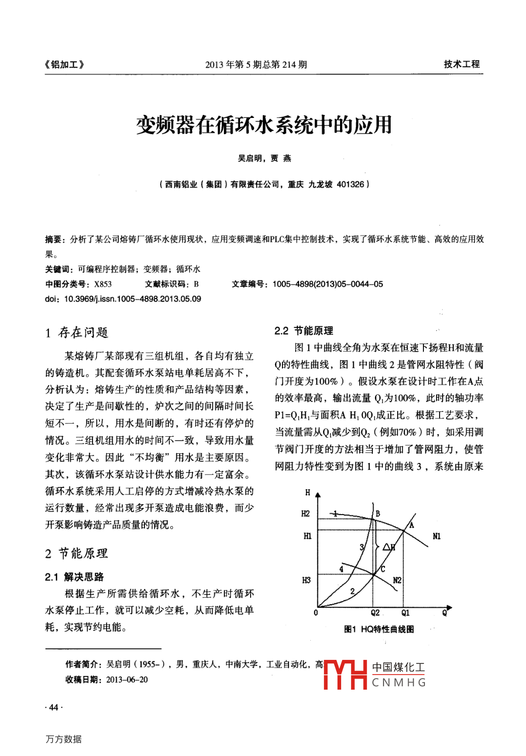 《鋁加工》2013年第5期總第214期技術(shù)工程變頻器在循環(huán)水系統(tǒng)中的應(yīng)用吳啟明,賈燕(西南鋁業(yè)(集團)有限責(zé)任公司,重慶九龍坡401326摘要:分析了某公司熔鑄廠循環(huán)水使用現(xiàn)狀,應(yīng)用變頻調(diào)速和PLC集中控制技術(shù),實現(xiàn)了循環(huán)水系統(tǒng)節(jié)能、高效的應(yīng)用效果關(guān)鍵詞:可編程序控制器;變頻器;循環(huán)水中圖分類號:X853文獻(xiàn)標(biāo)識碼:B文章編號:10054898(2013)05-0044-05doi:10.3969jisn.1005-48982013.05.091存在問題2.2節(jié)能原理圖1中曲線全角為水泵在恒速下?lián)P程H和流量某熔鑄廠某部現(xiàn)有三組機組,各自均有獨立的鑄造機。其配套循環(huán)水泵站電單耗居高不下,Q的特性曲線,圖1中曲線2是管網(wǎng)水阻特性(閥門開度為100%)。假設(shè)水泵在設(shè)計時工作在A點分析認(rèn)為:熔鑄生產(chǎn)的性質(zhì)和產(chǎn)品結(jié)構(gòu)等因素,決定了生產(chǎn)是間歇性的,爐次之間的間隔時間長的效率最高,輸出流量Q1為100%,此時的軸功率短不一,所以,用水是間斷的,有時還有停爐的P1=Q1H1與面積AH10Q1成正比。根據(jù)工藝要求,情況。三組機組用水的時間不一致,導(dǎo)致用水量當(dāng)流量需從Q減少到Q2(例如70%)時,如采用調(diào)變化非常大。因此“不均衡”用水是主要原因。節(jié)閥門開度的方法相當(dāng)于增加了管網(wǎng)阻力,使管網(wǎng)阻力特性變到為圖1中的曲線3,系統(tǒng)由原來其次,該循環(huán)水泵站設(shè)計供水能力有一定富余。循環(huán)水系統(tǒng)采用人工啟停的方式增減冷熱水泵的運行數(shù)量,經(jīng)常出現(xiàn)多開泵造成電能浪費,而少開泵影響鑄造產(chǎn)品質(zhì)量的情況。H2節(jié)能原理21解決思路根據(jù)生產(chǎn)所需供給循環(huán)水,不生產(chǎn)時循環(huán)水泵停止工作,就可以減少空耗,從而降低電單耗,實現(xiàn)節(jié)約電能。圖1HQ特性曲線圖作者簡介:吳啟明(1955-),男,重慶人,中南大學(xué),工業(yè)自動化,H中國煤化工收稿日期:2013-06-20CNMHG吳啟明,等:變頻器在循環(huán)水系統(tǒng)中的應(yīng)用技術(shù)工程的工況A點變到新的工況B點運行,由圖1中可以若采用變頻,能量節(jié)約非常顯著。看出,揚程反而增加了,軸功率P2與面積BHOQ2成正比,減少不多。3方案制定如果采用變頻調(diào)速控制方式,將水泵轉(zhuǎn)速由3.1節(jié)能技改內(nèi)容N降到N2,根據(jù)水泵的比例定律,可以畫出在轉(zhuǎn)(1)將該循環(huán)站循環(huán)系統(tǒng)由手動控制改為變速N2下?lián)P程H和流量Q特性如圖1中的曲線4所頻自動控制。示,可見在滿足同樣流量Q2的情況下,揚程H將(2)實現(xiàn)該循環(huán)站循環(huán)系統(tǒng)與鑄造機的聯(lián)動大幅度降低,功率P3(相等于面積CHOO2)也隨控制,采集鑄造機水閥的開關(guān)信號、流量信號,著顯著減少,節(jié)省的功率△P=△HQ與面積BHHC將其作為冷水泵啟動以及停用水后水泵延時全停成正比,節(jié)能的效果是十分明顯的。的控制參數(shù)。根據(jù)流體力學(xué)理論,電機軸功率P和流量Q揚(3)該循環(huán)站循環(huán)系統(tǒng)熱水泵根據(jù)熱水池程H之間的關(guān)系為:P=KHQn的水位進(jìn)行控制,當(dāng)水位高于設(shè)定液位時,水泵式中:K為常數(shù);n為效率。自動啟動,水位降低到設(shè)定液位時,水泵停止運它們與轉(zhuǎn)速N之間的關(guān)系為行Q,/Q=NN2(4)原來手動控制的出口閥門,若改為自動H,H=(NN2)2控制就必須在冷水泵的出口閥門與水泵中間增加P,/P=(N/N2 )3止回閥,避免因備用的水泵因受管網(wǎng)帶壓水流驅(qū)流量Q與轉(zhuǎn)速的一次方成正比,揚程H與轉(zhuǎn)速動而反轉(zhuǎn),造成水泵損壞。的平方成正比,軸功率P與轉(zhuǎn)速的立方成正比,當(dāng)(5)水泵啟停由原來的手動啟停,變?yōu)樽詣恿髁繙p少,水泵轉(zhuǎn)速下降時,軸功率下降很多。啟停,啟動方式由原來的直接啟動變改為PLC集中例如流量下降到80%,轉(zhuǎn)速也下降到80%時,則軸控制。功率下降到額定功率的51%;如流量下降到50%,3.2節(jié)能技改方案功率P可下降到額定功率的13%,當(dāng)然由于實際工該循環(huán)站循環(huán)系統(tǒng)分為熱水循環(huán)和冷水循況的影響,節(jié)能的實際值不會有這么突出,即使環(huán),兩個循環(huán)是一個整體,冷水循環(huán)主要是將冷這樣,節(jié)能的效果也是十分明顯的。水池的冷水輸送到車間鑄造機,熱水循環(huán)是將熱變頻節(jié)能原理如圖2所示。水池的熱水輸送到冷卻塔冷卻后流到冷水池由圖2可見,當(dāng)實際流量小于額定流量時,3.2.1冷水循環(huán)冷水循環(huán)是閉口系統(tǒng),車間鑄造機并不是同時開,同時關(guān)。水泵的啟停和運行臺數(shù)是人為決定,所有系統(tǒng)壓力會有波動,范圍為0.25~0MPa,正常生產(chǎn)需要壓力為03MPa左右。當(dāng)鑄造機運行臺數(shù)少時,管網(wǎng)內(nèi)壓力就會達(dá)到⊥L變頻器控制0.35~04MPa,壓力過高就造成浪費能量,同時壓力的波動會造成鑄造產(chǎn)品質(zhì)量的不合格。正常情流量/%況下系統(tǒng)需圖2功率、流量曲線圖THa中國煤化工案采用兩臺CNMHG《鋁加工》2013年第5期總第214期技術(shù)工程變頻器分別控制兩臺常用水泵。如果采用一臺水檢測熱水池和冷水池液位泵變頻,當(dāng)兩臺泵運行壓力高時,停止一臺工頻泵,工頻泵直接停止,會對管網(wǎng)的壓力造成