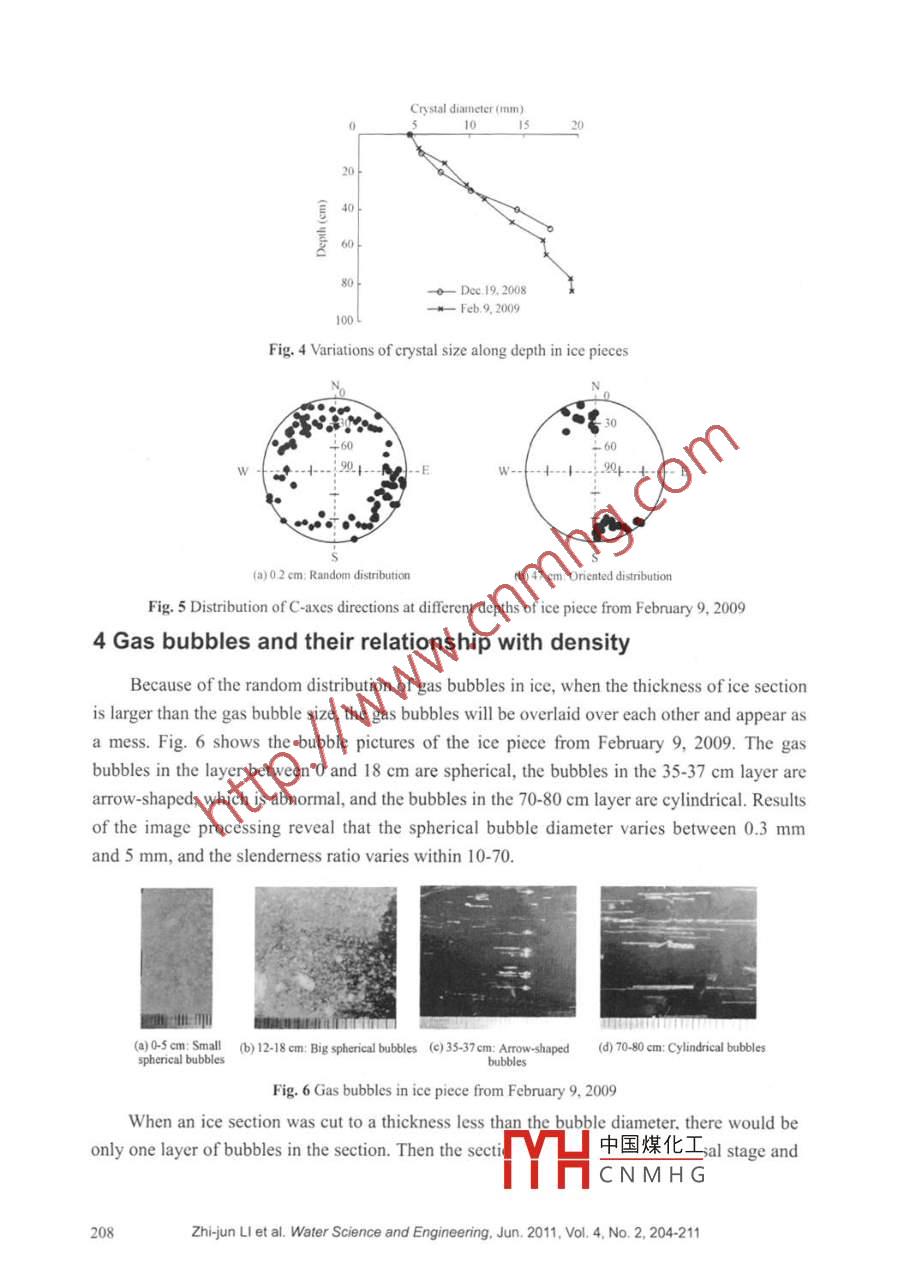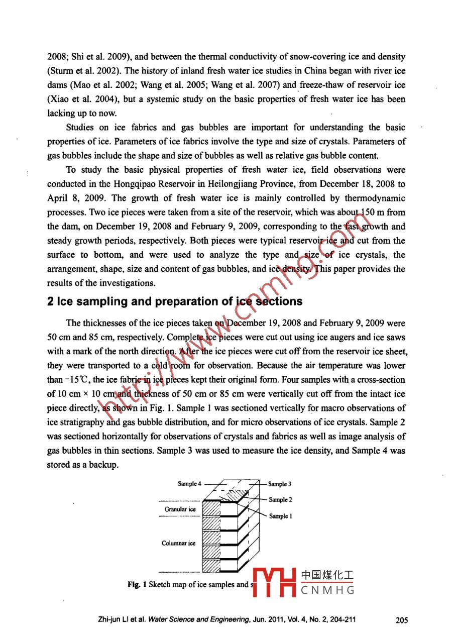 Water Science and Engineening, 2011, 4(2): 204-211doi:103882jisn167423702011.02008http://www.waterjournal.cnemailwse2008@vip.163.comDistributions of crystals and gas bubbles inreservoir ice during growth periodZhi-jun LI*, Wen-feng HUANG, Qing JIA" 2, Matti LEPPARANTAI. State Key laboratory of Coastal and Offshore Engineering, Dalian University of TechnologyDalian 116024. P. R. china2. College of Water Conservancy and Hydropower, Heilongjiang University Harbin 150086, P.R. China3. Department of Physics, University of Helsinki, Helsinki F1-00014, FinlandAbstract: In order to understand the dominant factors of the physical properties of ice in icehemodynamics and mechanics, in-situ observations of ice growth and decay processes werecarried out. Two samplings were conducted in the fast and steady ice growth stages. Ice pieces wereused to observe ice crystals and gas bubbles in ice, and to measure the ice density. vertical profilesof the type and size of ice crystals, shape and size of gas bubbles, and gas bubble content, as well asthe ice density, were obtained. The resuits show that the upper layer of the ice pieces is granular iceand the lower layer is columnar ice; the average crystal size increases with the ice depth and remainssteady in the fast and steady ice growth stages; the shape of gas bubbles in the upper layer of icepieces is spherical with higher total content, and the shape in the middle and lower layers is cylinderwith lower total content; the gas bubble size and content vary with the ice growth stage; and the icedensity decreases with the increase of the gas bubble contentKey words: ice crystal; gas bubble; crystal structure; porosity: ice density1 IntroductionIce crystals and gas bubbles control ice electronics(Li et al. 2010a), optics Light et al2003), and mechanics(Timco and Weeks 2010)to a large degree, and also play a key role inice remote sensing(Shokr and Sinha 1994). The ice fabric determines the diffusion of lightthat have impacts on living conditions of under-ice creatures and sea ice ecology(belzile et al2001). A large number of studies and observations have been carried out on the relationshipbetween ice properties and density or porosity that can shed light on gas bubbles in ice(Timcoand Frederking 1996). Recent publications address the relationships between the density andporosity(Consolmagno et al. 2008), between the uniaxial compressive strength and porosity(Moslet 2007), between the coefficient of thermal properties of ice and porosity (Usowicz et alThis work was supported by the National Natural Science Fe中國(guó)煤化工50879008,theOpen Fund of State Key Laboratory of Frozen Soil Engine904), the VilhoYrjo and Kalle vaisala Fund of the Finnish Academy of SYHCNMH Gegian researchCouncil Project AMORA( Grant No. 193592/S30)Correspondingauthor(e-mail:lizhjun@dlut.edu.cn)Received Dec 23, 2010; accepted May 11, 20112008; Shi et al. 2009), and between the thermal conductivity of snow-covering ice and density( Sturm et al. 2002). The history of inland fresh water ice studies in China began with river icedams(Mao et al. 2002; Wang et al. 2005; Wang et al. 2007)and freeze-thaw of reservoir ice(Xiao et aL. 2004), but a systemic study on the basic properties of fresh water ice has beenlacking up to now.Studies on ice fabrics and gas bubbles are important for understanding the basicproperties of ice. Parameters of ice fabrics involve the type and size of crystals. Parameters ofgas bubbles include the shape and size of bubbles as well as relative gas bubble content.To study the basic physical properties of fresh water ice, field observations wereconducted in the Hongqipao reservoir in Heilongjiang Province, from December 18, 2008 toApril 8, 2009. The growth of fresh water ice is mainly controlled by thermodyprocesses. Two ice pieces were taken from a site of the reservoir, which was about 150 m fromthe dam, on December 19, 2008 and February 9, 2009, corresponding to the fast growth andsteady growth periods, respectively. Both pieces were typical reservoir ice and cut from thesurface to bottom, and were used to analyze the type and size of ice crystals, thearrangement, shape, size and content of gas bubbles, and ice density. this paper provides theresults of the investigations.2 Ice sampling and preparation of ice sectionsThe thicknesses of the ice pieces taken on December 19, 2008 and February 9, 2009 were50 cm and 85 cm, respectively. Complete ice pieces were cut out using ice augers and ice sawswith a mark of the north direction. After the ice pieces were cut off from the reservoir ice sheet,they were transported to a cold room for observation. Because the air temperature was lowerthan-15C, the ice fabric in ice pieces kept their original form Four samples with a cross-sectionof 10 cm x 10 cm and thickness of 50 cm or 85 cm were vertically cut off from the intact icepiece directly, as shown in Fig. 1. Sample l was sectioned vertically for macro observations ofice stratigraphy and gas bubble distribution, and for micro observations of ice crystals. Sample 2was sectioned horizontally for observations of crystals and fabrics as well as image analysis ofgas bubbles in thin sections. Sample 3 was used to measure the ice density, and Sample 4 wasstored as a backup.Granular iceSample 1中國(guó)煤化工Fig. 1 Sketch map of ice samples andCNMHGZhi-jun LI et al. water Science and Engineering, Jun. 2011, Vol. 4, No. 2, 204-211205The surface of Sample I was smoothened along the vertical direction and photographedwith a dark background in order to obtain the macro features of the stratigraphy and gasbubbles in ice It was then cut into vertical sections with intervals between 8 cm and 10 cm.Concurrently, Sample 2 was cut into horizontal sections with intervals between 8 cm and 10 cmAll of these horizontal sections were labeled with the north direction, and then smoothenedand affixed to glass sheets with a temperature initially slightly above 0C. After they werere-frozen, t