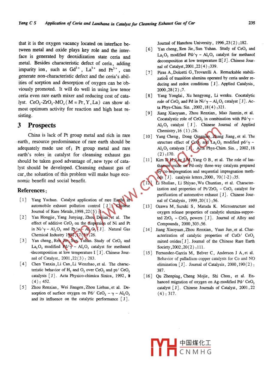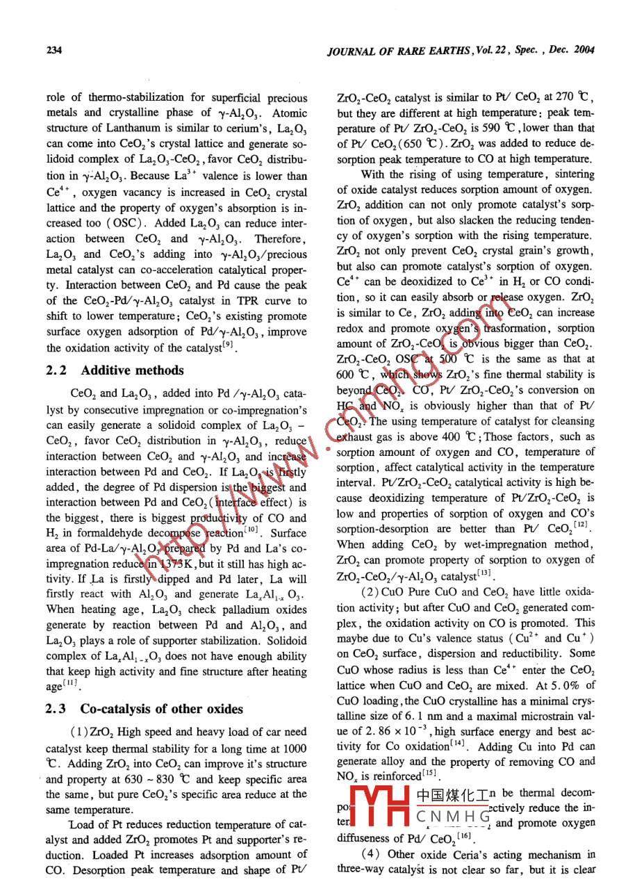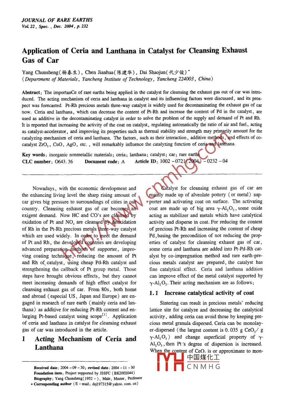 JOURNAL OF RARE EARTHSoL22,spec.,Dec.2004,p.232Application of Ceria and Lanthana in Catalyst for Cleansing ExhaustGas of CarYang Chunsheng(楊春生), Chen Jianhua(陳建華), Dai Shaojun(代少俊)Department of Materials, Yancheng institute of Technology, Yancheng 224003, China)Abstract: The importan Ce of rare earths being applied in the catalyst for cleansing the exhaust gas out of car was intro-duced.The acting mechanism of ceria and lanthana in catalyst and its influencing factors were discussed, and its pros-pect was forecasted. Pt-Rh precious metals three-way catalyst is widely used for decontaminating the exhaust gas of carnow. Ceria and lanthana, which can decrease the content of Pt-Rh and increase the content of pd in the catalyst, areused as additive in the decontaminating catalyst in order to solve the problem of the supply and demand of Pt and RhIt is reported that increasing the activity of the coat on catalyst, regulating automatically the ratio of air and fuel, actingas catalyst-accelerator, and improving its properties such as thermal stability and strength may primarily amount for thecatalyzing. mechanism of ceria and lanthana. The factors, such as their interaction, additive methods, and effects ofcatalyst ZrO,, CuO, AgO, etc, will remarkably influence the catalyzing function of ceria and lanthanaKey words: inorganic nonmetallic materials; ceria; lanthana; catalyst; car; rare earthsCLC number: 0643. 36 Document code: A Article ID: 1002-0721(2004)-0232-04Nowadays, with the economic devCatalyst for cleansing exhaust gas of car arethe enhancing living level the sharp rising amount of mainly made up of alveolate pottery (or metal)sup-car gives big pressure to surroundings of cities in our porter and activating coat on surface. The activatingcountry. Cleansing exhaust gas of car becomes an coat are made up of big area y-Al2O3, some oxideexigent demand. Now HC and CO's are cleansed by acting as stabilizer and metals which have catalyticaloxidation of Pt and NO, are cleansed by deoxidation activity and disperse in coat For reducing the contentof Rh in the Pt-Rh precious metals three-way catalyst of precious Pt-Rh and increasing the content of cheapwhich are used widely. In order to meet the demand Pd, basing the precondition of not reducing the propof Pt and Rh, the developed countries are developing erties of catalyst for cleansing exhaust gas of caradvanced preparation methods of supporter, impro. some ceria and lanthana are added into Pt-Pd-Rh catving coating technique, reducing the amount of Pt alyst by co-impregnation method and rare earth-pre-and Rh of, catalyst, using cheap Pd-Rh catalyst and cious metals catalyst are prepared, the catalyst hasstrengthening the callback of Pt group metal. Those fine catalytical effect. Ceria and lanthana additionsteps have brought obvious effects, but they cannotan improve effect of the metal catalyst supported bymeet increasing demands of high effect catalyst for y-Al2O3. Their acting mechanism are as follows:cleansing exhaust gas of car. From 80s, both homeand eu1.1 Increase catalytical activity of coatire engaged in research of rare earth( mainly ceria and lan-Sintering can result in precious metals'reducingthana) as additive for reducing Pt-Rh content and enlattice site for catalyze and decreasing the catalyticallarging Pt-based catalyst using scope. Application activity, adding ceria can avoid those by keeping pre-of ceria and lanthana in catalyst for cleansing exhaust cious metal granula dispersed. Ceria can be monolay-gas of car was introduced in the articleer-dispersed( the largest content is 0.035 g CeO,/gActing Mechanism of Ceria and Y-Al,)and change superficial property of y-LanthanaALO3, then Pts degree of dispersion is increasedReceived date: 2004-09-30: revised date: 2004-1lTHGNMHGFoundation item: Project supported by JSSFC ( BK2002044)Biography: Yang Chunsheng( 1952-), Male, Master, ProfessoCorrespondingauthor(E-mail:dsj197315@yahoo.com.cn)Yang CS Application of Ceria and Lanthana in Catalyst for Cleansing Exhaust Gas of Car233olayer-dispersion capacity, Pt's degree of dispersioncrease transform of water gas and reforming of watercan reach extreme 2. Rh2O, generated by high tem- vapor, and reduce the content of H, and CO. La, O,perature oxidation can form solid solution with y- can increase reaction conversion of transform of waterAL2O, and lose the catalytical activity when Rh is in gas and reforming of water vapour, produced hydro-oxygen condition and temperature is above 600 Cgen gas does good to NO,'s reduction. AddingCeO, can reduce reaction between Rh and Al,,La, O, can increase Pd' reduction property of NO, inkeep activity of Rh. La2O, also can prevent the enlar- Pd catalyst or Pd-enriched catalyst, the Pd-La,Ogenet of Pt particle. Added into Pd/y-Al2O3, CeO 2alyst's catalytical effect is the same as that of Pt-an promote Pds dispersing in supporter and generateRh catalystco-deoxidize. High dispersion of Pd and the interThe effect of La,O, addition on catalytic proper-key role in high catalytical activin.( y-AL2O, play ty of Pd/ Ce02/y-AL,O, catalyst for methanol decom-tion between- Al,O, and CeO, in Pdpositior was investigated. The results showed thatCeo, is an effective catalyst for hydrocarbon's adding La, O, can reduce by-product( dimethyloxidation. When CO is oxidized in Pd/Y-Al2Oether) and increasing the catalytic activity. Methanoltice oxygen between Pt and CeO,s surface play imconversion reached a maximum( ca. 91. 4%)whenthe La, o, content increased to 10%. La,o could beportant role. CeO2's surface can generate low valence Ce in vacuum or reduce condition and oxygendispersed well on Y-AL,O, and promoted the disper-sion and the reduction of CeO, furthermore, the dis-bug which has high catalyze for redox and functionspersion of Pd and interaction betweenof adsorbing molecular exchange charge. CeO, canwas also increased, which results in high catalytic acgenerate low valence Ce and space oxygen because of tiv