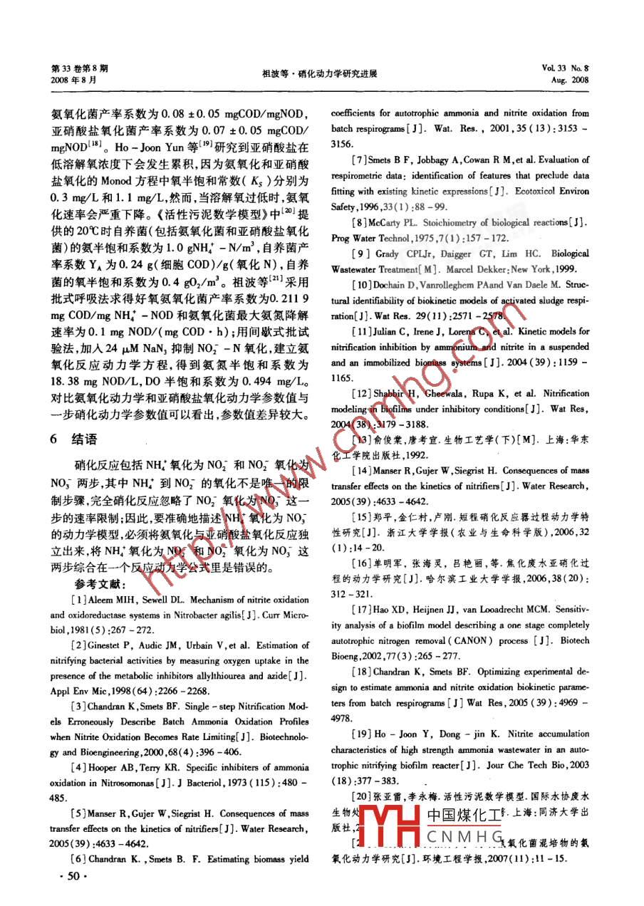 第33卷第8期環(huán)境科學(xué)與管理Vol 33 No 82008年8月ENVIRONMENTAL SCIENCE AND MANAGEMENTAug.2008文章編號(hào):1673-1212(2008)08-0047-04硝化動(dòng)力學(xué)研究進(jìn)展祖波1,祖建(1重慶交通大學(xué)河海學(xué)院重慶4004;2.西南石油大學(xué)理學(xué)院,四川成都610500摘要:硝化反應(yīng)包括NH氧化為NO2和NO2氧化為NO兩步,其中NH到NO2的氧化不是唯一的限制步驟;已發(fā)現(xiàn)疊氮化鈉(NaN3)能有效的抑制亞硝酸鹽氧化;兩烯基硫脲(ATU)抑制氨氧化反應(yīng)。用呼吸儀的綜合參數(shù)——細(xì)最大氧吸收速率(OUR_X)來(lái)描繪好氧氨氧化菌和亞硝酸鹽氧化菌的比生長(zhǎng)速率具有準(zhǔn)確性和唯一性,并得到了較多學(xué)者一致認(rèn)可。濃度較高的氣氣和亞硝態(tài)氮分別抑制氧化反應(yīng)和亞硝酸鹽氧化反應(yīng),用抑制性動(dòng)力學(xué)方程來(lái)分別描迷高濃度氨濃度和亞硝態(tài)氮濃度對(duì)氯氧化反應(yīng)和亞硝酸鹽氧化反應(yīng)的影響;對(duì)比氯氧化動(dòng)力學(xué)和亞硝酸鹽氧化動(dòng)力學(xué)參數(shù)值與一步硝化動(dòng)力學(xué)參數(shù)值可以看出,參數(shù)值差異較大;因此,要準(zhǔn)確地描述NH氧化為NO3的動(dòng)力學(xué)型,必須將氬氧化與亞硝酸鹽氧化反應(yīng)獨(dú)立出來(lái)將№H氧化為NO2和NO2氧化為NO3這兩步綜合在一個(gè)反應(yīng)動(dòng)力學(xué)公式里是錯(cuò)誤的。關(guān)鍵詞:氨氧化;亞硝酸鹽氧化;動(dòng)力學(xué);抑制性中圖分類號(hào):X703文獻(xiàn)標(biāo)識(shí)碼:AKinetic Study of Nitrificationzu Bo,zuJian(1. School of River and Ocean Engineering, Chongqing Jiaotong University, Chongqing 400074, China;2. School of Sciences, Southwest Petroleum University, Chengdu 610500, China)Abstract: Nitrification involves the sequential biological oxidation of reduced nitrogen species such as ammonium-nitrogen(NH:)to nitrite-nitrogen(NO )and nitrate-nitrogen(NO,), and NHA to NO, oxidation was not the sole rate-limitingstep. It has been found that Azide(NaN, )could inhibit NO to NO, oxidation and Allylthiourea( ATU)could inhibit NH toNO, oxidation. A lost of researchers thought that only the parameter combination representing maximum specific oxygen uptake rate(OUR/X) is uniquely identifiable from batch respirograms for the maximum specific growth rate coefficient of autotrophic aerobicammonia oxidation bacteria and nitrite oxidation bacteria. High ammonium nitrogen and nitrite nitrogen could inhibit ammonium oxi-and nitrite oxidation, respectively. The effect of high ammonium nitrogen and nitrite nitrogen to ammonium oxidation and ni-oxidation can be described by inhibitions model, respectively. Compared the kinetic parameters of ammonium oxidation and ni-oxidation with the kinetic parameters of nitrification, the difference was big. Therefore, the adequacy of modeling NH,tooxidation as one composite biochemical reaction was examined at different relative dynamics of NH to NO, and NO2 tooxidation. The use of single-step models to describe batch NH4 to NO, xidation yields erroneous kinetic parametersKey words: ammonium oxidation; nitrite oxidation; kinetics; inhibit近幾年來(lái)已發(fā)現(xiàn)疊氮化鈉(NaN3)能有效的抑生長(zhǎng)速率具有準(zhǔn)確性和唯一性6,并得到了較多學(xué)制亞硝酸鹽氧化1-;丙烯基硫脲(ATU)抑制氨氧者一致認(rèn)可33。有學(xué)者認(rèn)為硝化反應(yīng)將NH‘氧化化反應(yīng)5。有研究認(rèn)為用呼吸儀的最大比好氧吸至NO2和NO2氧化至NO兩步綜合在一個(gè)反應(yīng)收速率來(lái)描繪好氧氨氧化菌和亞硝酸鹽氧化菌的比動(dòng)力學(xué)公式中是不正確的。本文綜述了硝化動(dòng)力學(xué)研究進(jìn)展,為開(kāi)發(fā)新型生物脫氮工藝和科學(xué)研究收稿日期:2008-03-26積累基礎(chǔ)資料。項(xiàng)目來(lái)源:重慶交通大學(xué)引進(jìn)人才基金項(xiàng)目:重慶市自然科學(xué)基金項(xiàng)目1中國(guó)煤化工作者簡(jiǎn)介:祖波(1980-),男,重慶市人,博士,主要研究方向廢水處CNMHG理理論與技術(shù)、環(huán)境生態(tài)技術(shù)。了升界,平爾雙捆述為細(xì)菌增長(zhǎng)的化通訊聯(lián)系人:祖波學(xué)需氧量(COD)與底物消耗的COD的比例;采用批第33卷第8期oL 332008年8月祖波等·硝化動(dòng)力學(xué)研究進(jìn)展式呼吸作圖法和電子平衡方程估計(jì)產(chǎn)率系數(shù):被氧化為NO3-N(N+V),只有(1/8)meq電子可利(1)用。類似NH-N氧化只有fm8的mea電子被用于生物合成反應(yīng)來(lái)生成∫ mg X cod,如此剩余式中:S—消耗底物濃度( mg COD/L)的(1-fs,)/8meq電子被用于還原(1-fs)mg0—氧的總累積消耗量(mgO2L)O2作為最終電子受體。因?yàn)樵贜O2-N氧化為NO3用于生物合成的電子占總電子的分?jǐn)?shù)N整個(gè)過(guò)程中,對(duì)于亞硝酸鹽氧化菌而言NH-Nmg COD/mg COD)8對(duì)于氨氧化反應(yīng)用于生物合成的電子占總電是首選的同化氮源,因此子的分?jǐn)?shù)(fu)通常被描述為單位氮氧化產(chǎn)生的細(xì)胞COD而不是單位氮消耗產(chǎn)生的細(xì)胞COD9。由OUn/(1-fs,nb)于自養(yǎng)菌和異養(yǎng)菌生長(zhǎng)的差異,方程(1)不能用來(lái)(SNo2。-0Uw)估計(jì)好氧氨氧化菌的f。(見(jiàn)圖1)1 ng NOD(1-∫)/8mmol(1-/)mgo2(1-fs)mg O2(1-fs)18meq電子NH4-N1/8 mmol氧化1/8電子參加反應(yīng)∫。/8mmol電子fs18meq電子的N:N」·」gMO0c0定]0細(xì)菌s+ mg CODNH-NcO,鬨定細(xì)菌可化NO:-N同化圖1NH-N氧化為NO2-N過(guò)程中的氮去除、氧消耗和細(xì)菌生長(zhǎng)之間的化學(xué)計(jì)量學(xué)關(guān)系圖2NO2-N氧化