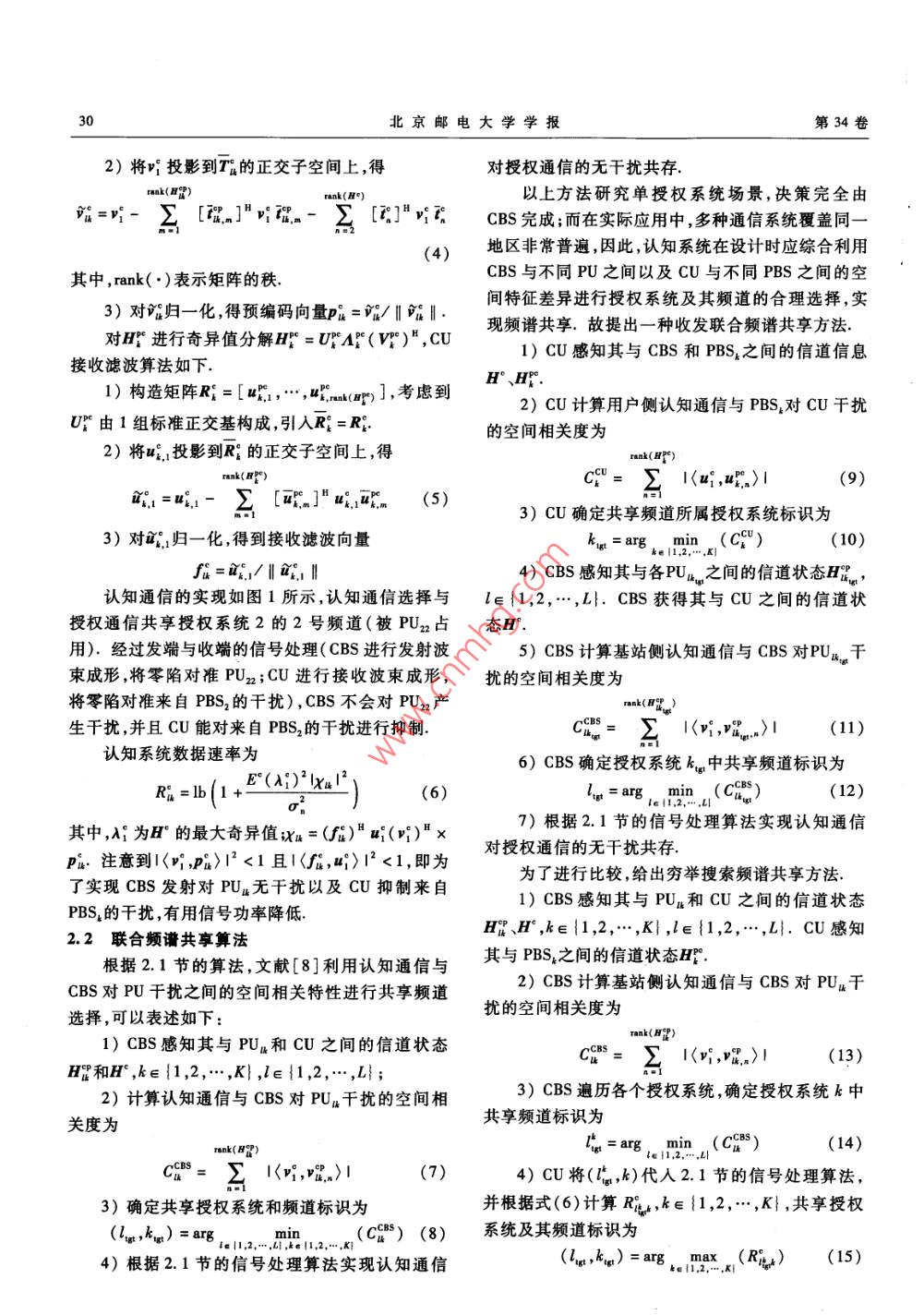 2011年12月北京郵電大學(xué)學(xué)報(bào)Dec.2011第34卷第6期Journal of Beijing University of Posts and TelecommunicationsVol 34 No 6文章編號(hào):10075321(2011)060028405認(rèn)知無線電網(wǎng)絡(luò)基于空分復(fù)用的聯(lián)合頻譜共享李釗,楊家瑋,肖麗媛(西安電子科技大學(xué)綜合業(yè)務(wù)網(wǎng)理論及關(guān)鍵技術(shù)國家重點(diǎn)實(shí)驗(yàn)室,西安710071)摘要:針對(duì)多天線認(rèn)知無線電網(wǎng)絡(luò)提出一種基于空分復(fù)用的收發(fā)聯(lián)合頻譜共享方法.綜合利用認(rèn)知通信與系統(tǒng)間干擾的空間相關(guān)特性,在無空閑頻譜資源可用時(shí)合理選擇授權(quán)系統(tǒng)及其頻道并以空分復(fù)用的方式實(shí)現(xiàn)頻譜共享相比于僅在認(rèn)知基站端進(jìn)行選擇以及窮舉搜索該方法能獲得接近最佳的系統(tǒng)吞吐率特性,并且具有低的復(fù)雜度關(guān)詞:認(rèn)知無線電;多天線;空分復(fù)用;波束成形;預(yù)編碼中圖分類號(hào):TN929.5文獻(xiàn)標(biāo)志碼:ASpace Division Multiplexing Based Joint SpectrumSharing in Cognitive Radio NetworksLI Zhao, YANG Jia-wei, XIAO Li-yuan(State Key Laboratory of Integrated Service Networks, Xidian University, Xi'an710071,ChinaAbstract: A space division multiplexing based joint transmit-receive spectrum sharing method in cognitive radio networks is proposed. By exploiting spatial correlation features between cognitive transmissionand interference among different systems, appropriate primary system and its channel could be selectedunder the condition that no idle spectrum resource is available. Consequently, the spectrum sharing iscarried out using space division multiplexing. Compared with the method implemented only at cognitivebase station and exhaustive searching, the proposed scheme could achieve near-optimal system throughputperformance with reduced complexityKey words: cognitive radio; multiple antennas; space division multiplexing; beamforming; precoding近年來頻譜資源稀缺與傳統(tǒng)的固定頻譜分配在實(shí)際應(yīng)用中,多種通信系統(tǒng)覆蓋同一地區(qū)非常普方式導(dǎo)致的頻譜資源利用率低的矛盾日益突出,遍,筆者針對(duì)多天線CRN設(shè)計(jì)了一種基于空分復(fù)用作為頻譜共享與重用技術(shù)重要研究內(nèi)容的認(rèn)知無線的收發(fā)聯(lián)合頻譜共享方法,綜合利用認(rèn)知通信與授電2(CR)和認(rèn)知無線電網(wǎng)絡(luò)(CRN)技術(shù)受到了權(quán)通信和系統(tǒng)間干擾的空間特征,實(shí)現(xiàn)了基于空分廣泛關(guān)注,傳統(tǒng)的CR或CRN關(guān)注頻譜資源的機(jī)會(huì)復(fù)用的聯(lián)合頻譜共享共享,而通信是對(duì)包括頻率在內(nèi)的多種類型資源1系統(tǒng)模型的綜合使用,一部分研究將多輸入多輸出技術(shù)與CR結(jié)合,設(shè)計(jì)頻譜共享和聯(lián)合資源管理方法63研究K個(gè)授權(quán)系統(tǒng)與認(rèn)知系統(tǒng)共同覆蓋的下收稿日期:201101-12基金項(xiàng)目:國家杰出青年科學(xué)基金項(xiàng)目(60725105);國家重點(diǎn)基礎(chǔ)研究發(fā)展計(jì)劃項(xiàng)目(2009cB20404);長江學(xué)者和創(chuàng)新團(tuán)隊(duì)發(fā)展計(jì)劃項(xiàng)目(Rm0852);國家自然科學(xué)基金項(xiàng)目(61102057);高等學(xué)校引智計(jì)劃項(xiàng)目(B08038);中央高?;究蒲袠I(yè)務(wù)費(fèi)專項(xiàng)資金項(xiàng)目(K50510010022);ISN項(xiàng)目(IsN作者簡(jiǎn)介:李釗(1981-),男,博士,副教授,E-mal:ii1912@126.com第6期李釗等:認(rèn)知無線電網(wǎng)絡(luò)基于空分復(fù)用的聯(lián)合頻譜共享行通信場(chǎng)景,每個(gè)授權(quán)系統(tǒng)包含1個(gè)基站和多個(gè)用下討論在授權(quán)頻道全忙的假設(shè)下進(jìn)行,這與傳統(tǒng)認(rèn)戶,認(rèn)知系統(tǒng)中包含1個(gè)基站和1個(gè)用戶,即不考慮知的機(jī)會(huì)頻譜接入并不矛盾,而是作為存在空閑頻認(rèn)知用戶(cU, cognitive user)之間的競(jìng)爭(zhēng)與干擾,譜時(shí)機(jī)會(huì)接入策略的補(bǔ)充如圖1所示2.1信號(hào)處理研究下行通信時(shí),PBS與CBS的發(fā)射功率分別波束成陷對(duì)準(zhǔn)為E和E,為便于分析,假設(shè)各基站發(fā)射功率相認(rèn)知通信同,有E=E=E.基站與用戶采用波束成形(BF,A.8陷動(dòng)8“8beamforming)的方式進(jìn)行通信,則PBS向占用頻道l的PUa發(fā)射的符號(hào)為x,CBS發(fā)送給CU的符號(hào)為x.用P表示PBS4向PU4發(fā)射的預(yù)編碼向量,P表圖1系統(tǒng)模型示CBS向共享授權(quán)系統(tǒng)k中頻道l的CU發(fā)射的預(yù)編碼向量.類似地,PU4與CU的接收濾波向量為f授權(quán)系統(tǒng)k(k=1,2,…,K)中,授權(quán)基站(PBS,和faprimary base station)天線數(shù)為Mk;授權(quán)用戶(PU,對(duì)m進(jìn)行奇異值分解H=UAB(V)",Aprimary user,)天線數(shù)為M";認(rèn)知基站(CBS, cognI-為Hl的最大奇異值.PBS采用主右奇異向量tive base station)天線數(shù)為M;CU天線數(shù)為M,授(與A,對(duì)應(yīng))對(duì)x進(jìn)行預(yù)處理;PU采用主左奇異權(quán)系統(tǒng)k擁有L4個(gè)頻道,假設(shè)各頻道的帶寬均為向量的共軛轉(zhuǎn)置(u1)"進(jìn)行接收濾波,即p=B,具有頻率平坦衰落特性為便于討論,假設(shè)所有v1J"=:PU獲得的估計(jì)信號(hào)為授權(quán)系統(tǒng)天線配置、授權(quán)頻道數(shù)相同,有MA=My=(u.1)“吟1x+(uB1)"H田px”+MPA=M",L4=L.多個(gè)PU以動(dòng)態(tài)的方式共享頻率(uB)"n=AL XI+(up.i"HiPur+(ui,)"n資源,任一時(shí)刻1個(gè)授權(quán)