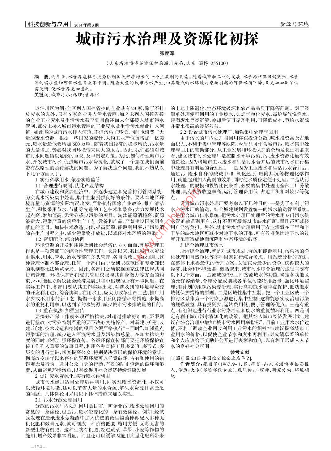 科技創(chuàng)新與應(yīng)用|2014年第3期資源與環(huán)境城市污水治理及資源化初探張麗軍(山東省淄博市環(huán)境保護局淄川分局,山東淄博25100)摘要:近年來,水資源危機已成為限制國民經(jīng)濟增長的一個主要制約因素。隨著城市和工業(yè)的發(fā)展,水資源狀況日趨緊張,水資源的需求量和可供水量日益不平衡。隨著大量的堿市污水產(chǎn)生,由其造成的水環(huán)境污染而引起的可供水質(zhì)下降,又更加加劇了供需失衡,使水資源更加匱乏關(guān)鍵詞:城市污水;治理;資源化以淄川區(qū)為例:全區(qū)列入國控省控的企業(yè)共有23家,除了不排的土地土質(zhì)退化、生態(tài)環(huán)境破壞和農(nóng)產(chǎn)品品質(zhì)下降等問題。對于經(jīng)放廢水的以外,只有5家企業(yè)進入污水管網(wǎng);加之未列入國控省控簡單處理便可回用的工業(yè)廢水,如煙氣凈化廢水、高爐煤氣洗滌水、的企業(yè)工業(yè)廢水及生活污水截至到日目前還尚未全部接人城市污水建陶廢水等經(jīng)沉淀、冷卻后便可循環(huán)利用,可降低成本,節(jié)約水資源管網(wǎng),部分未接人城市污水管網(wǎng)的工業(yè)廢水及生活污水就此排人河并帶來很高的經(jīng)濟效益。道。如此多的城市污水排入河道,不但污染了環(huán)境,同時也浪費了大22設(shè)置城市污水處理廠,加強集中處理與回用量的廢水資源。根據(jù)一些國家的統(tǒng)計,大約工業(yè)產(chǎn)值每增加一億美由于污水的廠內(nèi)處理與回用存在投資分散、噸水投資高及占地元,廢水量最低要增加600萬噸。隨著我國經(jīng)濟的穩(wěn)步增長,污水量面積大、不利于集中管理等缺陷,今后只可作為城市污、廢水集中處的大量增加,勢必對我國環(huán)境帶來巨大的壓力。因此,我們必須對城理與回用的輔助部分。從工業(yè)發(fā)展和環(huán)境保護的全局及長遠利益來市污水冋題給以足夠的重視,及早制定對策。為此,如何治理城市污看,建立城市污水處理廠是控制水環(huán)境污染,污、廢水資源化最有效水,開發(fā)城市污水,促進城市污水資源化,就成了一個擺在我們面前的途徑。因為將城市工業(yè)廢水和生活污水合并后的城市污水進行集帶有戰(zhàn)略性的亟待解決的問題。為了解決這個問題,我們不妨從以中處理具有明顯的合理性。一是因為工業(yè)廢水和生活污水合并后下幾個方面入手通過污、廢水自身的酸堿中和、氧化還原、吸附共沉等物理化學作1實行科學用水,依法實施監(jiān)管用,就能起到加入藥劑的效果,同時使水質(zhì)穩(wěn)定便于處理。二是從污1.1合理進行規(guī)劃,優(yōu)化產(chǎn)業(yè)結(jié)構(gòu)水處理廠的規(guī)模和投資比例來看,必要的集中處理比全部工廠分散在城市建設(shè)和發(fā)展經(jīng)濟中,要逐步建立和完善排污管網(wǎng)系統(tǒng),處理,具有投資收益率髙,運行管理費用低,占地面積相對較少等優(yōu)為實現(xiàn)水污染集中處理、集中控制提供良好的條件。要從本地區(qū)環(huán)點境容量與資源的實際情況岀發(fā),嚴格執(zhí)行國家產(chǎn)業(yè)政策,推廣清潔設(shè)置城市污水處理廠要考慮以下幾種目的:一是為了有利于污起點高,附加值高,無污染或少污染的項目。淘汰能源消耗髙,資源二是配合城市供水系統(tǒng),把污水處理廠處理后的污水用專門污水供浪費大,污染嚴重的落后生產(chǎn)工藝、設(shè)備和產(chǎn)品,嚴禁建設(shè)國家明令水管道輸送到用戶,這樣不但可緩解城市缺水問題,而且還可減輕禁止的項目。加快技術(shù)改造步伐,提高資源、能源利用率,把污染消用戶經(jīng)濟負擔。另外,城市污水經(jīng)處理后用于農(nóng)業(yè)灌溉在干旱和半除在生產(chǎn)過程之中,減少污染物排放量,以減輕對水環(huán)境的污染。干旱的缺水地區(qū)可減少對地下水的開采,可有效避免因地下水的過1.2密切配合,綜合協(xié)調(diào)度開采而造成地面沉降和生態(tài)環(huán)境的破壞環(huán)境資源的開發(fā)利用涉及到社會經(jīng)濟的方方面面,環(huán)境管理工3綜合治理城市污水作也是一項跨部門的綜合性管理工作。長期以來,我國城市水資源所謂綜合治理,就是對城市規(guī)劃、資源和能源利用、污染物的凈由供水、用水、管水、治水等部門多頭管理、各自為政。實踐證明,這化處理和自然凈化等多種因素進行綜合考慮,用系統(tǒng)分析的方法,種管理體制不夠合理,仼何一個部門由于受到職權(quán)范圍和專業(yè)知識在整體上求得最優(yōu)的治理方案,以便花費最少的資金,獲得較大的限制都無法通覽全局。因此,各部門必須依據(jù)國家法律法規(guī)共同經(jīng)濟、社會和環(huán)境效益。概括起來,城市污水綜合治理的途徑主要有協(xié)調(diào)管理。環(huán)境保護部門受其管理權(quán)限與其自身能力等方面的約以下幾個方面:一是流域的治理。即按流域水體功能,確定各功能區(qū)東,不可能獨立解決社會經(jīng)濟發(fā)展過程中出現(xiàn)的所有環(huán)境問題。在的允許容納量,合理分配或削減各單位污染物排放量,強化環(huán)境監(jiān)實際工作中,各部門要從其工作實際岀發(fā),對涉及到的環(huán)境與資源理;有計劃的組織污染源治理,實行髙功能水域重點保護,低功能水發(fā)利用進行綜合協(xié)調(diào)。在用水上,應(yīng)大力改革生產(chǎn)
