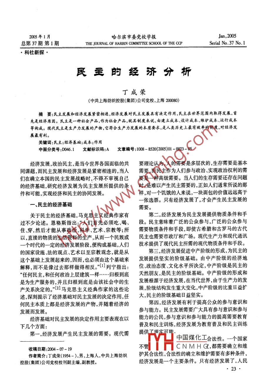 2005年1月哈爾濱市委黨校學(xué)報Jan,2005總第37期第1期THE JOURNAL OF HARBIN COMITTEE SCHOOL OF THE CCPSerial No.37 No.1, 科社新探●民主的經(jīng)濟分析丁成榮(中共上海紡織控股(集團)公司黨校,上海200080)摘要:民主發(fā)展和經(jīng)濟發(fā)展緊密相連,經(jīng)濟發(fā)展對民主發(fā)展具有決定作用,民主在世界范圍內(nèi)取得發(fā)展,首先是經(jīng)濟原因。民主是一種社會產(chǎn)品,作為社會產(chǎn)品,就其制度來說,由建立成本、設(shè)計成本、維護成本、運行成本等構(gòu)成。現(xiàn)代民主是生產(chǎn)力發(fā)展的產(chǎn)物,它符合生產(chǎn)力發(fā)展的本質(zhì)要求,是人類歷史上最有效率的制度,對經(jīng)濟發(fā)展最有利。關(guān)鍵詞:民主;經(jīng)濟基礎(chǔ);成本;作用中圖分類號:D046.1文獻標(biāo)識碼:A文章編號:1008 - 8520(2005)01 -0023-05經(jīng)濟發(fā)展,政治民主,是當(dāng)今世界各國面臨的共要理論認為,人的需要是多層次的,生存需要是基本同課題,而民主發(fā)展和經(jīng)濟發(fā)展是緊密相連的,當(dāng)人需要,而民主作為人們參與政治、實現(xiàn)政治權(quán)利的需們在確立本國的民主發(fā)展戰(zhàn)略時,不得不審視自己要是一種高級需要。當(dāng)人們的生存需要還存在問題的經(jīng)濟基礎(chǔ),研究經(jīng)濟發(fā)展為民主發(fā)展所提供的條時,是難以產(chǎn)生民主需要的,正如人們通常所說的那件和可能,實現(xiàn)經(jīng)濟和民主的協(xié)同發(fā)展。樣,對一個饑餓的人來說, - -塊面包的價值遠遠高于-張選票。只有經(jīng)濟發(fā)展了,才會產(chǎn)生民主發(fā)展的一、民主的經(jīng)濟基礎(chǔ)需要。關(guān)于民主的經(jīng)濟基礎(chǔ),馬克思主義經(jīng)典作家有第二,經(jīng)濟發(fā)展為民主發(fā)展提供物質(zhì)條件和手過不少論述。恩格斯指出:“人們首先必須吃、喝、段。民主意味著廣泛的公眾參與,廣泛的公眾參與住穿,然后才能從事政治科學(xué)、藝術(shù)、宗教等;所需要物質(zhì)條件和手段,即使古希臘和古羅馬的古代以,直接的物質(zhì)的生活資料的生產(chǎn),從而一一個民族或民主也需要市政廳和廣場?,F(xiàn)代生產(chǎn)力和現(xiàn)代通訊一個時代的一定的經(jīng)濟發(fā)展階段,便構(gòu)成基礎(chǔ),人們技術(shù)提供了現(xiàn)代民主所需的現(xiàn)代物質(zhì)條件和手段。的國家設(shè)施、法的觀點、藝術(shù)以至宗教觀念,就是從第三,經(jīng)濟發(fā)展促進中產(chǎn)階級的形成,為民主的這個基礎(chǔ)上發(fā)展起來的,因而,也必須由這個基礎(chǔ)來發(fā)展提供堅實的階級基礎(chǔ)。由中產(chǎn)階級的經(jīng)濟地解釋,而不是像過去那樣做得相反?!盵]列寧指出:位政治態(tài)度、文化水平所決定,中產(chǎn)階級是民主的“任何民主,和任何政治上層建筑- -...歸根到底天然朋友,是民主的階級基礎(chǔ)。中產(chǎn)階級的形成和是為生產(chǎn)服務(wù)的,并且歸根到底是由該社會中的生發(fā)展根源于經(jīng)濟發(fā)展,在當(dāng)代世界,由于生產(chǎn)力的發(fā)產(chǎn)關(guān)系決定的?!盵2]馬克思主義經(jīng)典作家的這些論展,階級結(jié)構(gòu)發(fā)生重大變化,中產(chǎn)階級的比重日益擴述,深刻提示了經(jīng)濟基礎(chǔ)對民主發(fā)展的決定作用,任大,民主的階級基礎(chǔ)日益堅實。何民主本質(zhì)上都是經(jīng)濟發(fā)展的產(chǎn)物,并隨著經(jīng)濟的第四,經(jīng)濟發(fā)展有利于提高公眾的參與意識和發(fā)展而發(fā)展。參與能力。民主發(fā)展需要廣“大具有參與意識和參與經(jīng)濟基礎(chǔ)對民主發(fā)展的決定作用主要表現(xiàn)在以能力的公民,參與意識和參與能力的提高需要教育普及和民主訓(xùn)練,經(jīng)濟發(fā)展為教育普及和民主訓(xùn)練下幾個方面:第一,經(jīng)濟發(fā)展產(chǎn)生民主發(fā)展的需要。現(xiàn)代需提供了現(xiàn)實可能。中國煤化工合法性。一個國家不管|Y片CNMHG,都需要確立和維收稿日期:2004-07- 19作者簡介:丁成榮(1954-),男,上海人,中共上海紡織護其合法性,合法性的確立和維護需要有多種條件,控股(集團)公司黨校??敝骶幐苯淌凇=?jīng)濟發(fā)展是-一個主要條件。只有經(jīng)濟發(fā)展了,人民23●群眾才會支持民主制度,這一制度才能鞏固和發(fā)展。制度作為己任,領(lǐng)導(dǎo)人民不懈努力,建立了社會主義當(dāng)今世界,民主化是潮流,民主在世界范圍內(nèi)取民主制度。但是,由于生產(chǎn)力的落后,再加上其他原得發(fā)展,究其原因,首先是經(jīng)濟原因。誠如安東尼●因,中國社會主義民主發(fā)展經(jīng)歷了艱難曲折的過程,吉登斯所說,“全球化的深化,即使是在較少民主傳只是在十一屆三中全會以后,我們緊緊以經(jīng)濟建設(shè)統(tǒng)的國家也積極推進了民主。在很大程度上,全球為中心,不斷促進生產(chǎn)力的發(fā)展,夯實民主發(fā)展的經(jīng)化是由新的通訊系統(tǒng)推動的。新的通訊系統(tǒng)同人們濟基礎(chǔ),社會主義民主才取得了新的發(fā)展。日常生活中的變化-道改變了公民同國家之間的關(guān)二、民主的經(jīng)濟成本系,現(xiàn)在獨裁的政治權(quán)力不僅比過去更加難以維持,而且更易突破和消解?!盵3]當(dāng)然,就一國的民主發(fā)展在- -定意義上說,民主是- -種社會產(chǎn)品,和人類來說,主要是本國