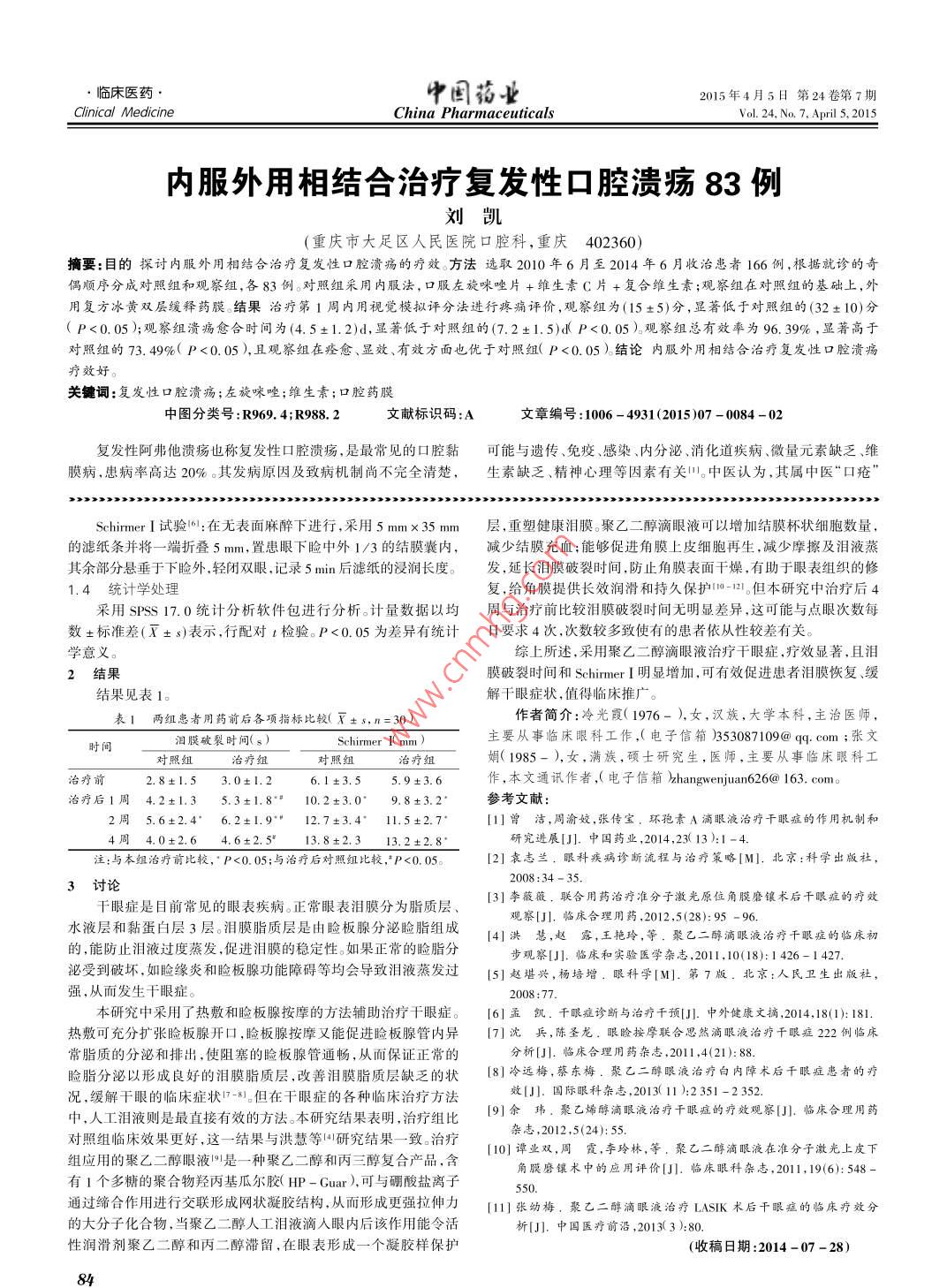 2卷第7期2015年4月5日第24卷第7其中國藥業(yè)·臨床醫(yī)藥 Vol. 24, No. 7, April 5,2015 China Pharmaceuticals Clinical Medicine聚乙二醇滴眼液治療干眼癥30例冷光霞,張文娟(河北省秦皇島市第二醫(yī)院眼科,河北秦皇島066600)摘要:目的探討聚乙二醇滴眼液治療干眼癥的臨床療效。方法選擇2011年10月至2013年4月收治的干眼癥患者60例(120只眼),隨機分成對照組30例(60只眼),治療組30例(60只眼)對照組給予熱敷、板腺按摩及玻璃酸鈉滴眼液,4次/日,治療組同時聯(lián)合聚乙二醇滴眼液,4次/日。結(jié)果治療后1,2,周較治療前淚膜破裂時間及淚液分泌試驗(Schirmer)均明顯增加(P<0.05);治療組和對照組比較,淚膜破裂時間顯延長,比較差異有統(tǒng)計學(xué)意(P0.05)治療組較對照紐明顯增加,但無顯著差異(P>0.05)結(jié)論聚乙二醇滴眼液治療干眼癥療效顯著,可有效促進患者淚膜恢復(fù)、緩解千眼癥狀,保持淚膜的穩(wěn)定性。關(guān)鍵詞:千眼癥;聚乙二醇滴眼液;淚膜破裂時間;淚液分泌試驗中圖分類號:R969.4R988.1文獻標(biāo)識碼:A文章編號:106-4931(201507-0083-0 Clinical Experience of Polyethylene Glycol Eye Drops in Treating 30 Cases of Dry Eye Syndrome Leng Guangxia, Zhang Wenjuan (Department of Ophthalmology, Qinhuangdao Municipal Second Hospital, Qinhuangdno, Hebei, China 066600) Abstract: Objective To investigate the effect of Polyethylene Glycol Eye Drops for treating dry eye syndrome. Methods 60 patients (120 eyes)with dry eye syndrome in our hospital from October 2011 to April 2013 were selected and randomized into the control group(30 cases, 60 eyes) and the treatment group30 cases, 60 eyes). The control group was given the hot compress, meibomian gland massage and Sodium Hyaluronate Eye Drops 4 times per day: the treatment group also was given the hot compress and meibomian gland massage, at the same time combined with Polyethylene Glycol Eye Drops 4 times per day. Then, the clinical effects before treat- ment and at 1, 2, 4 weeks after treatment were observed. The tear break-up time (BUT) and Schirmer I test situation after treatment were compared between the two groups. Results BUT and Schirmer I test at 1, 2. 4 weeks after treatment in the two groups were sig nificantly increased compared with before treatment the differences were statistically significant( 0.05: BUT in the treatment group was significantly prolonged compared with the control group, the difference was stically significant (P 0.05), the Schirmer I test was significantly increased compared with the control group, but no statistically significant differences was found(P >0.05). Conclusion Olyethylene Glycol Eye drops has obvious curative effect for treating dry eye syndrome, can effectively promote the recovery of tear film, to alleviate the symptoms of dry eye and keep the tear film stable Key words: dry eyes syndrome; polyethylene glycol eye drops; tear film break-up time; Schirmer I test人們經(jīng)常使用電腦、手機、空調(diào),年輕人佩戴隱形眼鏡等,導(dǎo)1.2方法致干眼癥的發(fā)病率越來越高。干眼癥主要表現(xiàn)為眼部干澀感、兩組均給予局部熱敷,每日3次,并結(jié)合臉板腺按摩術(shù),每周異物感、灼燒感及眼紅痛、畏光、視疲勞、視力下降,以及對風(fēng)、熱、2次治療。臉板腺按摩術(shù):在患者結(jié)膜囊內(nèi)滴入表面麻醉劑1滴濕度低或長時間用眼敏感等,輕者會影響正常工作和生活,嚴(yán)重以減少按摩時的不適,3~5min后,取無菌棉簽在已消毒過的者可導(dǎo)致眼表組織干燥、融解、穿孔等嚴(yán)重的視功能損害21目HOZE板涂抹紅霉素眼膏潤滑,然后翻開患者眼瞼,將HOZE板前,干眼癥尚無特效治療方法,臨床多采用皮質(zhì)固醇類或非甾體涂有紅霉素眼膏的一端輕輕插入患者眼瞼內(nèi),用HOZE板撐起眼類滴眼液進行治療3筆者觀察了聚乙醇滴眼液治療干癥的瞼,另取1根無菌棉簽,自瞼緣遠端向瞼緣瞼板腺開口處的方向療效,現(xiàn)報道如下。按摩瞼板腺,按摩力度以能擠壓出黃白色分泌物為宜,直至瞼板1資料與方法腺分泌物擠壓干凈,按摩結(jié)束后,滴入抗生素眼水1滴。熱敷法:1.1一般資料毛巾浸入溫開水中浸泡后擰干,患者仰臥、閉眼,將毛巾置于雙眼選擇2011年10月至2013年4月在醫(yī)院眼科就診的干眼癥上方15min,每日3次對照組加用0.1%玻璃酸鈉滴眼液(商品患者60例(120只眼),其中男20例(40只眼),40例(80只名愛麗,珠海聯(lián)邦制藥股份有限公司中山分公司,國藥準(zhǔn)字眼);年齡35~55歲,平均(45.52±3.75)歲入標(biāo)準(zhǔn)1:均進行H20040352,成分為透明質(zhì)酸鈉滴眼,4次/日;治療組加用聚乙常規(guī)檢查,包括裂隙燈、眼壓、B超,角膜熒光素染色呈陽性;淚膜二醇滴眼液(商品名思然, Alcon Laboratories Inc進口藥品注冊證破裂時間小于10s;淚液分泌試驗 Schirmer試驗)小于10mm號20070規(guī)格為5聚乙等;有眼部干澀異物感、眼疲勞、眼紅及灼燒感等臨床癥狀。排除眼,4次/日。觀察兩組治療前及治療后1,2,4周淚膜破裂時間及標(biāo)準(zhǔn):合并全身其他疾病,如糖尿病、免疫系統(tǒng)疾病等;施行過眼 Schirmer的變化。部手術(shù);合并結(jié)膜炎、角膜病變、青光眼等眼部疾病;鼻淚道阻塞;1.3觀察指標(biāo)正在應(yīng)用其他眼部藥物或?qū)λ幬镉羞^敏史將所有患者隨機分成淚膜破裂時間檢查5:在結(jié)膜囊內(nèi)滴入熒光素鈉溶液,囑受對照組和治療組,對照組30例(60只眼),其中男11例,女19檢者瞬目數(shù)次后平視前方,測量者在裂隙燈的鈷藍光下用寬裂隙例;治療組30例(60只眼),其中男9例,女2例。兩組患者的一光帶