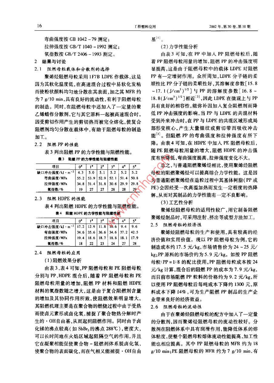 周健,等:聚始烴阻燃母粒的制造及應(yīng)用試驗(yàn)15聚烯烴阻燃母粒的制造及應(yīng)用試驗(yàn)周健李(常州技術(shù)師范學(xué)院應(yīng)用化學(xué)系,常州213001)Q32 A摘要采用復(fù)合阻燃劑與 聚烯烴通過(guò)擠出造粒法制得聚烯烴(聚丙烯、聚乙烯)阻燃母粒,考察了聚烯烴阻燃母粒用量對(duì)阻燃聚丙烯、阻燃聚乙烯力學(xué)性能、流動(dòng)性、阻燃性的影響。實(shí)驗(yàn)結(jié)果表明,聚烯烴阻燃母粒在生產(chǎn)阻燃聚烯烴制品中具有使用便利、阻燃效果和經(jīng)濟(jì)效益好等特點(diǎn)。關(guān)鍵詞阻燃母粒力學(xué)性能流動(dòng)性阻燃性隨著國(guó)家經(jīng)濟(jì)建設(shè)的不斷發(fā)展,阻燃聚烯烴塑55% ~65%的復(fù)合阻燃劑十溴聯(lián)苯醚- Sb2O3和料的用途日益廣泛。如阻燃聚丙烯( PP)、阻燃聚乙5% ~ 10%的分散劑聚乙烯蠟按- 定次序倒入高速烯( PE)常被用來(lái)生產(chǎn)要求阻燃性能的各種管道、板捏合機(jī)中進(jìn)行高速混合約20min,通過(guò)高速捏合機(jī)材、通訊電纜、電器零件裝飾材料等。聚烯烴阻燃產(chǎn)生的摩擦熱使LDPE發(fā)粘、分散劑融化.使復(fù)合阻母粒具有使用方便、對(duì)阻燃塑料制品的力學(xué)性能影燃劑均勻地粘附在載體上,在約100C下出料。然響小、經(jīng)濟(jì)實(shí)惠等特性。因此筆者研制了聚烯烴阻后將物料與PP(或PE)裝人065擠出造粒機(jī)組,在燃母粒并對(duì)其進(jìn)行了應(yīng)用研究。表1的工藝條件下擠出造粒,擠出料條經(jīng)水槽冷卻、1實(shí)驗(yàn)部分空氣冷卻,引人切粒機(jī)切粒、包裝.分別制得PP阻1.1 基本原料燃母粒和PE阻燃母粒。PP:5014,市售;表|阻燃母粒擠出造粒工藝條件高密度聚乙烯( HDPE) :5000S,揚(yáng)子石化公司;項(xiàng)目數(shù)據(jù)低密度聚乙烯( LDPE):1F7B,北京燕山石化公機(jī)簡(jiǎn)溫度/C 1區(qū)60-80螺桿轉(zhuǎn)速/r● min-' 500 -750I區(qū)125 -135主機(jī)電流/A25-30司;皿區(qū)135 ~ 145|切粒機(jī)轉(zhuǎn)速/r●min-'I 100 ~1400十溴聯(lián)苯醚;江陰利港化工廠;機(jī)頭溫度/C 130Sb2O,:市售;(2)試樣制備引發(fā)劑:市售;將PP阻燃母粒與PP按表2中阻燃PP各配方聚乙烯蠟:市售;的比例混合,用注塑機(jī)在加料段80~100C、壓縮段光亮劑:TS -2A,吳縣國(guó)光化學(xué)助劑有限公司。160~ 180C、均化段180 ~ 200C、噴嘴180C、注塑1.2 主要設(shè)備壓力6~7 MPa下注塑成不同配比的PP標(biāo)準(zhǔn)試樣。065擠出造粒機(jī)組:上海擠出機(jī)廠;阻燃HDPE試樣也按表2中阻燃HDPE各配方高速捏合機(jī):10 L,阜新塑料機(jī)械廠;制備,T藝過(guò)程與阻燃PP試樣相同。注塑機(jī):XS -ZY - 125型,杭州塑料機(jī)械廠;t2 阻燃PP與阻燃HDPE試樣配方簡(jiǎn)支梁沖擊試驗(yàn)機(jī):UJ-40型,承德市試驗(yàn)機(jī)PP阻燃母粒試樣PE阻燃母粒/PP質(zhì)量比廠:純PP0純HIDPE電子式萬(wàn)能試驗(yàn)機(jī):WD-1型,吉林長(zhǎng)春第二1:91:8材料試驗(yàn)機(jī)廠;:71:熔體流動(dòng)速率(MFR)測(cè)定儀:XR -400型,吉.:6林大學(xué)科教儀器廠;1:5氧指數(shù)測(cè)定儀:HC -2型,江寧縣分析儀器廠。1.4 性能測(cè)試1.3阻燃聚烯烴母 粒及試樣的制備缺口沖擊強(qiáng)度按GB/T 1043 - 1993測(cè)定;(1)阻燃聚烯烴母粒的制造按配方將20%~30%的LDPE(作載體)與收稿日期:2002-07-3016I程塑料應(yīng)用2002年,第30卷.第10期彎曲強(qiáng)度按CB 1042 -79測(cè)定;基"。拉伸強(qiáng)度按GB/T 1040 - 1992測(cè)定;(2)力學(xué)性能分析氧指數(shù)按CB/T 2406 - 1993測(cè)定。由表3可知,在PP中加人PP阻燃母粒后,隨;2結(jié)果與討論著PP阻燃母粒用量的增加,阻燃PP的沖擊強(qiáng)度明2.1阻燃母粒載體和分散 劑的選擇顯提高,這是由于阻燃母粒中的載體LDPE對(duì)阻燃聚烯烴阻燃母粒采用1F7B LDPE作載體,這是.PP有一定增韌作用。眾所周知,LDPE分子鏈的柔因?yàn)槠滠浕瘻囟鹊?在高速混合過(guò)程中易軟化發(fā)粘順性比PP分子鏈的柔順性好,其溶解度參數(shù)[15.8而使粉狀顏料均勻地分散在其表面,加之其MFR約~17.1(J/cm)"2]與PP的溶解度參數(shù)[16.8 ~為7g/10min,具有良好的流動(dòng)性,有利于阻燃母粒18.8(J/cm' )"2]相近2,因此LDPE在微觀上與PP的制造。同時(shí),在阻燃母粒中還加入了一定量的聚具有良好的相容性,能彌補(bǔ)因加入復(fù)合阻燃劑而降乙烯蠟作分散劑,它與其它原料一起被高速混合時(shí),低PP沖擊強(qiáng)度的影響,當(dāng)PP與LDPE的共混材料因受剪切作用產(chǎn)生的剪切熱而被完全熔化使復(fù)合受到外來(lái)沖擊時(shí)在PP與LDPE的共混區(qū)域形成局阻燃劑均勻分散在載體中,有助于阻燃母粒的制造部形變核心,產(chǎn)生大量銀紋或剪切帶而吸收沖擊加T。能[”]。但阻燃PP的彎曲強(qiáng)度和拉伸強(qiáng)度有所下2.2阻燃PP的性能降。由表4可知,在HDPE中加入PE阻燃母粒后,表3列出阻燃PP的力學(xué)性能與阻燃性能。隨PE阻燃母粒用量的增大,阻燃HDPE的沖擊強(qiáng)褒3阻繼PP的力學(xué)性能與阻燃性能度有所降低,彎曲強(qiáng)度提高,拉伸強(qiáng)度變化不大。項(xiàng)目I 0" 122345總之,與普通阻燃聚烯烴相比,使用聚烯烴阻燃缺口沖擊強(qiáng)度/J.m-2 4.35.0 I 5.1 5.2 5.2 5.2母粒的阻燃聚烯烴可以提高綜合力學(xué)性能。這是因彎曲強(qiáng)度/MPa55.253.952.952.151.4 50.拉伸強(qiáng)度/MPa34.831.4|31.830.629.929.8為普通阻燃聚烯烴在造粒過(guò)程中其基體樹(shù)脂(PP或氧指數(shù)/%19| 2727282