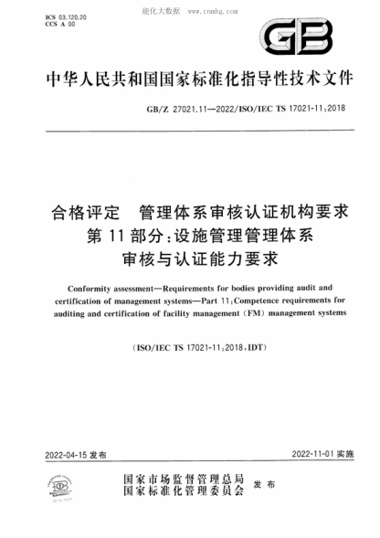 GB/Z 27021.11-2022合格評(píng)定 管理體系審核認(rèn)證機(jī)構(gòu)要求 第11部分:設(shè)施管理管理體系審核及認(rèn)證能力要求Conformity assessment-Requirements for bodies providing audit and certification of management systems-Part 1 1 :Competence requirements for auditing and certification of facility management (FM) m