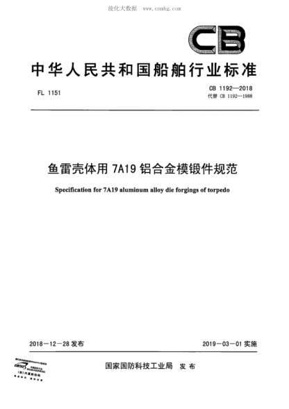 CB 1192-2018 魚雷殼體用7A19鋁合金模鍛件規(guī)范 Specification for 7A19 aluminum alloy die forgings of torpedo