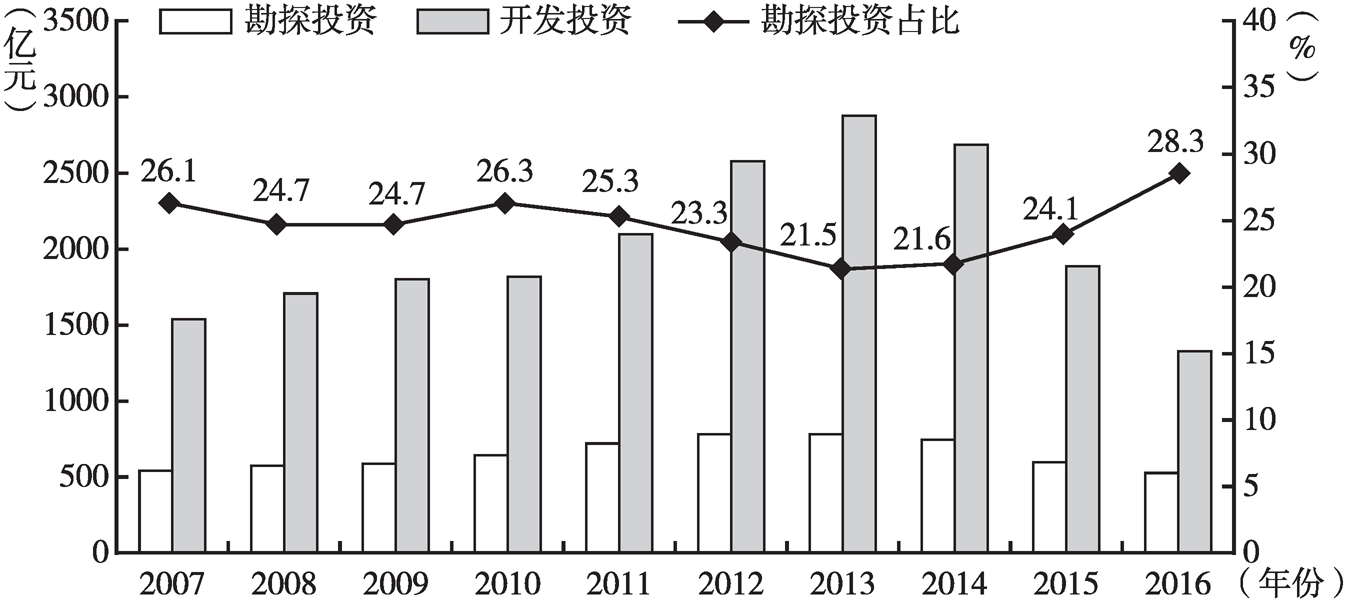 統(tǒng)計顯示,2007~2013年,布倫特原油價格由2007年的72.39美元/桶上升至2013年的108.66美元/桶的高位。在高油價下,我國油氣上游勘探投資由2007年的541.9億元增長到2013年的786.1億元,年均增長6.4%。2014年以來,國際油價開始大幅下跌,至2016年2月,布倫特一度跌至35.1美元/桶,跌幅達65%。油價暴跌導致全國油氣勘探投資大幅減少,2015年全國油氣勘探投資600.1億元,同比下降19.2%。