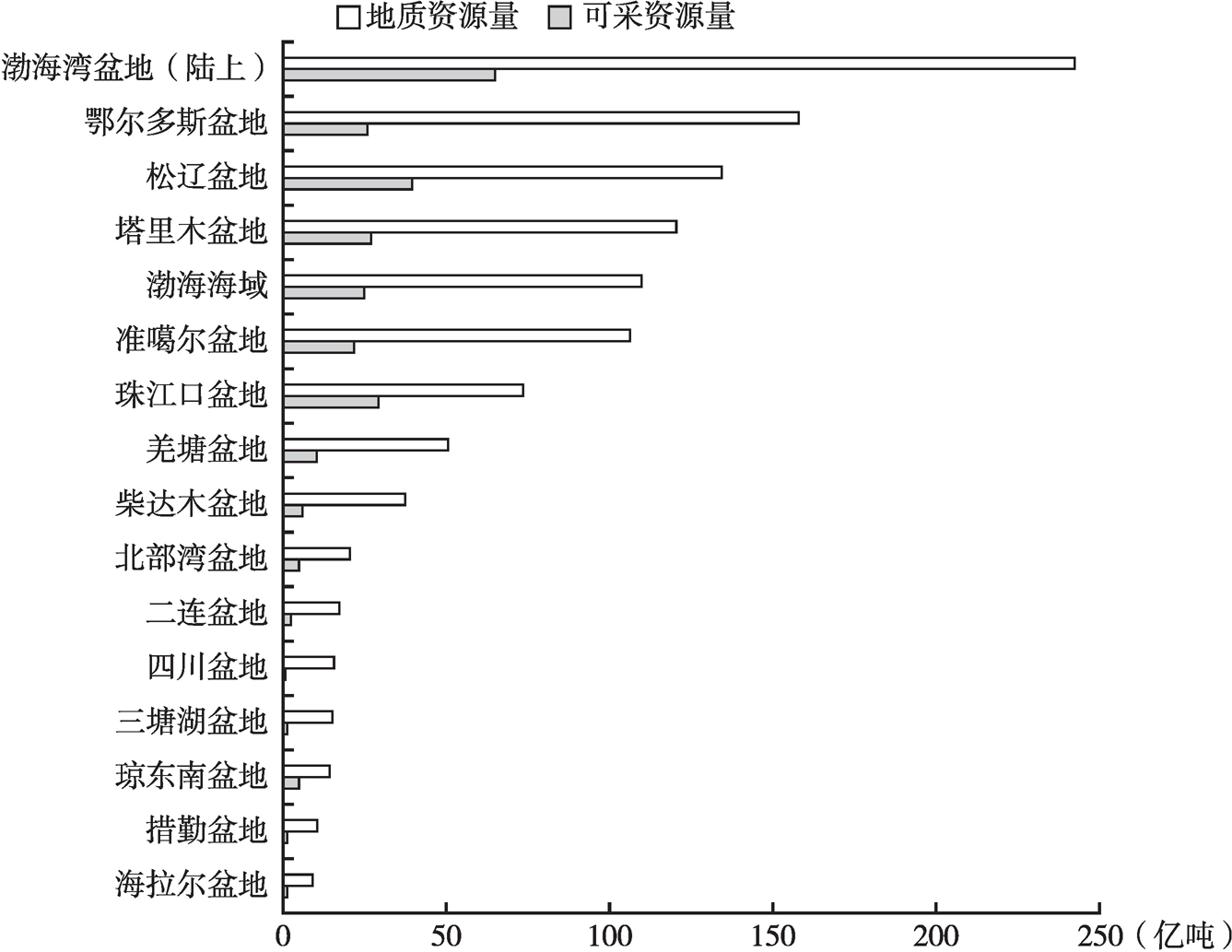 圖3 全國主要盆地石油地質(zhì)資源量與可采資源量