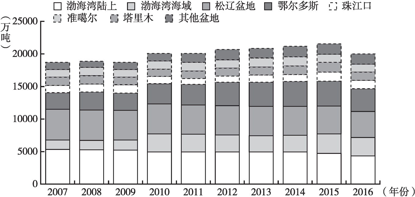 圖9 2007~2016年我國主要盆地石油產(chǎn)量分布