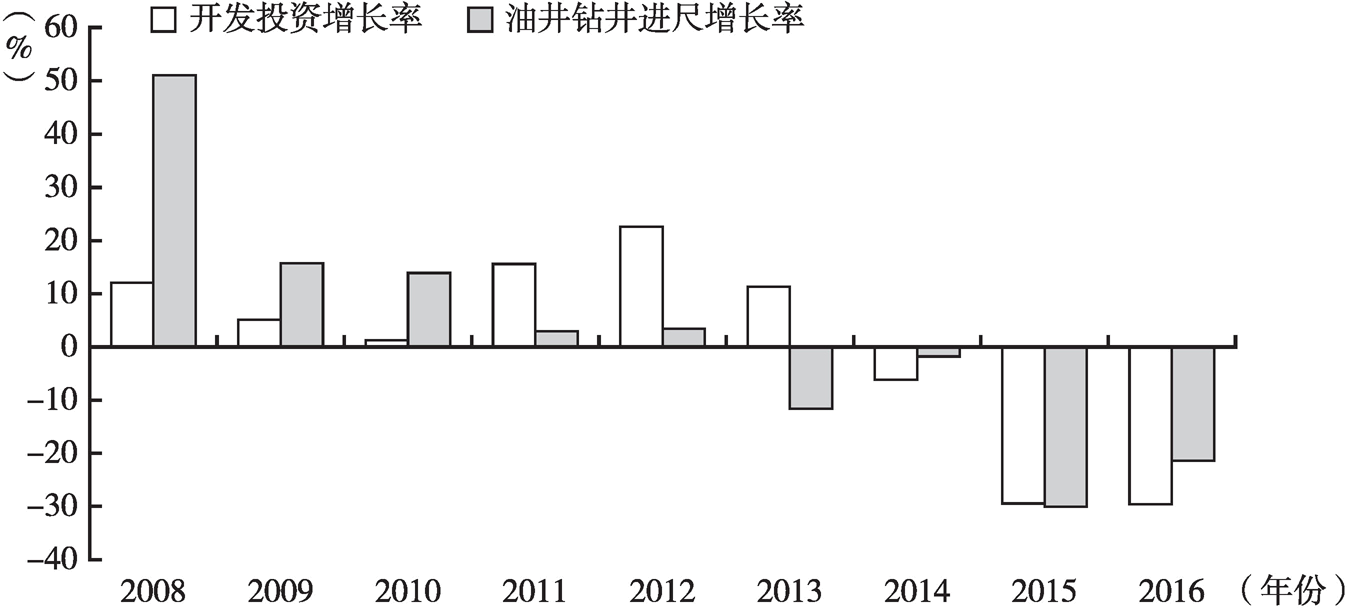 2014年以來,隨著國際油價暴跌,主要石油企業(yè)面臨巨大的經(jīng)營壓力,主動關閉低效益井,大幅削減開發(fā)投入,與2013年投入高峰相比,2016年全國油氣開發(fā)投資為1333億元,下降了53.6%,是2007年以來投資最低值。投資下降導致工作量顯著下降,2016年全國完鉆開發(fā)井較上年下降23.5%,開發(fā)鉆井總進尺同比減少25.02%(見圖6)。