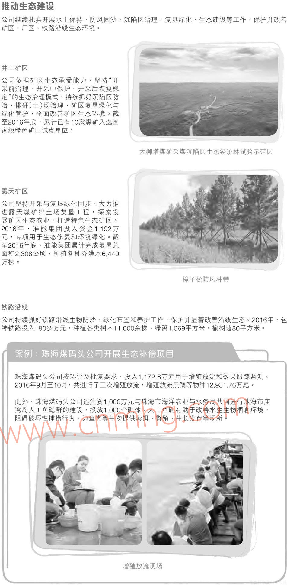 《中國神華能源股份有限公司2016社會責任報告》中,披露公司將生態(tài)系統(tǒng)保護工作融入具體的項目管理過程中,場景化開展防風固沙、沉陷區(qū)治理、復墾綠化等工作,采取具體措施降低項目開展對生態(tài)系統(tǒng)的影響,積極保護并改善礦區(qū)、廠區(qū)、鐵路沿線生態(tài)環(huán)境。云南銅業(yè)(集團)有限公司將生物多樣性保護貫徹到項目全生命周期,在勘探階段即避開生物多樣性豐富區(qū)域,對于已確定的開發(fā)礦區(qū),通過建設期生態(tài)保護、運營期生態(tài)養(yǎng)護及閉礦后生態(tài)發(fā)展等多種舉措,保持礦區(qū)開發(fā)前和開發(fā)后的生物多樣性。