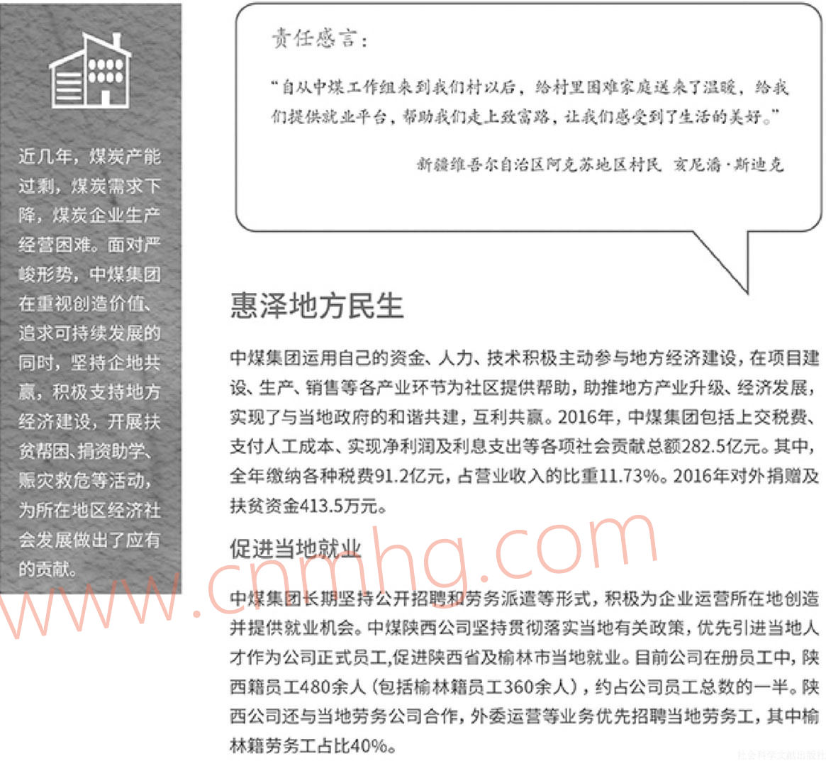 隨著國家“一帶一路”倡議的踐行和開展,越來越多的采掘業(yè)會沿著“絲綢之路”走出國門、走向世界。社會責任報告是企業(yè)與項目所在地各利益相關方溝通的重要有效載體,因此我們鼓勵有需求且有實力的采掘業(yè)使用國際化的“語言體系”發(fā)布企業(yè)社會責任報告,包括對標國際報告編制依據、發(fā)布國別報告、發(fā)布多語言版本報告等,向國際社會展示中國采掘業(yè)對社會責任的履責信息,促進國際社會對中國企業(yè)履行社會責任行動和績效的認知,樹立中國采掘業(yè)在海外負責任運營的形象。如《中國冶金科工股份有限公司2016社會責任報告》以中文簡體、中文繁體和英文三種文字書寫,并在報告中披露公司海外社會責任履責信息,有效提升了報告的“國家化”程度?!吨袊宓V集團公司2016可持續(xù)發(fā)展報告》回應了“聯合國可持續(xù)發(fā)展2030年可持續(xù)發(fā)展目標”,與國際規(guī)則接軌,提升企業(yè)報告國際影響力與溝通效力。
