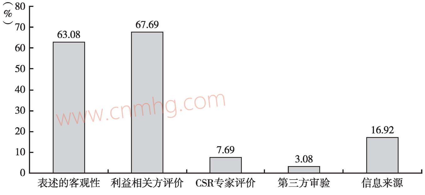 報告整體可信性較優(yōu),表述的客觀性和利益相關方評價的得分率達到63.08%和67.69%。但指標CSR專家評價(7.69%)、第三方審驗(3.08%)和信息來源(16.92%)的得分率較低,采掘業(yè)企業(yè)未來編制報告時要加強對這三個指標的信息披露。