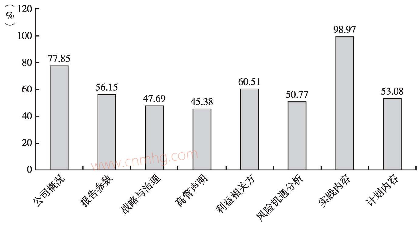 采掘業(yè)報告結構完整性整體優(yōu)于中國企業(yè)報告水平。得分率過半的指標有公司概況(77.85%)、報告參數(56.15%)、利益相關方(60.51%)、風險機遇分析(50.77%)、實踐內容(98.97%)和計劃內容(53.08%)。戰(zhàn)略與治理(47.69%)和高管聲明(45.38%)的得分率較低,說明采掘業(yè)報告對社會責任融入企業(yè)管理相關信息披露不夠。