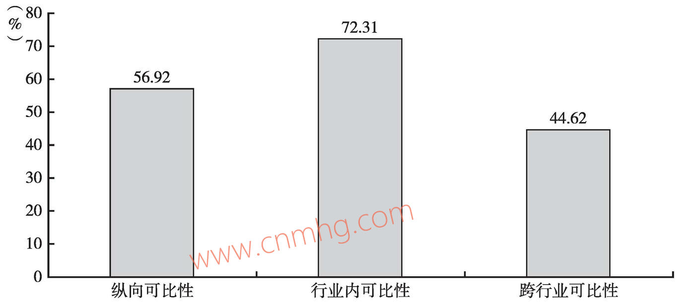 報告可比性顯著優(yōu)于中國企業(yè)報告水平。采掘業(yè)報告在編制時注重自身發(fā)展的縱向對比和參考行業(yè)或國家的標準,縱向可比性和行業(yè)內可比性指標得分率分別為56.92%和72.31%。但跨行業(yè)標準的對標工作稍顯不足,跨行業(yè)可比性得分率僅為44.62%,有待進一步提升。