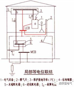 但是局部等電位聯(lián)結(jié)應(yīng)用更適合場(chǎng)所,例如,衛(wèi)生間、浴室、游泳池、甚至樓層。圖2和圖3分別是局部等電位聯(lián)結(jié)和輔助等電位聯(lián)結(jié)示意圖,圖中1——電氣設(shè)備,2——暖氣片,3——PE,4——結(jié)構(gòu)鋼筋,5——末端配電箱,6——進(jìn)線配電箱,Id——故障電流。