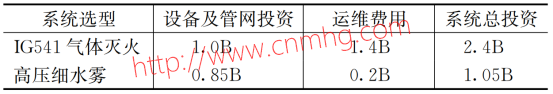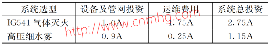 從造價(jià)估算對(duì)比表1和表2可以得出,無(wú)論是進(jìn)口還是國(guó)產(chǎn)設(shè)備,高壓細(xì)水霧系統(tǒng)在工程投資和運(yùn)維費(fèi)用上都低于對(duì)應(yīng)的IG541氣體滅火系統(tǒng),特別是由于高壓細(xì)水霧的滅火劑為水,沒(méi)有額外的滅火劑更換費(fèi)用,運(yùn)維費(fèi)用有很大的經(jīng)濟(jì)優(yōu)勢(shì)。進(jìn)口和國(guó)產(chǎn)高壓細(xì)水霧系統(tǒng)的總投資均是對(duì)應(yīng)IG541氣體滅火系統(tǒng)總投資的45%以下。