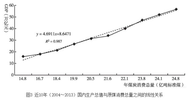 煤炭是我國經(jīng)濟發(fā)展和社會穩(wěn)定的重要支撐。我國經(jīng)濟高度依賴煤炭的特征顯著,經(jīng)濟增長與煤炭消費變化趨勢非常接近,具有較大的關(guān)聯(lián)特征。如圖3所示,近10年我國國內(nèi)生產(chǎn)總值(GDP)與煤炭消費總量呈現(xiàn)明顯的線性關(guān)系,相關(guān)系數(shù)高達0.987。煤炭工業(yè)規(guī)?;l(fā)展的同時,全產(chǎn)業(yè)鏈提供了大量的就業(yè)崗位。截至2013年年末,全國煤炭開采和洗選業(yè)共有企業(yè)法人單位1.9萬個,行業(yè)從業(yè)人員611.3萬人(國家統(tǒng)計局,2014)。因此,煤炭為我國社會經(jīng)濟發(fā)展做出了重要貢獻,煤炭的穩(wěn)定供應(yīng)在確保國民經(jīng)濟正常運轉(zhuǎn)、保障居民生活質(zhì)量、維系社會穩(wěn)定等方面作用顯著,在全國社會經(jīng)濟發(fā)展全局中具有重要的戰(zhàn)略地位。