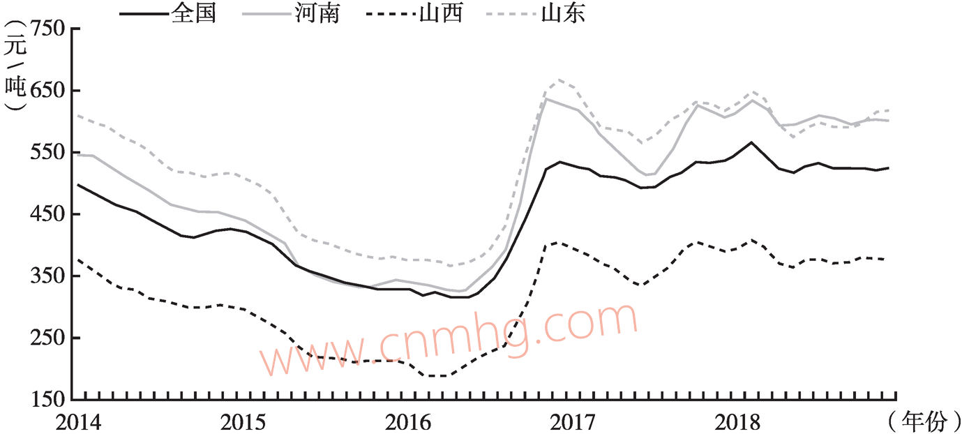 圖2 2014~2018年全國、河南及主要周邊省份電煤價格情況