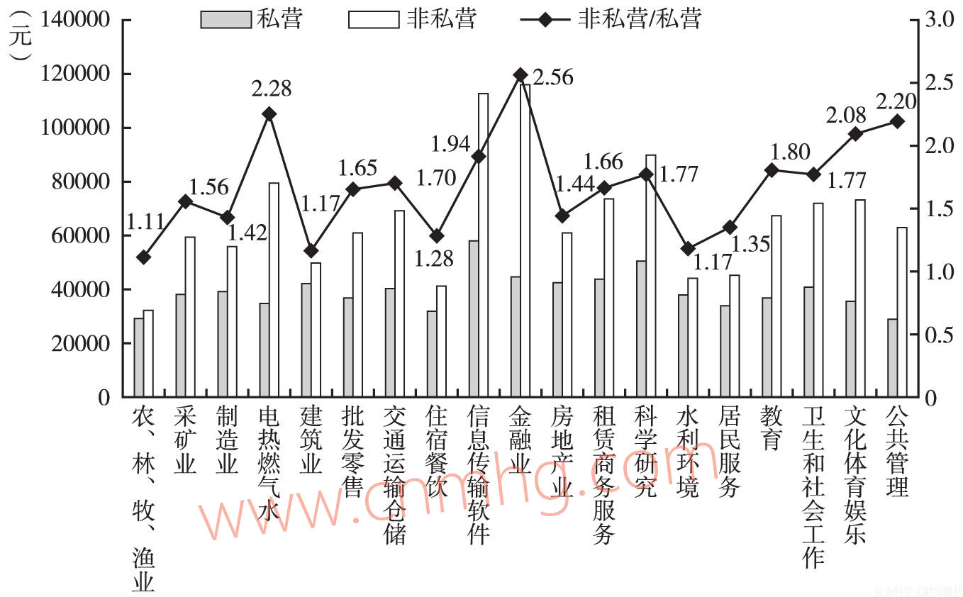 進(jìn)一步分析這兩類(lèi)單位在不同行業(yè)間的平均工資差異情況(見(jiàn)圖6-6),在19個(gè)行業(yè)門(mén)類(lèi)中,私營(yíng)單位就業(yè)人員平均工資普遍低于非私營(yíng)單位。相對(duì)差距較小的是農(nóng)、林、牧、漁業(yè),建筑業(yè),住宿餐飲業(yè),水利環(huán)境和公共設(shè)施管理業(yè)等,這些基本都屬于傳統(tǒng)勞動(dòng)密集型行業(yè);相對(duì)差距較大的則是金融業(yè),電力、熱力、燃?xì)饧八a(chǎn)和供應(yīng)業(yè),信息傳輸、軟件和信息技術(shù)服務(wù)業(yè),這些行業(yè)具有較強(qiáng)壟斷性或?qū)儆诩夹g(shù)密集型行業(yè)。特別值得注意的是,私營(yíng)單位工資水平在行業(yè)間的差距遠(yuǎn)遠(yuǎn)小于非私營(yíng)單位,由此可以看出,當(dāng)前城鎮(zhèn)就業(yè)人員行業(yè)間工資水平差異主要來(lái)自非私營(yíng)單位,僅僅以非私營(yíng)單位為對(duì)象進(jìn)行行業(yè)分析,可能夸大了行業(yè)間的工資差距。