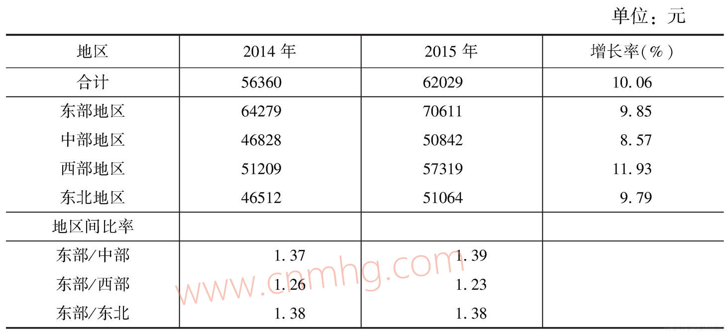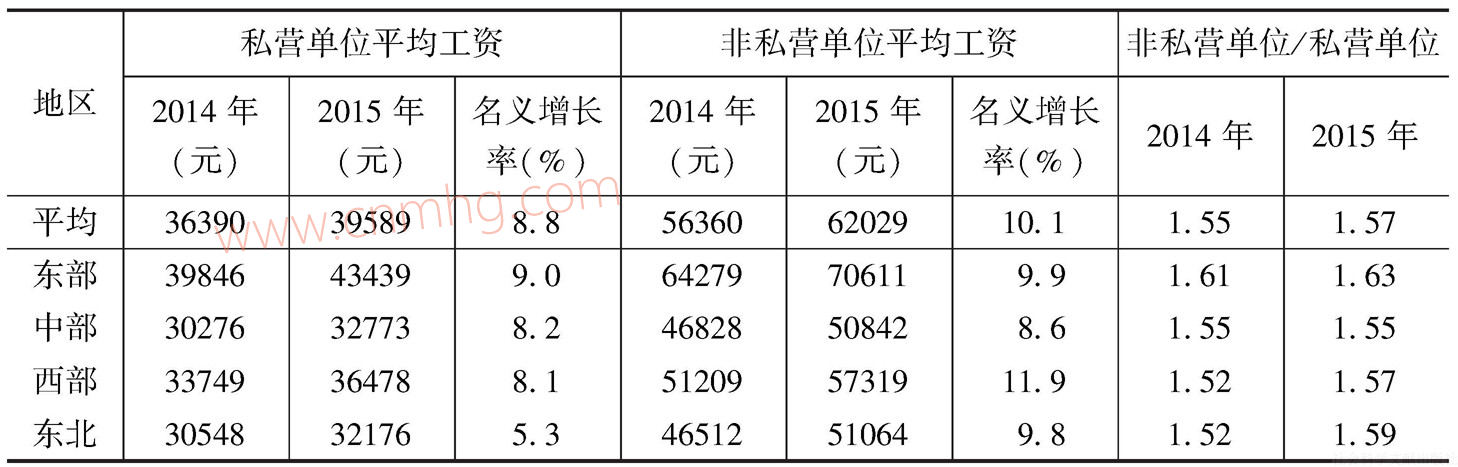 分地區(qū)考察這兩類(lèi)單位的平均工資,也可以得到相似的結(jié)論。一方面,無(wú)論在哪個(gè)區(qū)域,私營(yíng)單位與非私營(yíng)單位之間的工資水平差距都比較顯著;如果從近年動(dòng)態(tài)觀察,由于私營(yíng)單位工資水平增長(zhǎng)速度高于非私營(yíng)單位,二者之間的差距在不斷縮小,但由于工資政策的變化,2015年的相對(duì)差距要高于2014年。