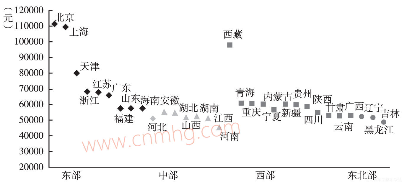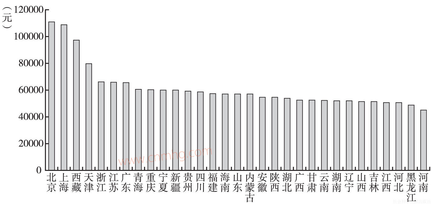 按工資水平對(duì)各個(gè)地區(qū)進(jìn)行排序(見(jiàn)圖6-3)可以發(fā)現(xiàn),2個(gè)地區(qū)處于45000~50000元的范圍內(nèi),11個(gè)地區(qū)位于50000元~55000元的范圍內(nèi),7個(gè)地區(qū)處于55000~60000元的范圍內(nèi),7個(gè)地區(qū)處于60000~70000元的范圍內(nèi)。特別值得關(guān)注的是西藏因?yàn)楣べY改革政策力度大,機(jī)關(guān)事業(yè)單位人員的工資大幅度上漲,平均工資水平上升到第三位,北京、上海這兩個(gè)直轄市已經(jīng)偏離相鄰的組,以高于10萬(wàn)元的水平遠(yuǎn)離其他地區(qū),這種分布狀態(tài)正是當(dāng)前工資水平地區(qū)差異的突出反映。