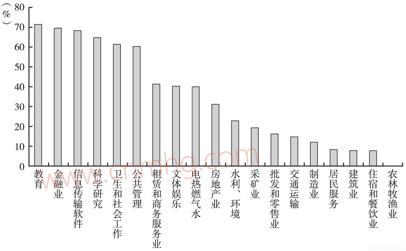 圖6-8 2014年各行業(yè)門(mén)類(lèi)大專(zhuān)以上學(xué)歷人數(shù)占就業(yè)人員比重(行業(yè)名稱(chēng)從簡(jiǎn))