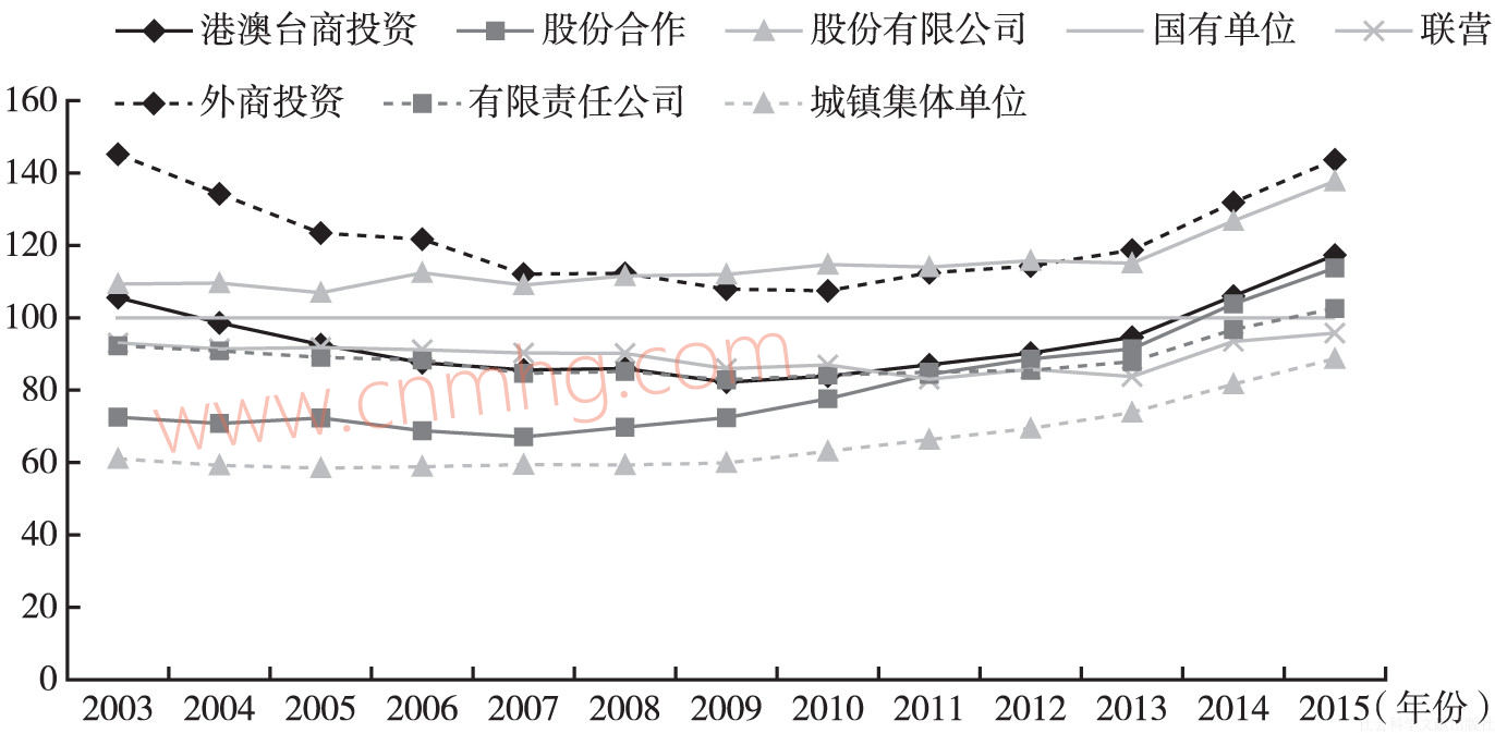 圖6-5 各種經(jīng)濟(jì)類(lèi)型城鎮(zhèn)單位平均工資相對(duì)變化趨勢(shì)(國(guó)有單位=100)