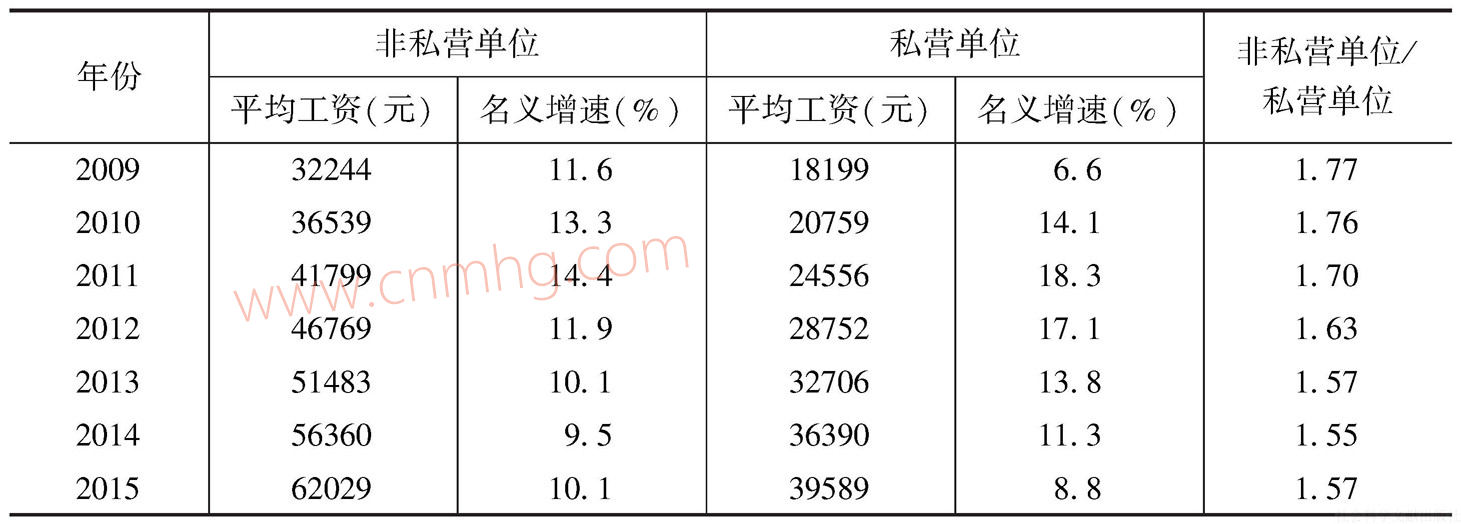 表6-8顯示了私營(yíng)單位與非私營(yíng)單位各年平均工資及其名義增速。可以看到,2015年私營(yíng)單位就業(yè)人員工資水平與非私營(yíng)單位仍有較大差距,二者絕對(duì)差距達(dá)到22440元,較上年的19970元擴(kuò)大了2470元。與此同時(shí),雖然近幾年私營(yíng)單位平均工資的增長(zhǎng)速度基本高于非私營(yíng)單位,二者間的相對(duì)差距呈縮小趨勢(shì),但受到工資政策的影響,2015年非私營(yíng)單位平均工資與私營(yíng)單位平均工資之比由上一年的1.55擴(kuò)大到1.57。