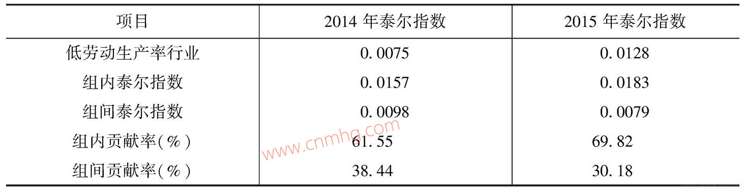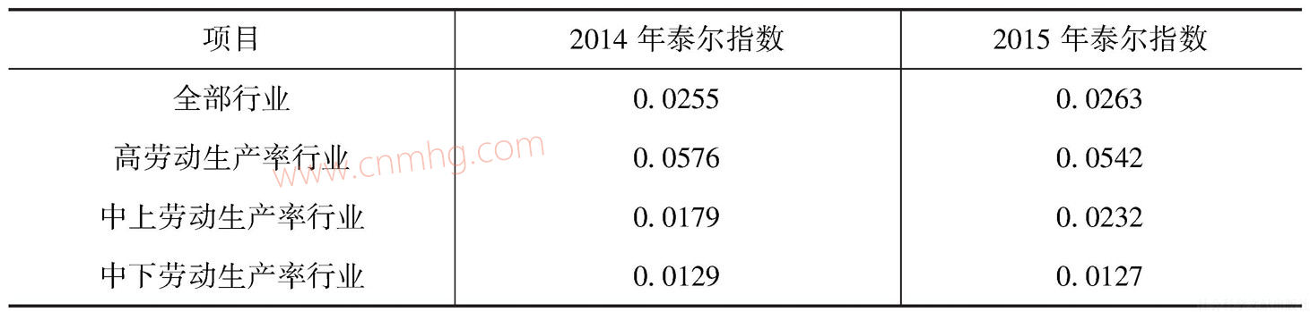 表6-17 不同勞動(dòng)生產(chǎn)率的行業(yè)門(mén)類(lèi)泰爾指數(shù)分解
