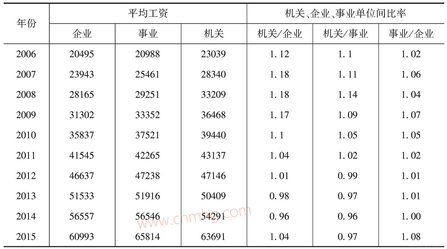 從表6-7中可以看出,企業(yè)、事業(yè)、機(jī)關(guān)單位的平均工資水平一直處于上升階段,總體相差不大,基本在全行業(yè)平均工資邊緣徘徊。從單位間比較來(lái)看,機(jī)關(guān)和事業(yè)單位的平均工資要高于企業(yè)的平均工資,而機(jī)關(guān)的平均工資又要高于事業(yè)單位的平均工資,但是這種趨勢(shì)隨著時(shí)間推移有所改變,表明單位之間的差距在不斷縮小,企業(yè)的平均工資個(gè)別年份甚至高于機(jī)關(guān)單位。2015年,機(jī)關(guān)、事業(yè)單位對(duì)企業(yè)的工資比率又有所上升,這是由于工資政策的改革,將機(jī)關(guān)事業(yè)單位納入養(yǎng)老保險(xiǎn)體系,個(gè)人繳納的有關(guān)費(fèi)用作為稅前工資組成部分納入了工資統(tǒng)計(jì),邊疆少數(shù)民族地區(qū)還增加了特殊津貼,使得機(jī)關(guān)事業(yè)單位的平均工資水平有所提高。