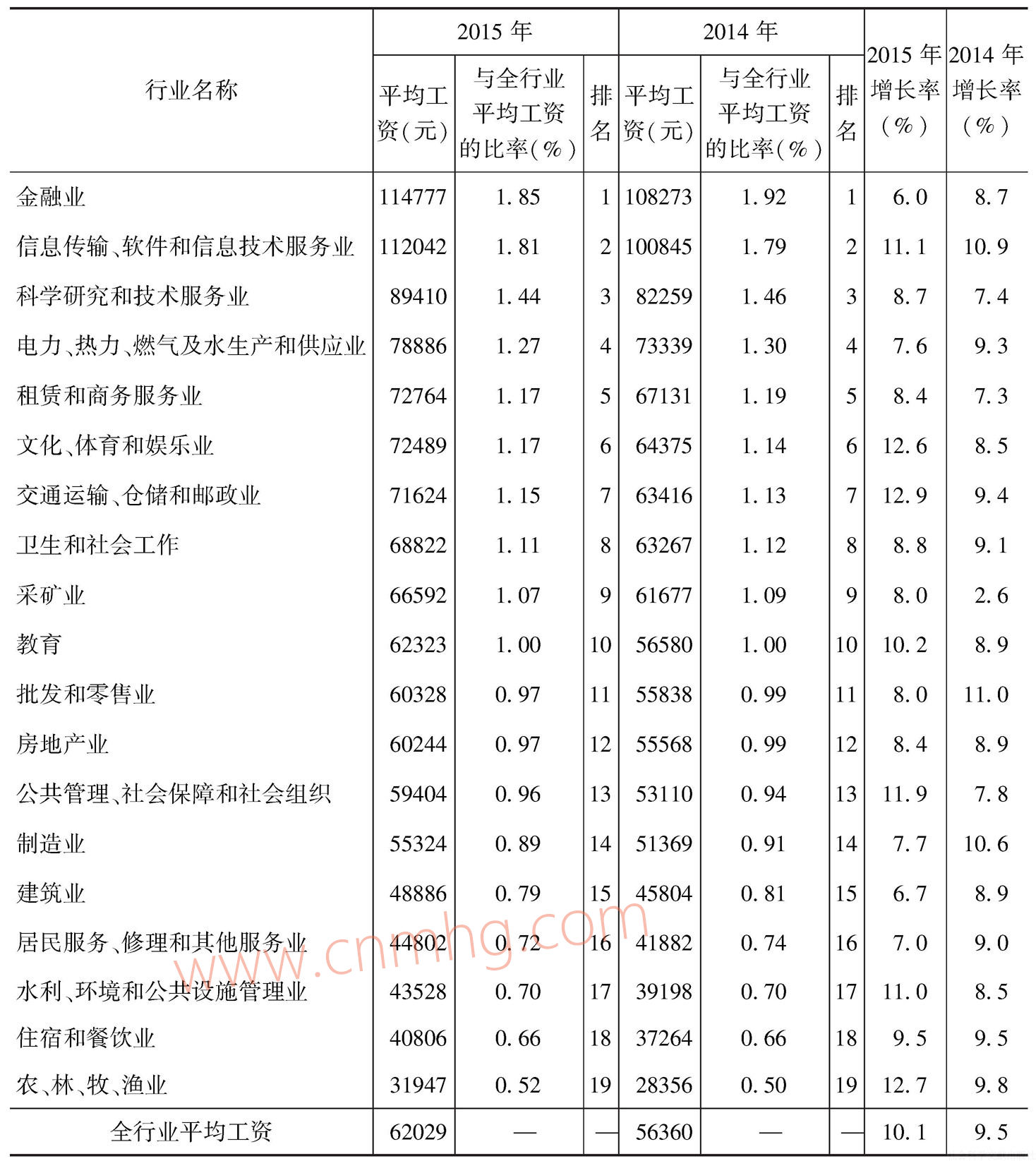 與2014年相比,2015年所有行業(yè)門(mén)類(lèi)排名情況沒(méi)有變化,金融業(yè)依然處于第一位,農(nóng)、林、牧、漁業(yè)處于最后一位,其他行業(yè)也處于與上年相同的位次。