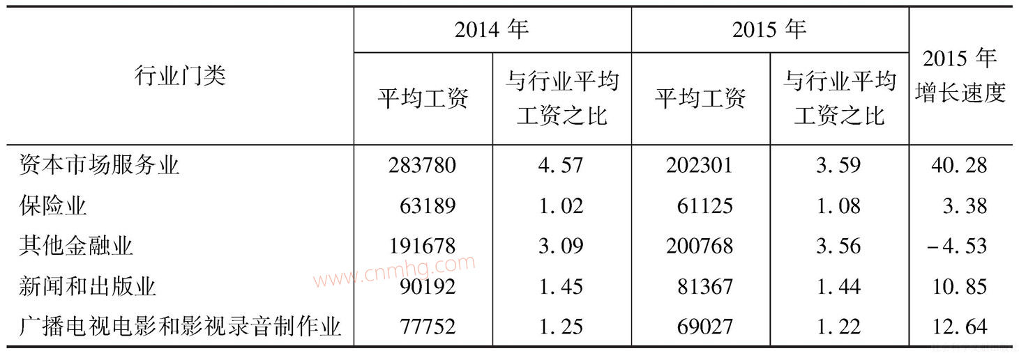 表6-2顯示了城鎮(zhèn)單位平均工資行業(yè)大類(lèi)排名的前十位。與2014年相比,2015年行業(yè)排名略有變化。資本市場(chǎng)服務(wù)和其他金融業(yè)仍然是工資水平最高的兩個(gè)行業(yè);排在三至六位的四個(gè)行業(yè)也沒(méi)有增減,只是其內(nèi)部排名有所變化,主要是互聯(lián)網(wǎng)和相關(guān)服務(wù)業(yè)從第六位上升至第三位,使得軟件和信息服務(wù)業(yè)、煙草制品業(yè)和貨幣金融服務(wù)各下降一位;排在第七至第九的行業(yè)排名也沒(méi)有變化,分別是航空運(yùn)輸業(yè)、研究和試驗(yàn)發(fā)展、管道運(yùn)輸業(yè);石油和天然氣開(kāi)采業(yè)跌出前十,新聞和出版業(yè)成為第十位。對(duì)這十個(gè)行業(yè)進(jìn)行整體觀察,其中屬于壟斷性行業(yè)的有資本市場(chǎng)服務(wù)業(yè)、其他金融業(yè)、煙草制品業(yè)、貨幣金融服務(wù)、航空運(yùn)輸業(yè)、管道運(yùn)輸業(yè),其余行業(yè)即互聯(lián)網(wǎng)和相關(guān)服務(wù)、軟件和信息技術(shù)服務(wù)業(yè)、研究和試驗(yàn)發(fā)展、新聞和出版業(yè),都對(duì)就業(yè)人員的受教育水平和專(zhuān)業(yè)水平有較高要求。由此可以看出,行業(yè)壟斷和人力資本是影響行業(yè)平均工資水平的重要因素。