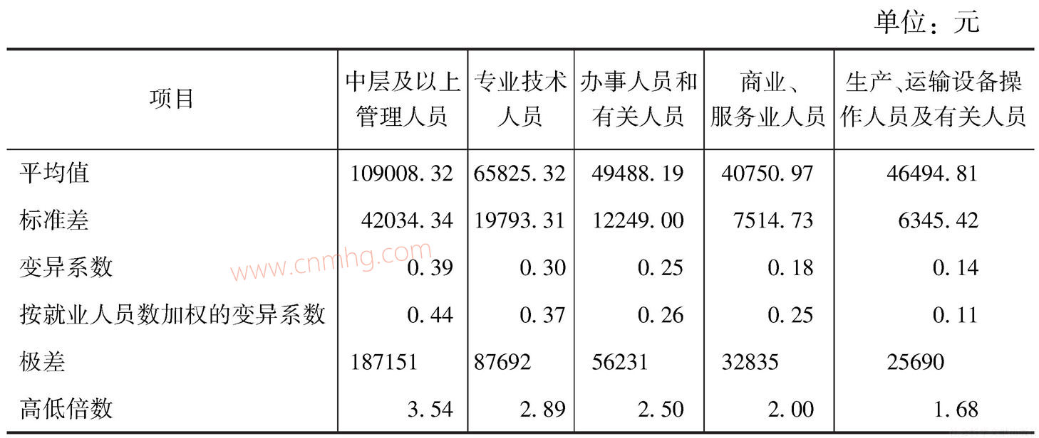 第一,不同崗位平均工資的行業(yè)差異具有工資越高、差距越大的特點(diǎn)。比如中層及以上管理人員在行業(yè)間的平均工資從7.6萬(wàn)元到21.9萬(wàn)元,相差2.89倍;而生產(chǎn)運(yùn)輸設(shè)備操作人員平均工資從3.4萬(wàn)元到7.3萬(wàn)元,工資倍數(shù)只有2.1倍?;谛袠I(yè)數(shù)據(jù)計(jì)算的差異程度及離散程度指標(biāo)(見(jiàn)表6-12),無(wú)論按高低倍數(shù)還是變異系數(shù)衡量,都顯示出統(tǒng)一的結(jié)果:中層及以上管理人員平均工資行業(yè)差距最大,專(zhuān)業(yè)技術(shù)人員次之,生產(chǎn)運(yùn)輸設(shè)備操作人員及有關(guān)人員的行業(yè)差距最小??梢耘袛?,崗位工資的行業(yè)差異一定程度上可能與人力資本積累、崗位競(jìng)爭(zhēng)程度、可替代性大小有關(guān)。
