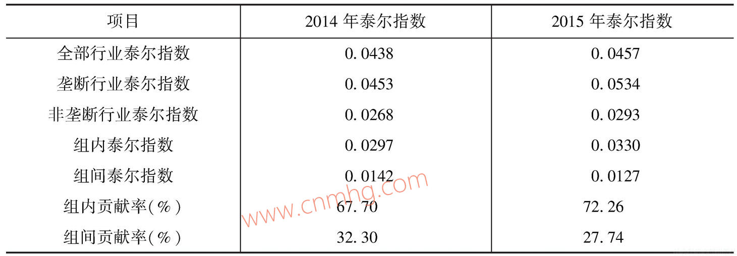 利用泰爾指數(shù)分解方法分析壟斷因素對(duì)行業(yè)間平均工資差距的影響,從表6-20可以看到:第一,壟斷因素對(duì)行業(yè)間工資差異的貢獻(xiàn)率在30%左右,雖然有所下降,但壟斷對(duì)于行業(yè)工資差異的影響依然比較顯著;第二,2015年的壟斷行業(yè)泰爾指數(shù)和非壟斷行業(yè)均高于2014年的泰爾指數(shù),說(shuō)明在行業(yè)內(nèi)部工資水平的差距擴(kuò)大;第三,2015年的組間貢獻(xiàn)率比2014年略有下降,說(shuō)明破除壟斷降低工資差異方面有一定成效,但還未取得實(shí)質(zhì)性進(jìn)展。